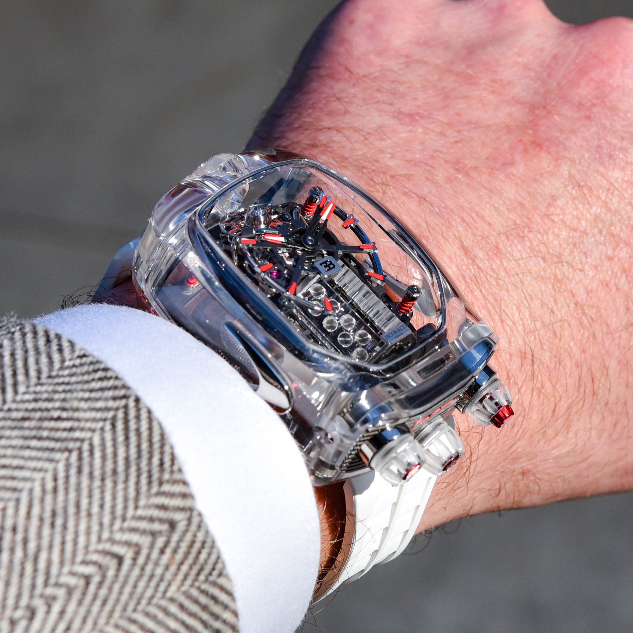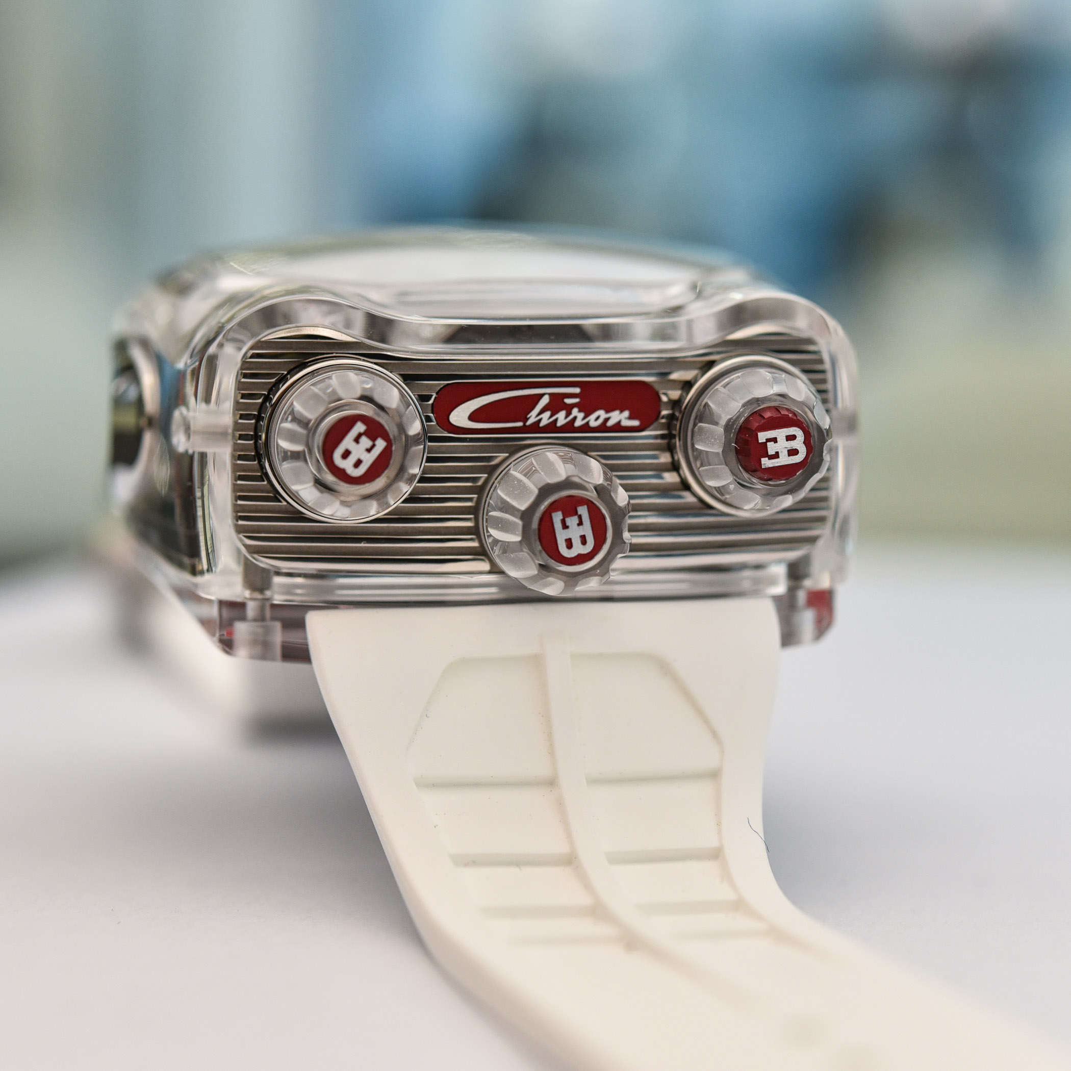 Since the release of the first Jacob & Co. Bugatti Chiron Tourbillon, some things have changed, most notably the case, of course. Now made in full sapphire crystal with anti-reflective coating, by the way, it measures a whopping 57.8mm in length, 44.4mm in width and 21.5mm in height. The case looks quite simple as it flows around the movement, but the shape is extremely delicate to machine. Spending a bit of time with it, there are curves and lines all over, and of course, the signature Bugatti horseshoe-shaped grille at noon upping the challenge.