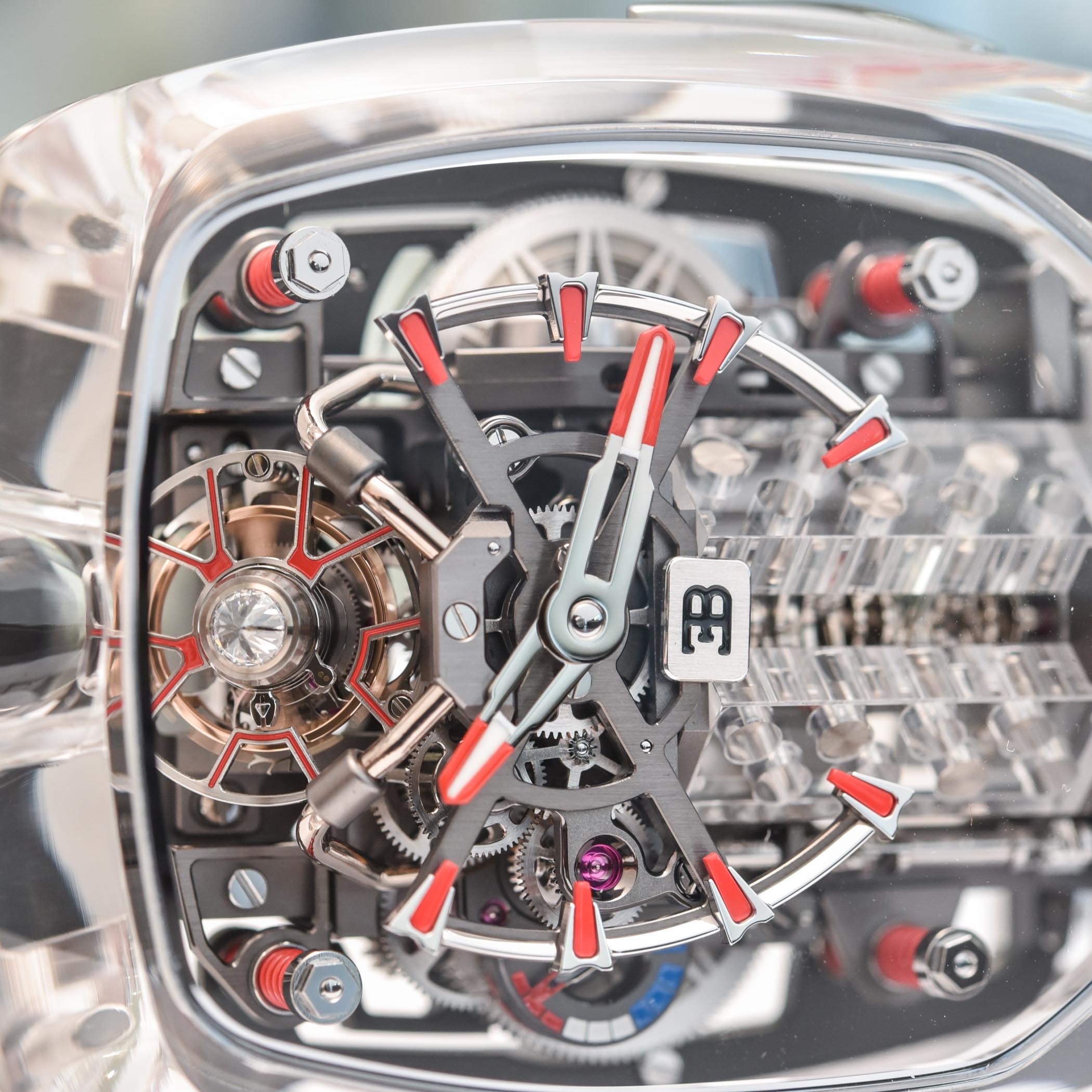 While previously it lacked any form of a dial, this version has a suspended hour ring to help read the time a little easier. Some elements of the watch, like the hour indices, shock-absorbers and tourbillon cage, have been given a touch of red, matching the red details on the outside of the case. The power reserve indicator shows the French national colours (Bugatti is located in Molsheim, France) on the left-hand side.