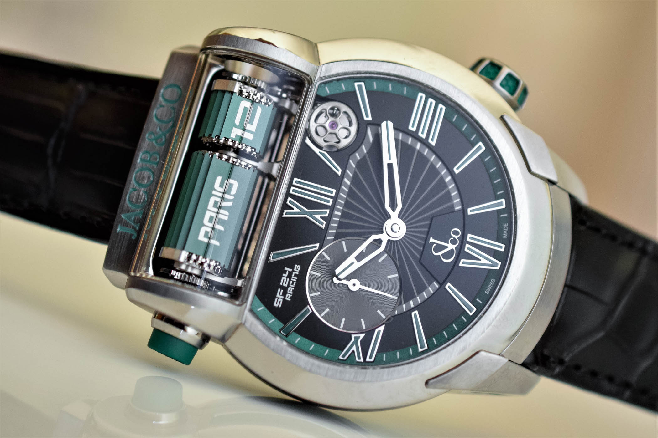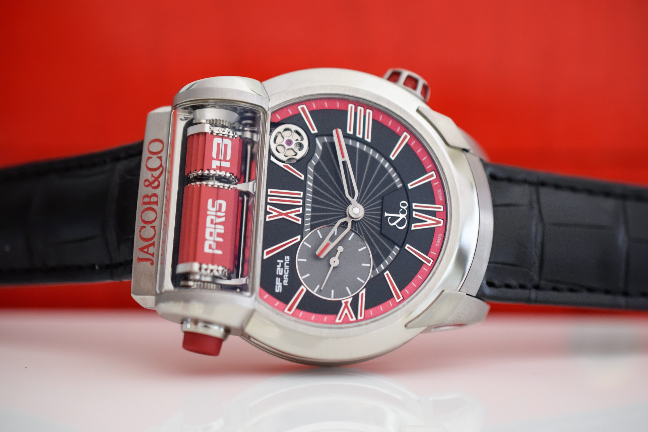 From a technical perspective, the SF24 is much more complicated than it might appear. The innovative movement is a world-first developed with master watchmaker Luca Soprana and patented by Jacob & Co. Overall, the movement comprises no fewer than 473 components and needed 18 months to be fully developed. It had to address several technically complicated challenges, in particular, the miniaturisation of the split flaps mechanism and its integration into a watch movement.