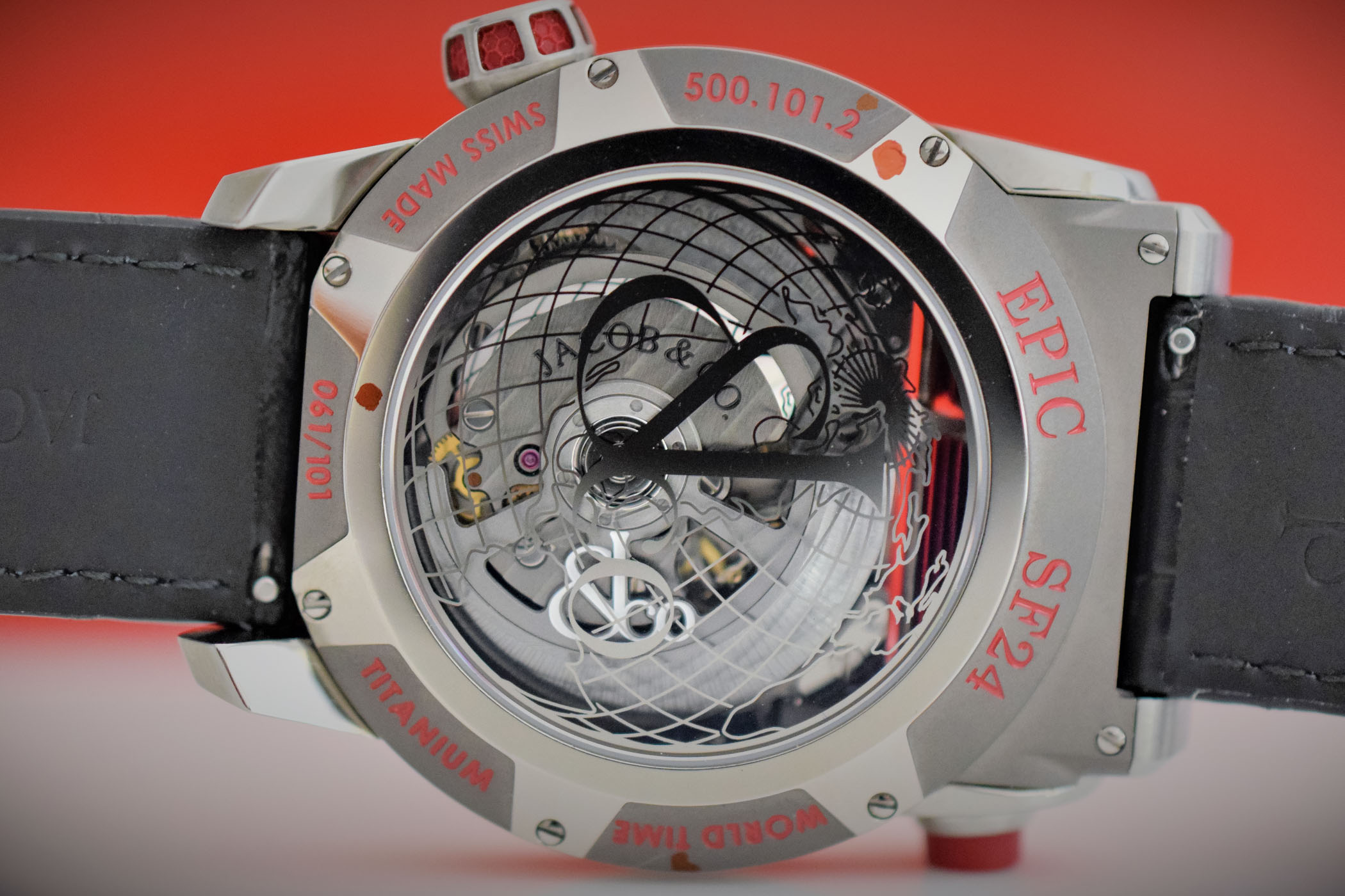 On the backside, the see-through caseback features a metalised Jacob and Co. décor paired with a latitude/longitude pattern. While the view on the automatic movement is slightly obstructed, its reflections are really eye-catching. The movement is decorated with Geneva stripes and perlage and the screw heads are polished. The rotor is skeletonised and features a Jacob and Co. logo.