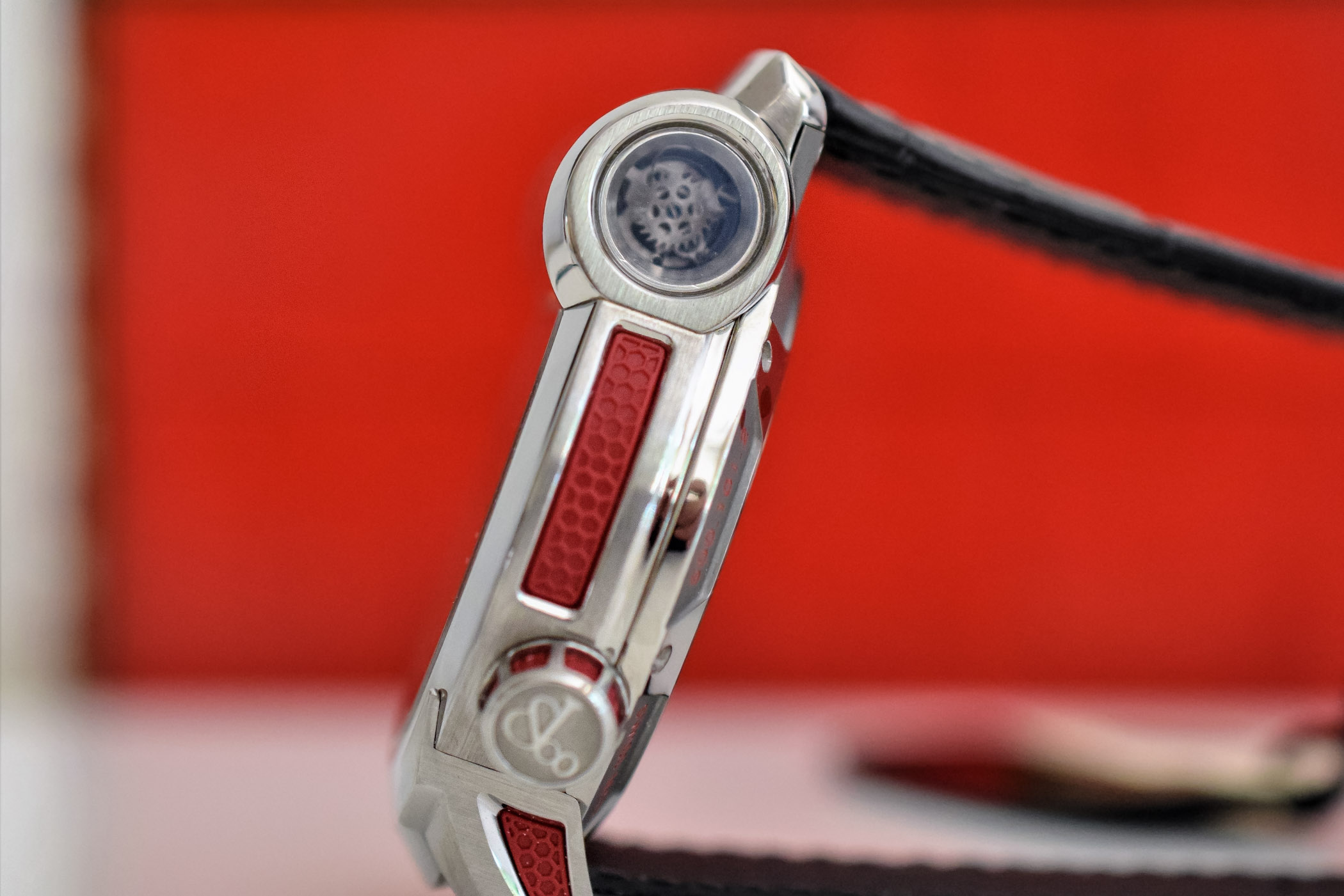 The construction is technically complex, with several shaped sapphire crystals. All of them feature double-sided anti-reflective coating for optimal legibility. There is also a side window on the cylinder providing a cool view of the racks driving the flaps.