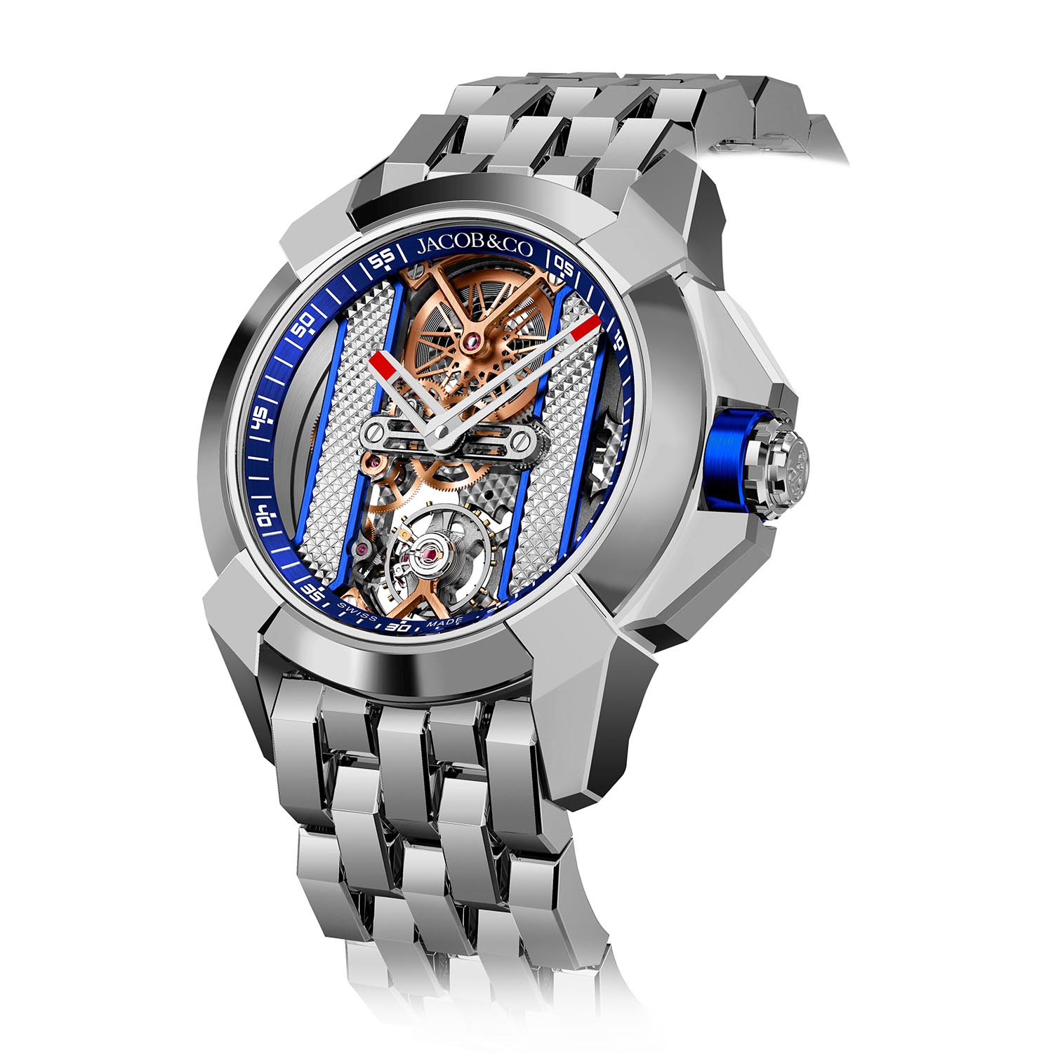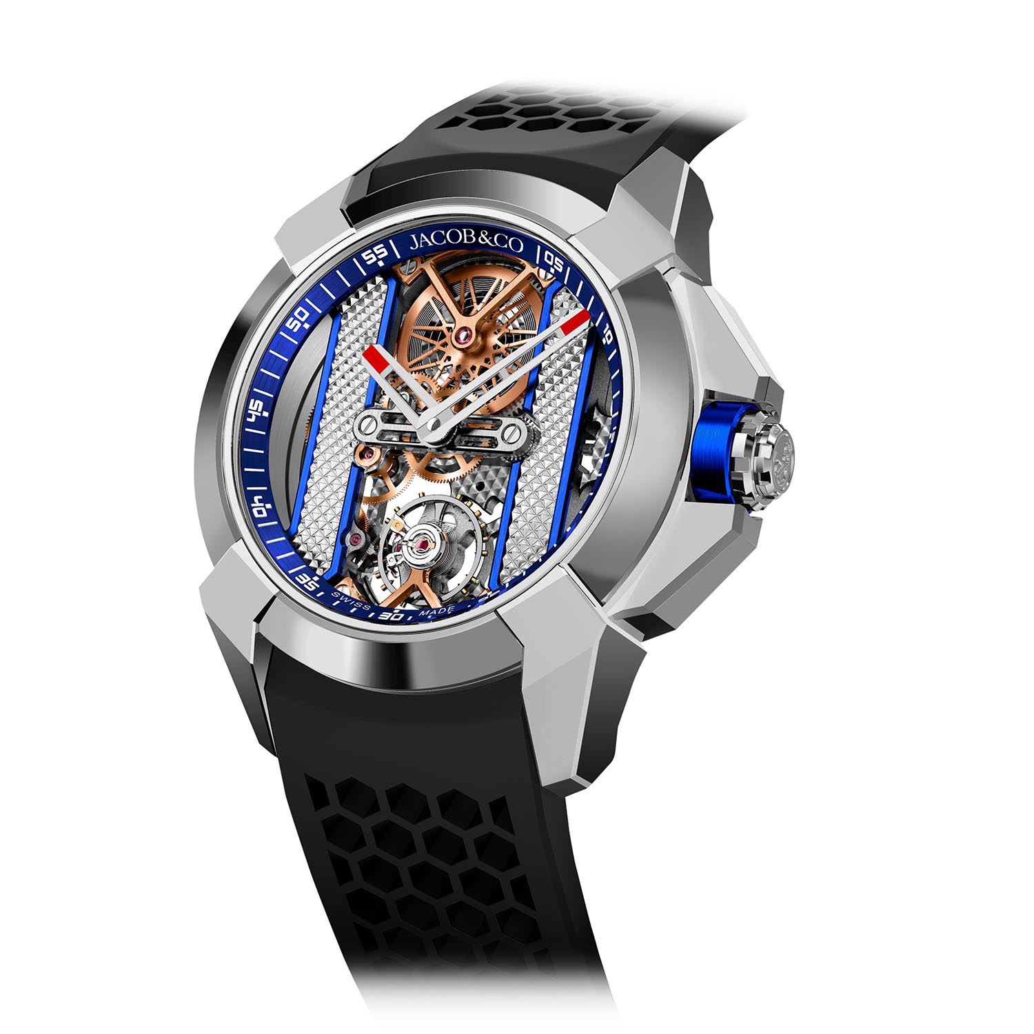 The new Jacob & Co. Epic X will be available in a variety of editions, with a wide range of materials, colours and gem-setting interpretations. For now, the brand presents a steel case with blue aluminium parts on a steel bracelet or black rubber strap, a rose gold case with green aluminium parts on a rose gold bracelet or black rubber strap, and a black DLC case with black details on a rubber strap. The price will start at USD 26,000. For more details, please visit jacobandco.com.