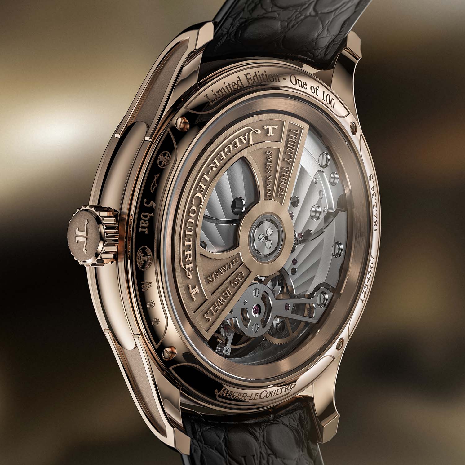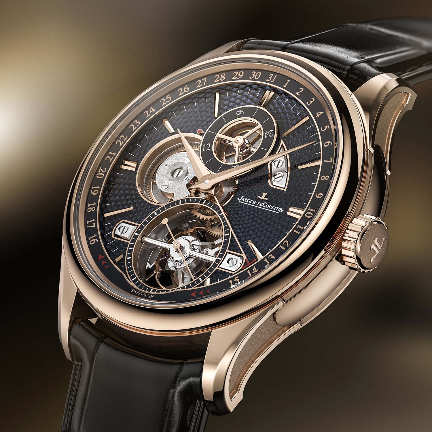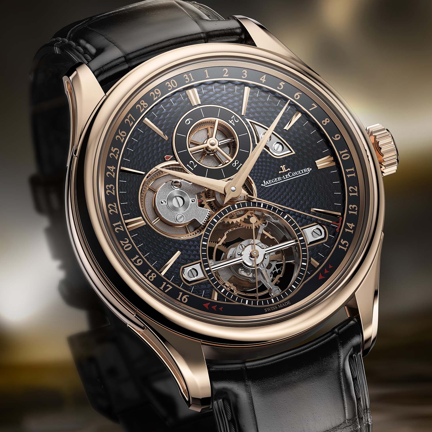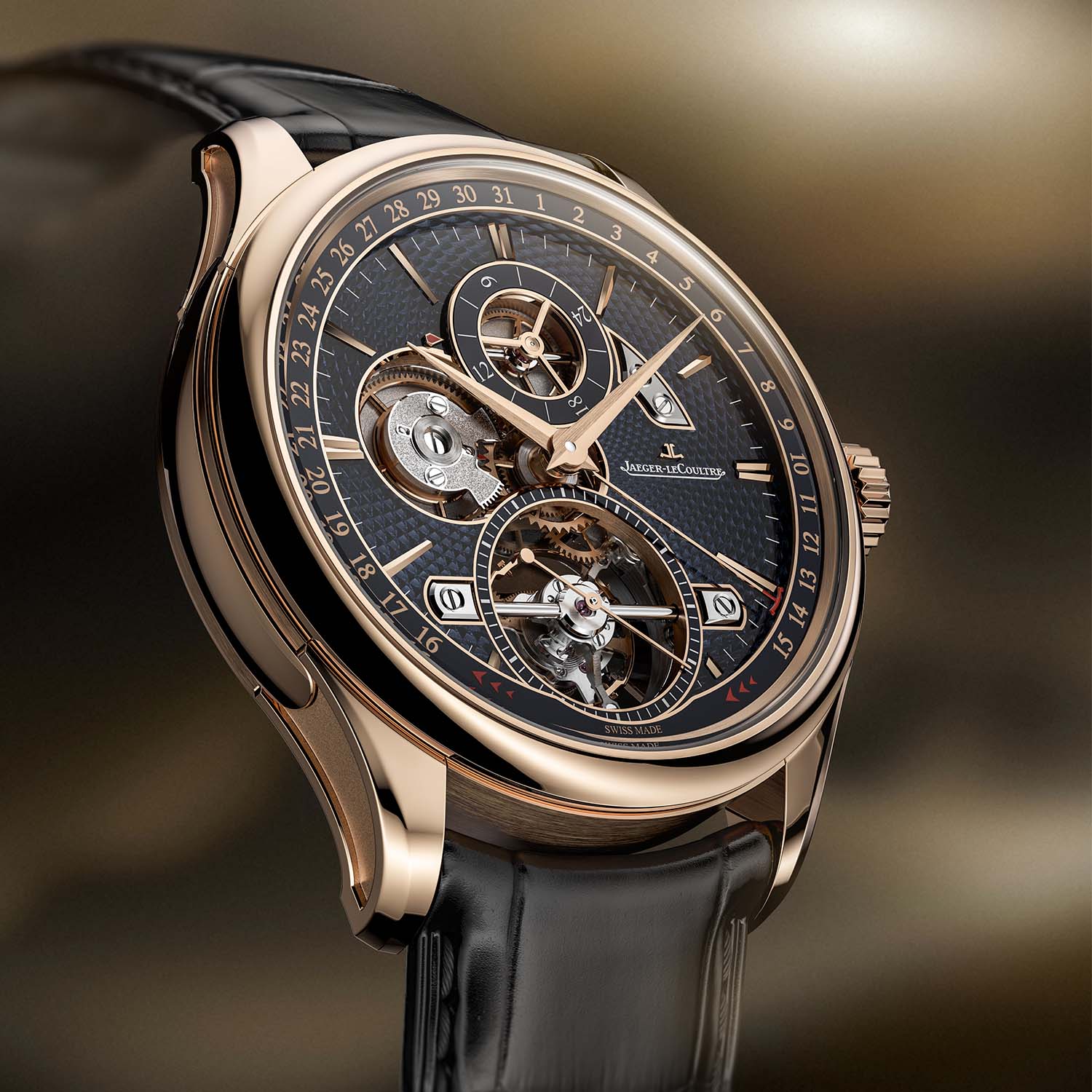 The movement is integrated into a Grande Tradition-style 42mm x 12.5mm pink gold case with polished, brushed, and microblasted surfaces. The watch is paired with a classic black alligator strap and a pink gold folding buckle. A limited edition of 100 pieces; price to be confirmed. More information at jaeger-lecoultre.com.