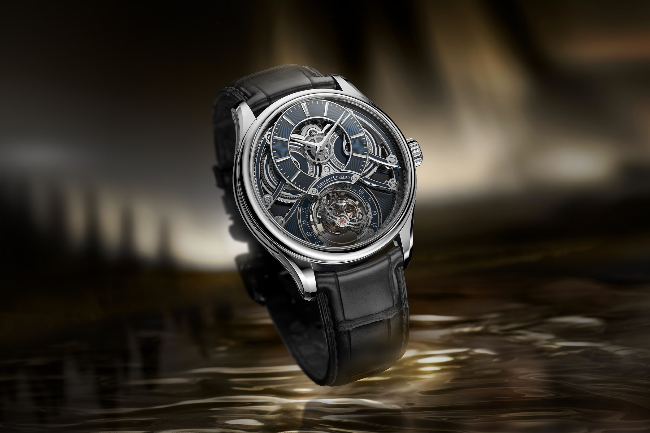 The watch is paired with a blue alligator leather strap and a white gold adjustable folding buckle. Price to be confirmed. More information at jaeger-lecoultre.