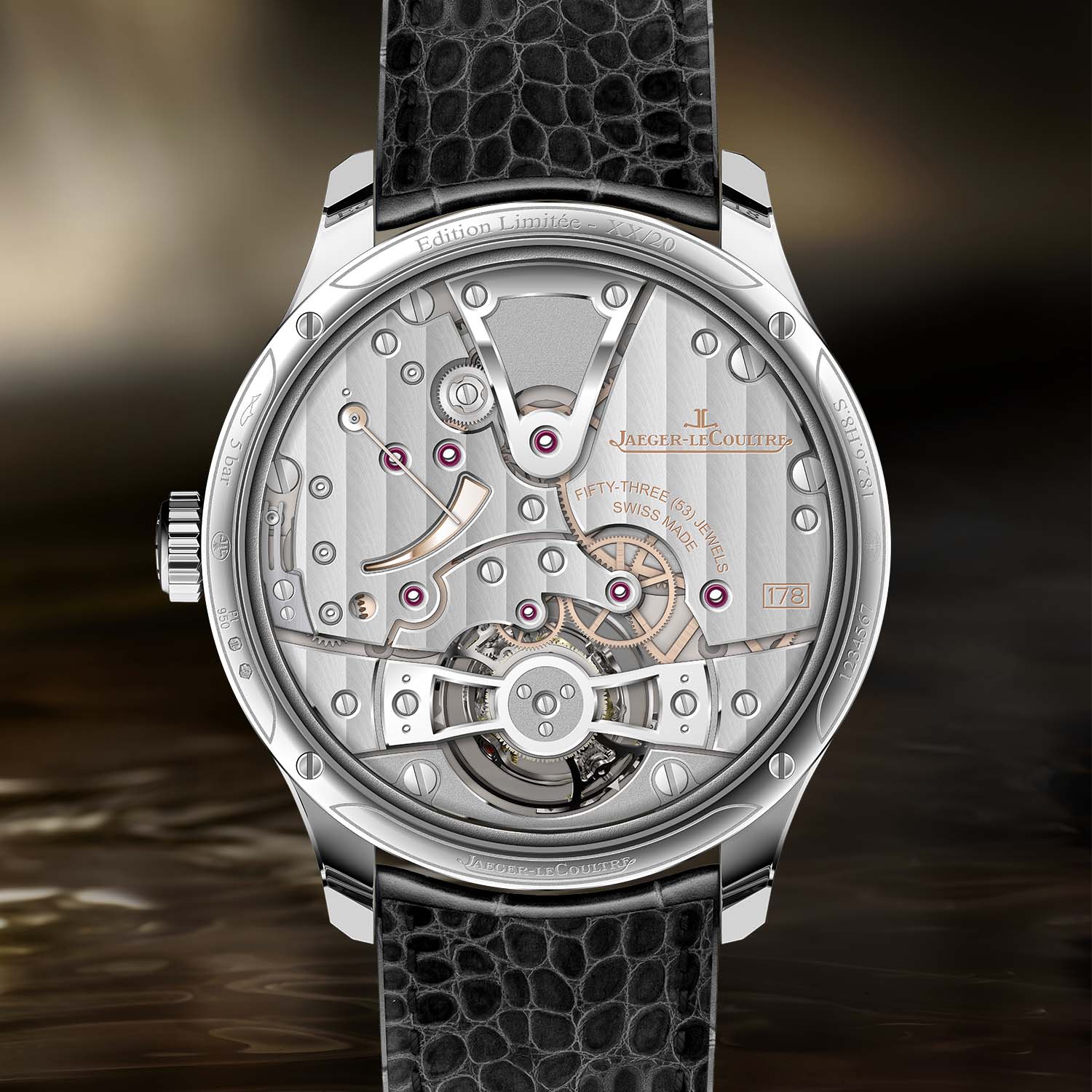 Calibre 178 is decorated with no fewer than 16 different finishes, applied to the barrel covers, plates and bridges. The movement also features 55 hand-bevelled components, 64 inner angles and 33 solid gold components. Inspired by the tourbillon bridge of Jaeger’s 1946 pocket watch tourbillon, a highly polished openworked steel bridge over the regulator can be admired through the caseback, surrounded by white gold bridges decorated with traditional Côtes de Genève. A gold power-reserve indicator on the back completes the picture, tracking the manually wound movement’s 72-hour autonomy.