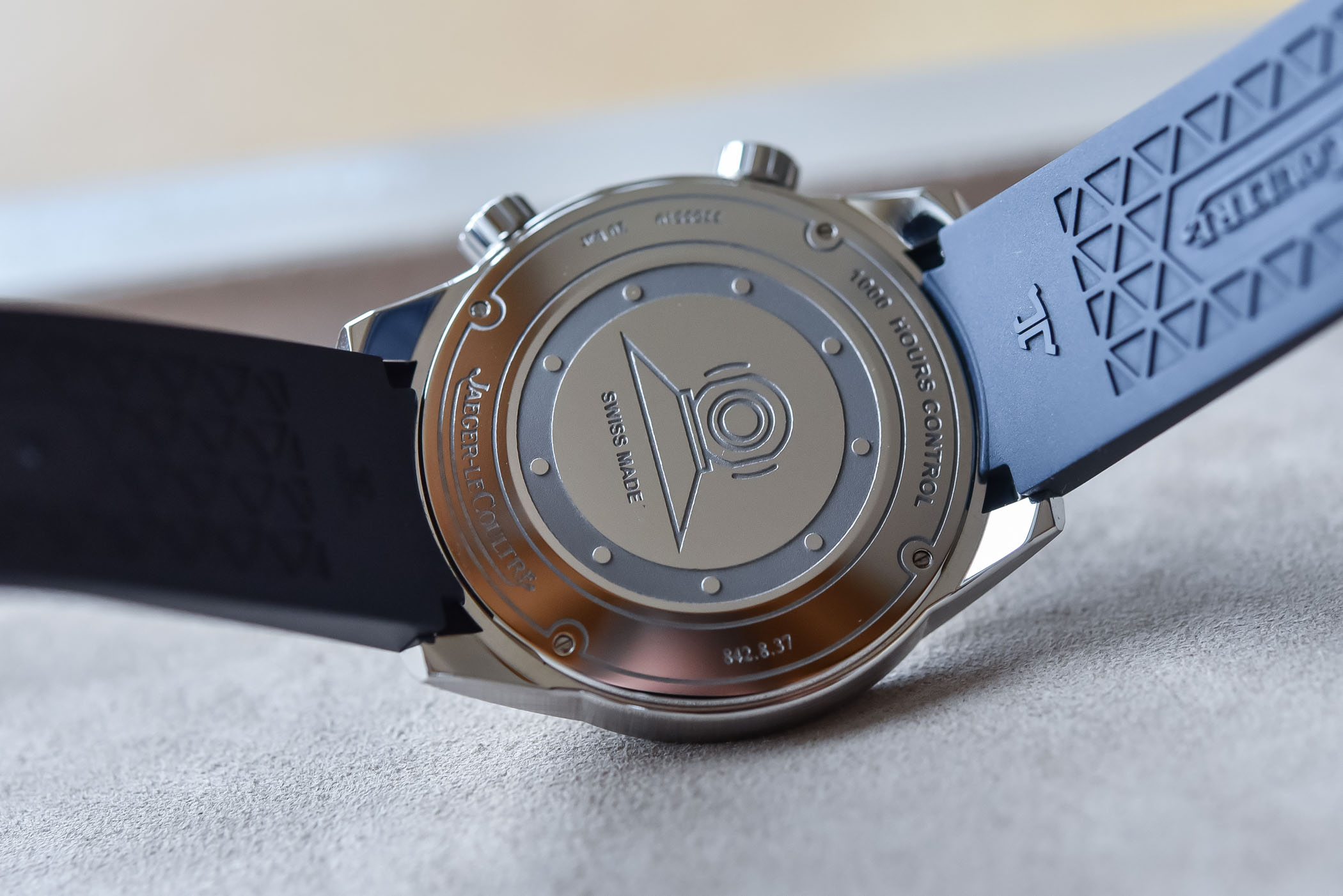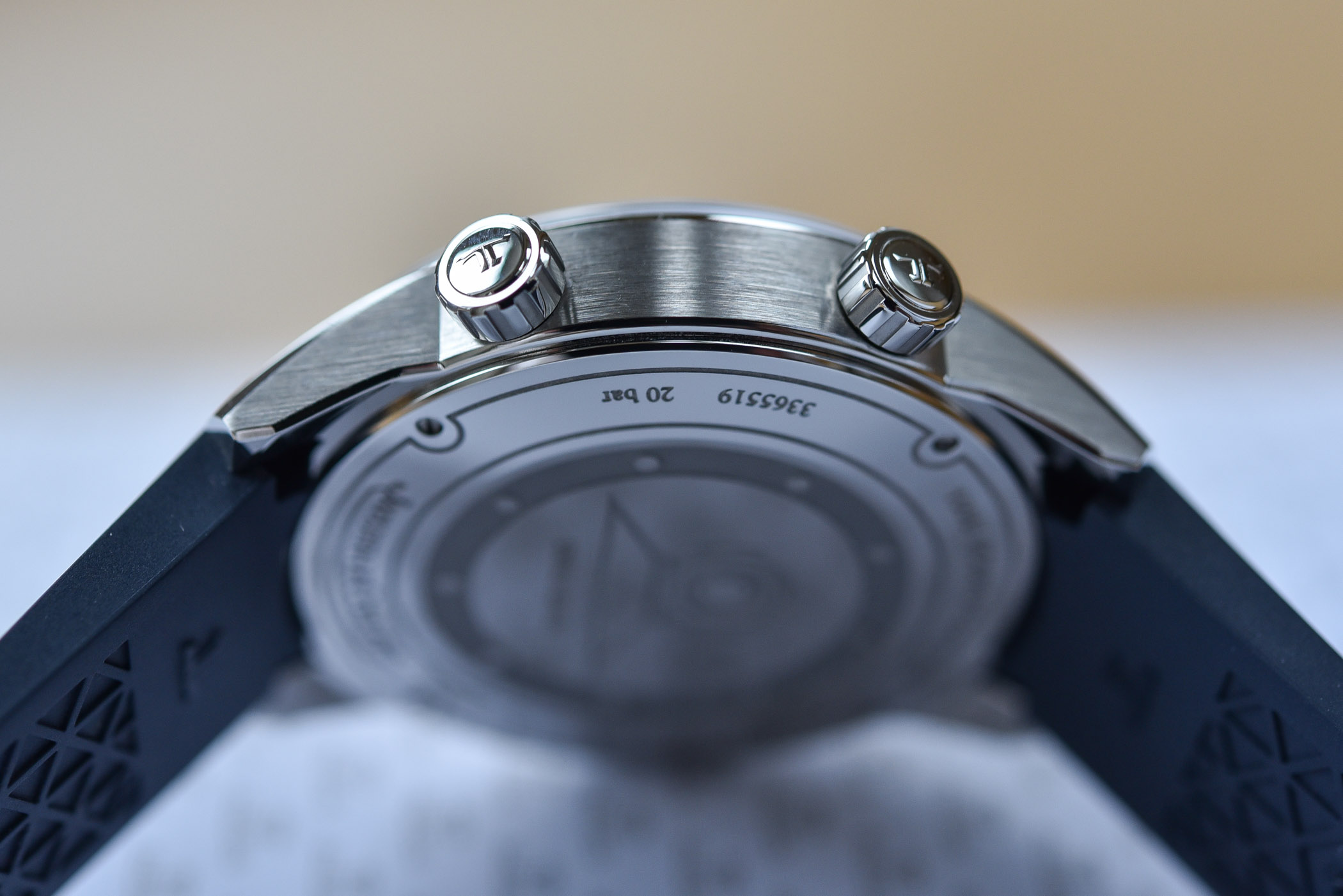 The case of the Polaris Date measures 42mm in diameter, meaning that it’s on the large side for a JLC, with a 13mm thickness. Clearly, it has some presence and feels more modern and sportier than the cream indexes would let you think. Yet, the rubber strap is supple and the lugs well curved, allowing for a watch that is both well proportioned and balanced on the wrist. The case is water-resistant to 200m, has a plain steel back with a diving motif and the signature double-crown for the bezel and the movement.