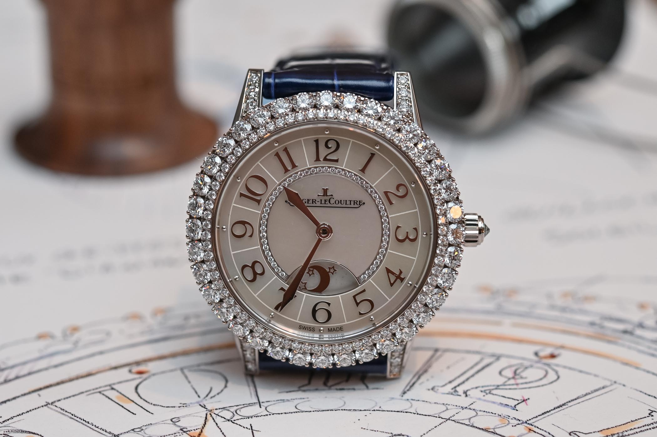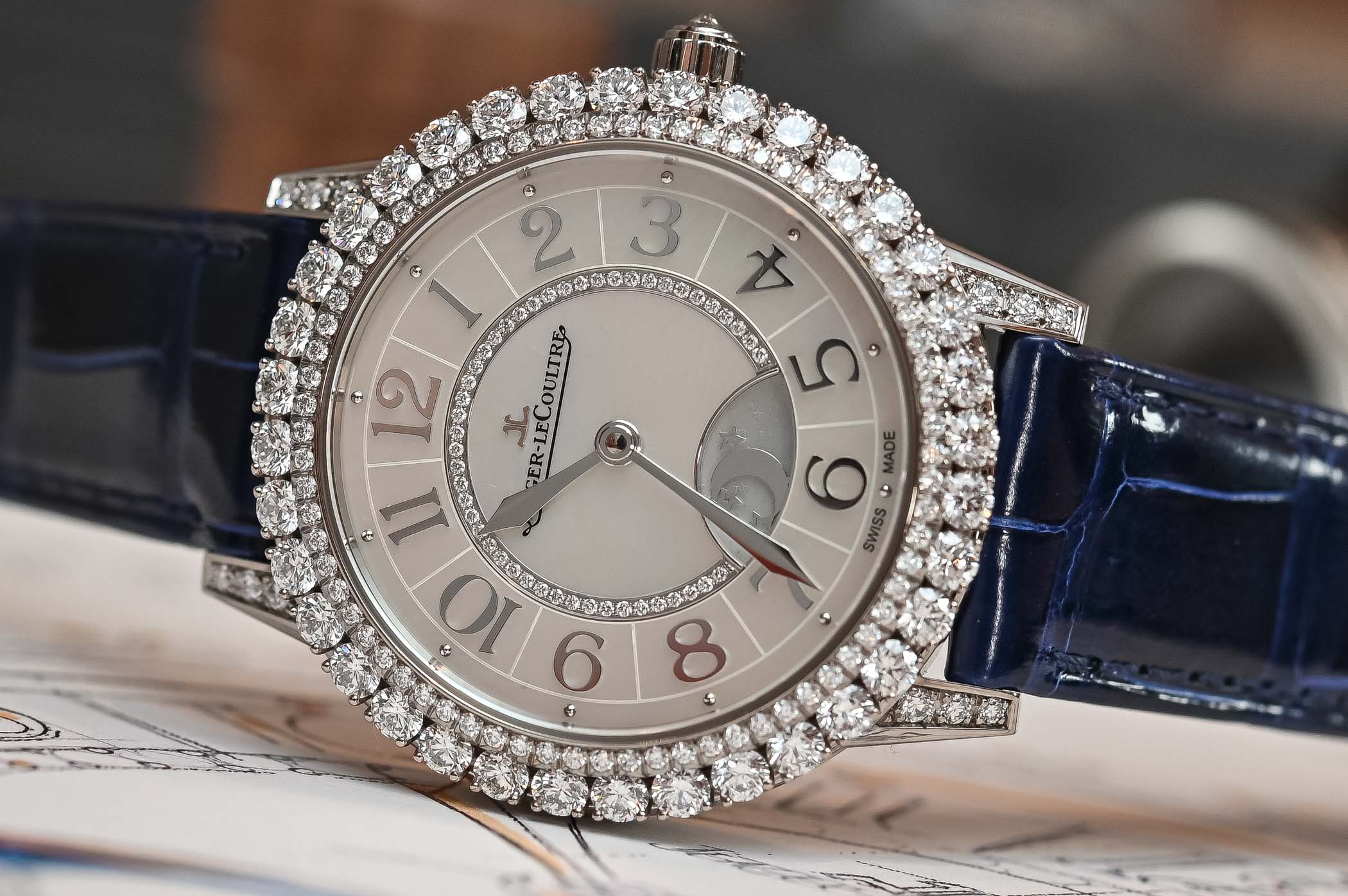 Night and day on a jewel encrusted high end JL? I suppose it offers more interest than a monthly moonphase…and I love the aperture and inner disc graphics. The dial is nearly perfect and the hands complete this royal marriage. I am usually not a big fan of diamonds but the boldness here works well. Very successful watch.