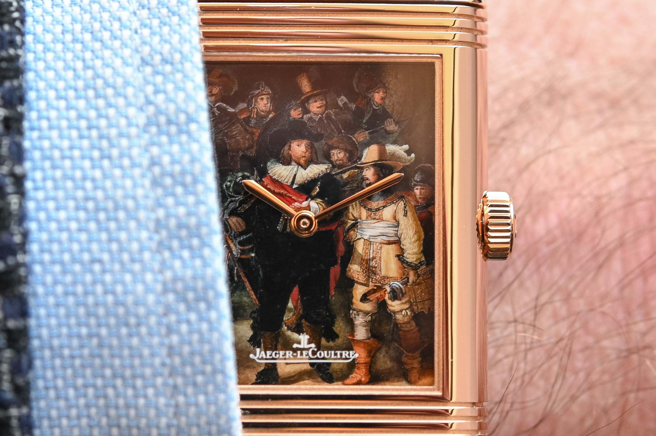 The painting has been reproduced on this Jaeger-LeCoultre Reverso Tribute to Rembrandt thanks to micro-painting and enamelling techniques. Jaeger-LeCoultre is one of the few manufactures to still have such expertise in-house, thanks to its the Atelier Métiers Rares® (Rare Handcrafts), a special department that can operate enamelling, hand-engraving, guillochage, and gem-setting.
