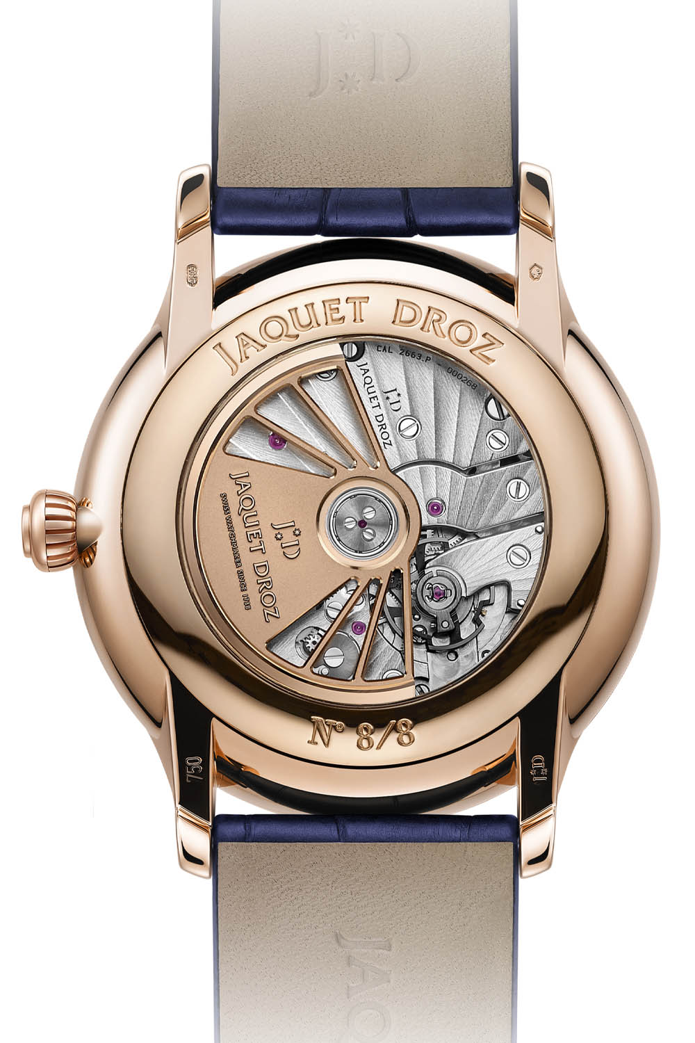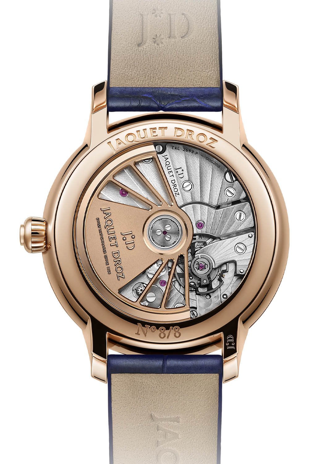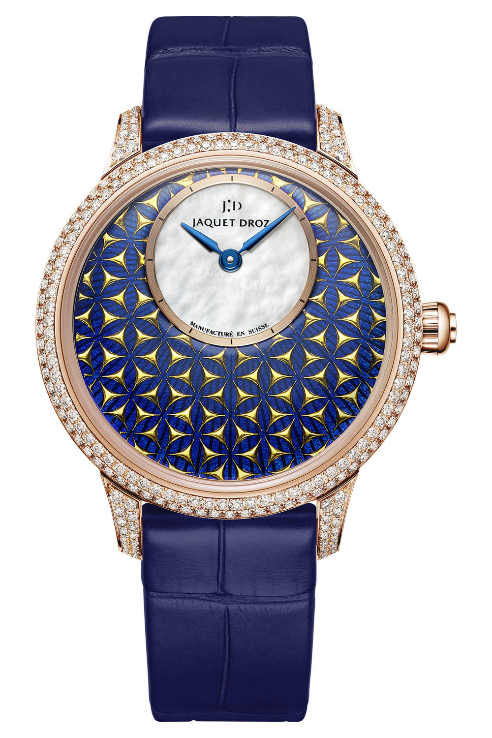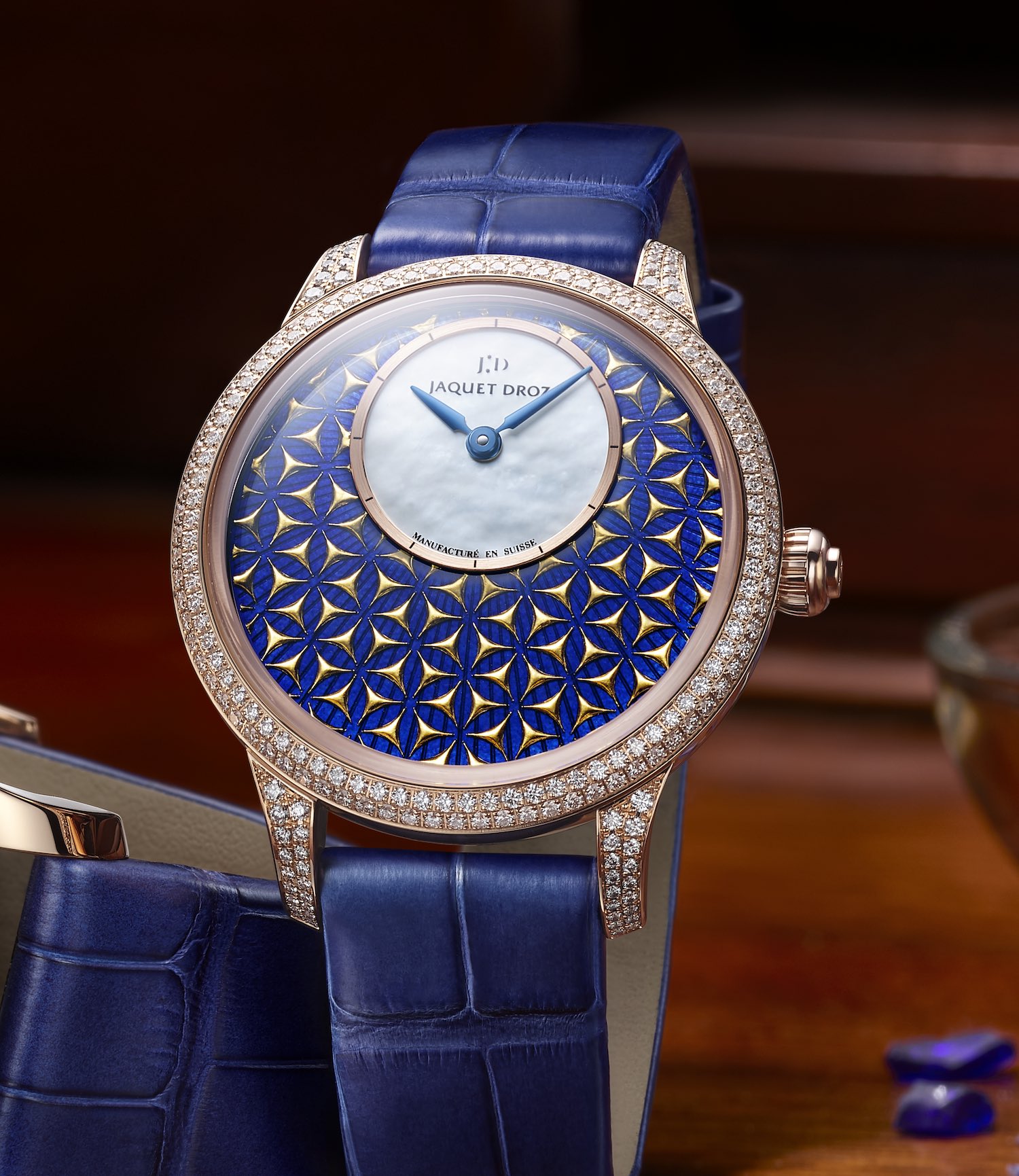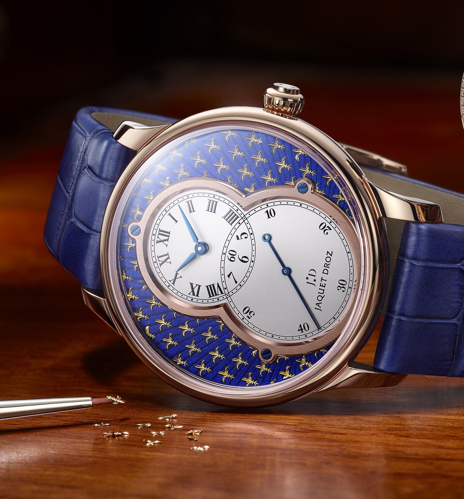 The exquisite shimmering art of paillonné enamelling encapsulated for eternity on the dials of two classic Jaquet Droz models.