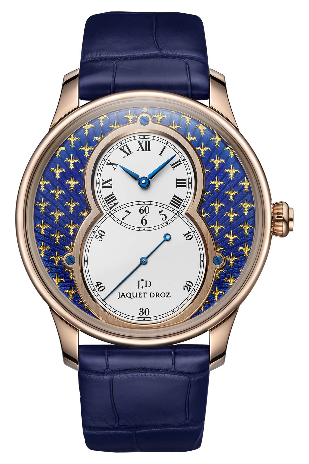 The cornerstone collection at Jaquet Droz, the Grande Seconde gets the royal treatment in this stunning 18k red gold Grand Feu blue enamel and paillonné model decorated with a fleur de lys motif. Characterised by the elegant figure-eight design of this collection, the top dial displays the hours and minutes with Roman numerals while the lower and larger dial at the bottom is dedicated to the (large) seconds. The hallmark off-centred display is set against a silver opaline dial and applied to the dial in a gold frame. The case measures 43mm and is attached to the wrist with a handmade blue alligator strap and an 18k red gold ardillon buckle. A sapphire crystal caseback reveals the automatic movement with its 18k red gold oscillating weight and elegant finishes.