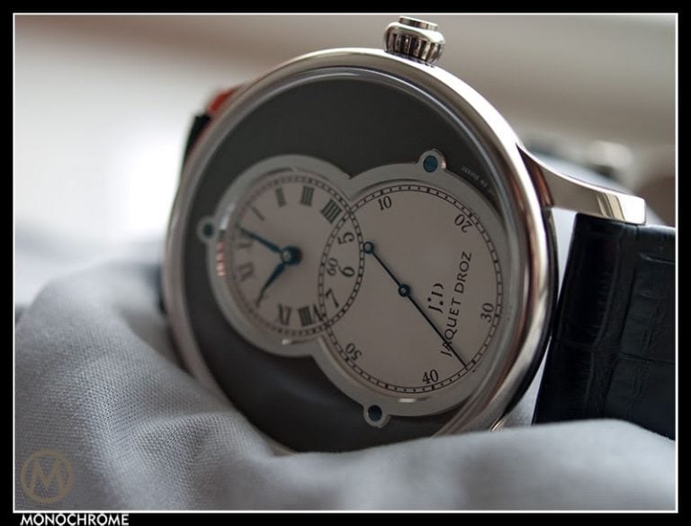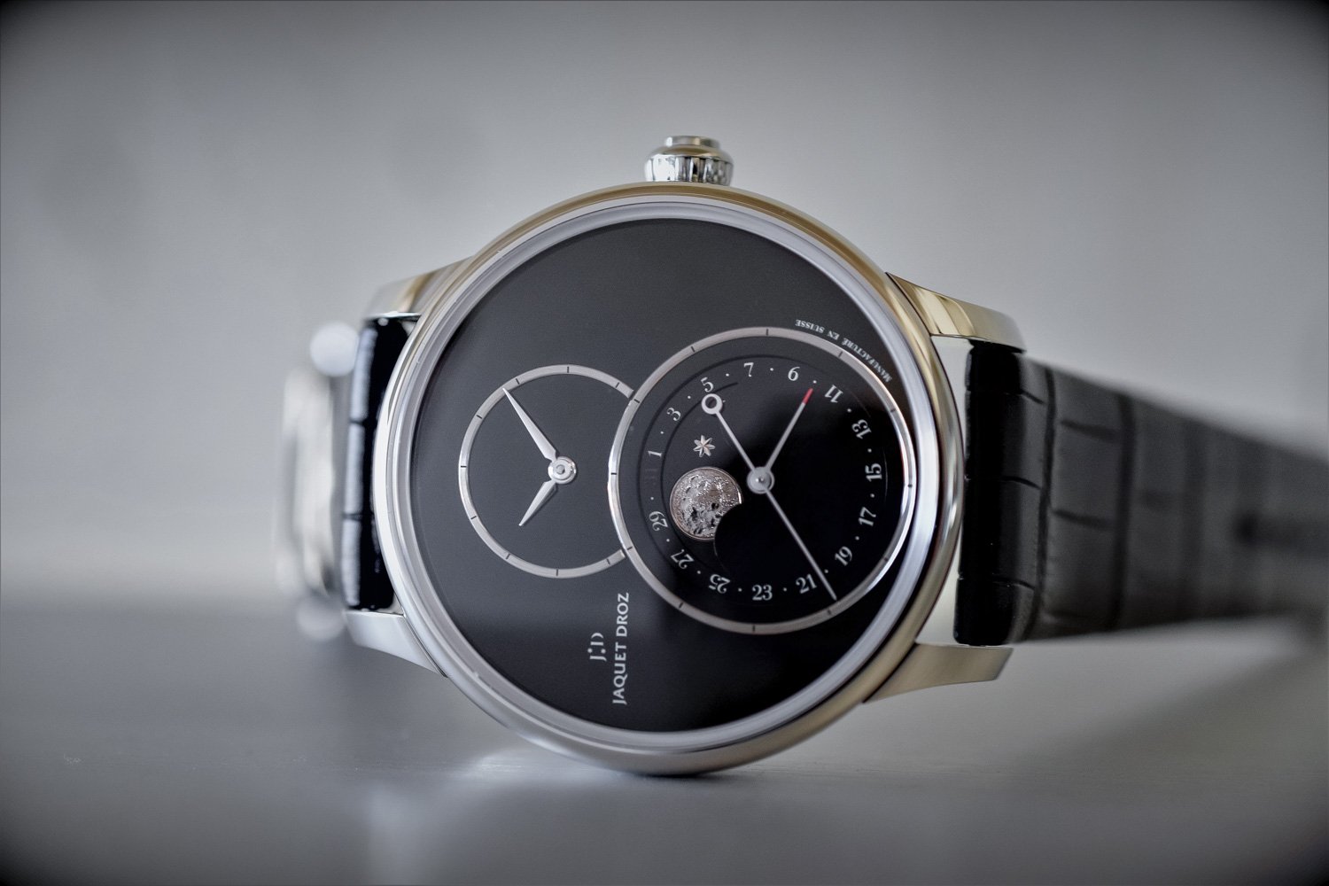 - A stainless steel version with black Onyx dial, with applied metallic rings around the dials, a black moon disc and the same finely engraved moon. Secured by a black strap and a folding clasp – Boutique Exclusive version (Only at official Jaquet Droz boutiques and Tourbillon boutiques) – CHF 17,850