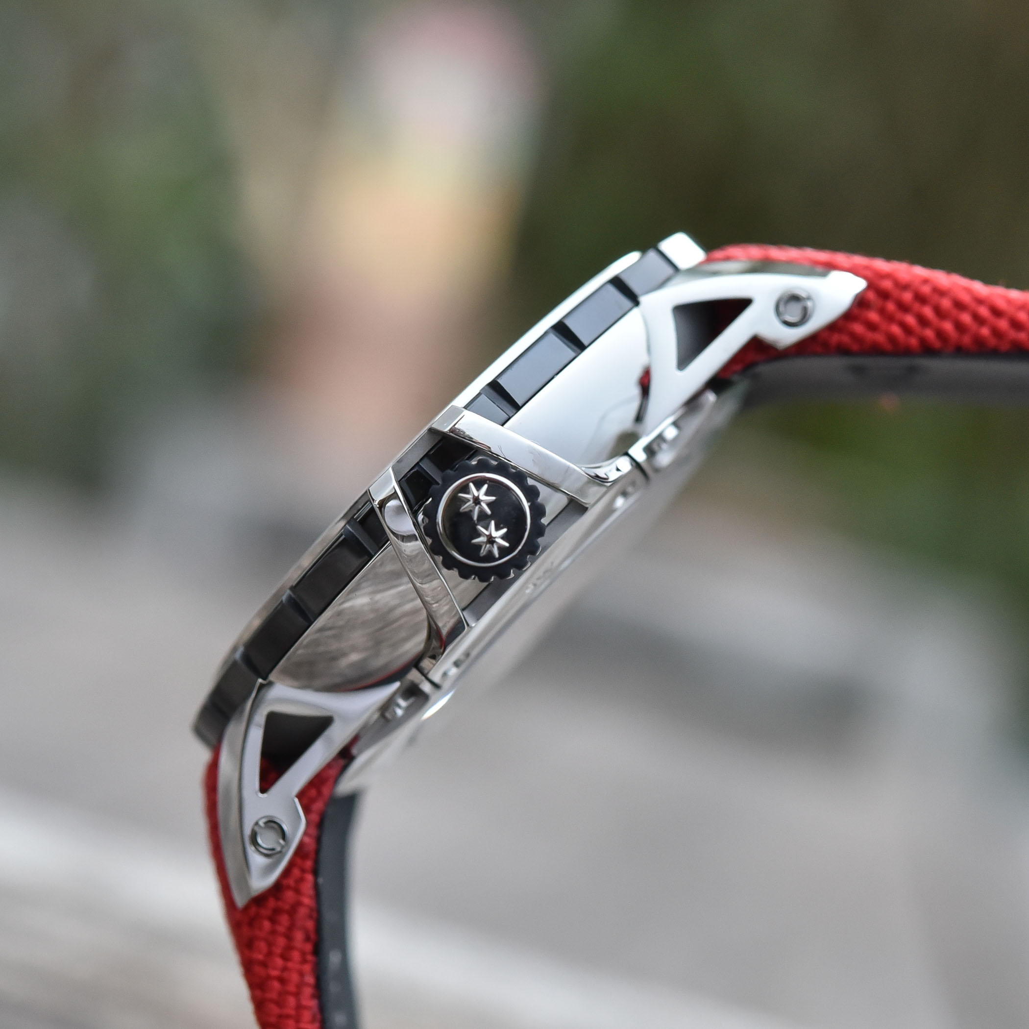 The formidable stainless steel case size, measuring 45mm in diameter with a height of 11.93mm, is somewhat attenuated by the incorporation of a black ceramic bezel. As with other SW models, the notches on the bezel are pronounced, and the crown guards (claws) on the right are echoed on the opposite of the case giving the watch its distinctive, symmetrical profile. Other distinguishing features of the SW are the hollowed triangular lugs and the way the imposing claws reach all the way from the bezel to the caseback, where they are secured with two screws.