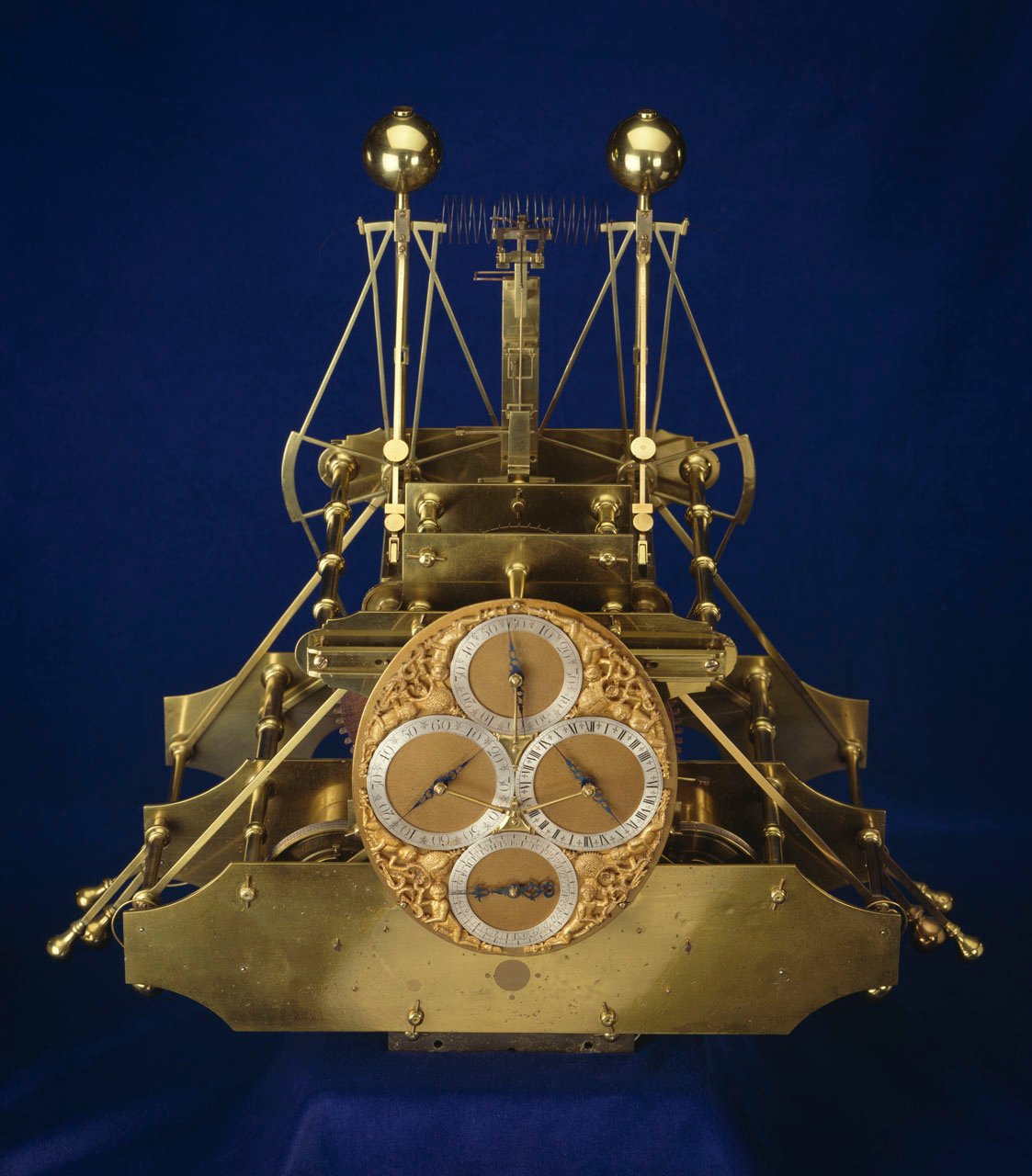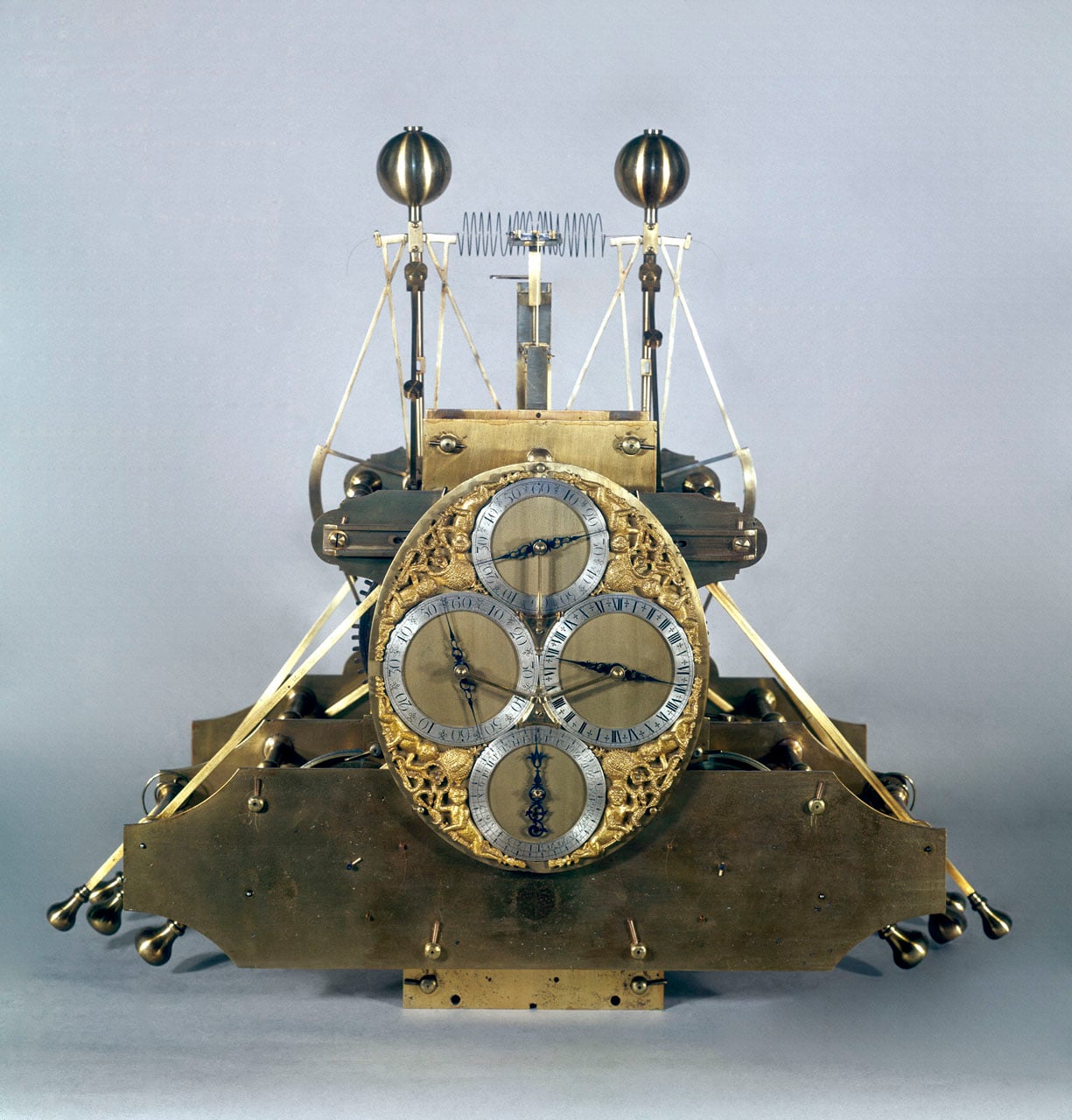 The distinctive design of H1 featured two prominent, bow-shaped pendulum structures at one end, each fitted with weighted spheres at both the top and bottom, and a clock face on the opposite end displaying hours, minutes, seconds, and the day of the month. Situated between these elements was a radically different horological mechanism, a framework of horizontal shafts and vertical plates, housing an array of wooden and brass gears, rollers, levers, springs and weighted arms.