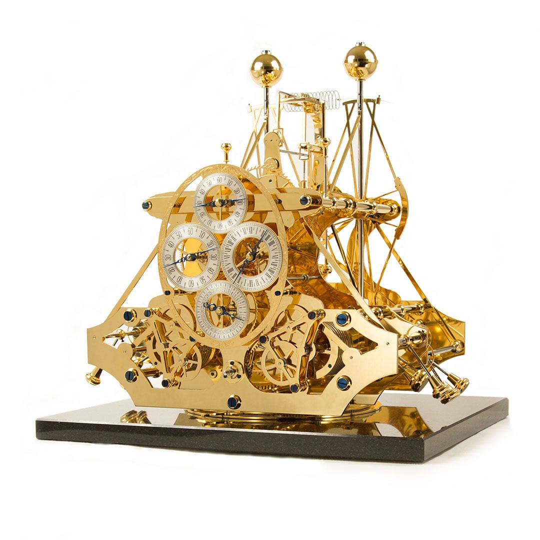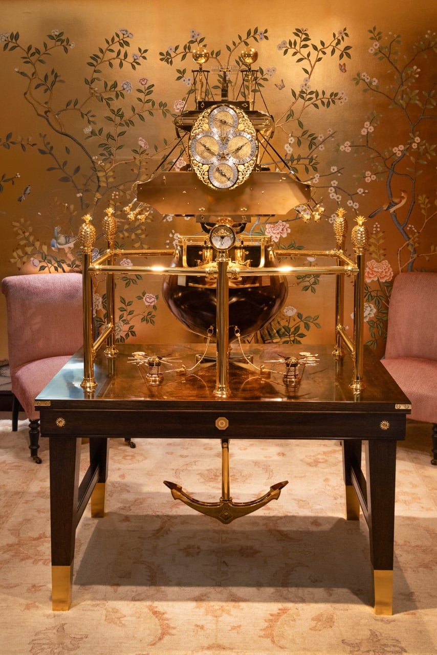 The Pragnell Bray Origins Clock is daunting in its size, mounted on a wooden hull modelled after HMS Centurion (the ship on which it sailed as part of the test) itself mounted on a table with an anchor pendulum that rocks the clock. The sight of the Origins clock at Pragnell’s Stratford-upon-Avon store is astonishing. The finish and detail are beyond reproach and hard to take in against the sheer presence of what was the most radical machine ever conceived in human history. It will star at a gala in Goldsmiths’ Hall to mark the 350th anniversary of the Royal Observatory, its permanent home not being settled yet. Pragnell have said that a limited number of commissions will be considered – I rather hope that an Atman, Heung or Musk would recognise the genius of the shy, if slightly grumpy, Yorkshireman whose conception it was.
