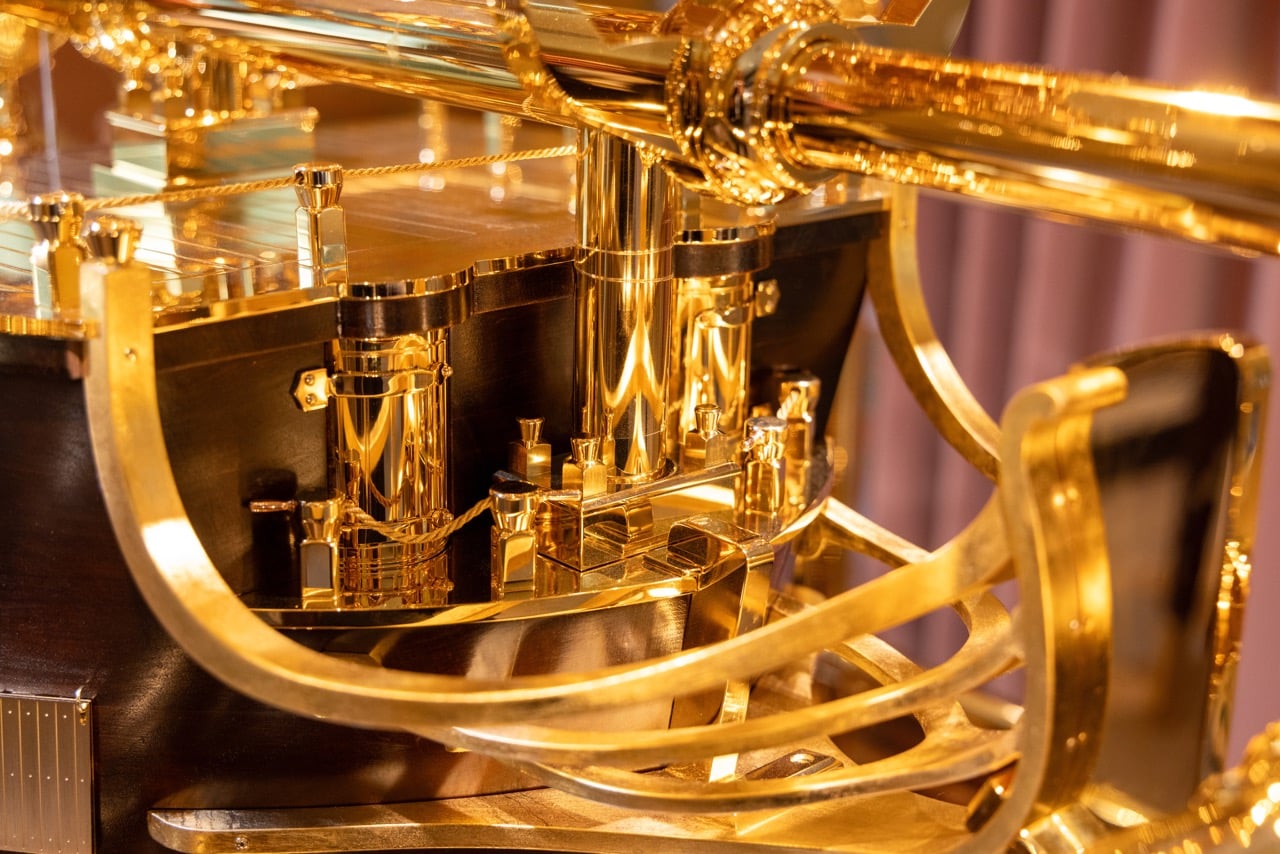 The Pragnell Bray Origins Clock is daunting in its size, mounted on a wooden hull modelled after HMS Centurion (the ship on which it sailed as part of the test) itself mounted on a table with an anchor pendulum that rocks the clock. The sight of the Origins clock at Pragnell’s Stratford-upon-Avon store is astonishing. The finish and detail are beyond reproach and hard to take in against the sheer presence of what was the most radical machine ever conceived in human history. It will star at a gala in Goldsmiths’ Hall to mark the 350th anniversary of the Royal Observatory, its permanent home not being settled yet. Pragnell have said that a limited number of commissions will be considered – I rather hope that an Atman, Heung or Musk would recognise the genius of the shy, if slightly grumpy, Yorkshireman whose conception it was.