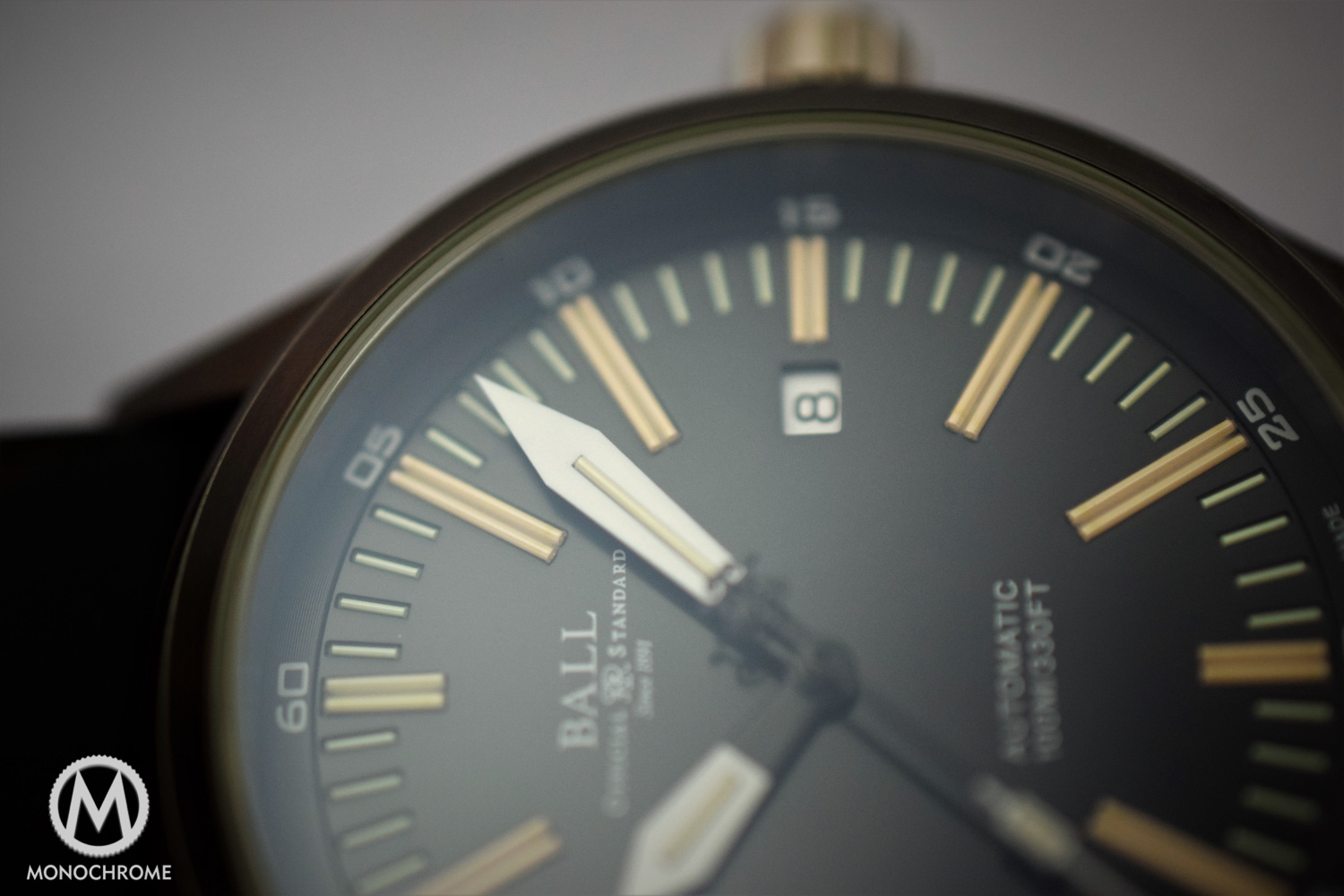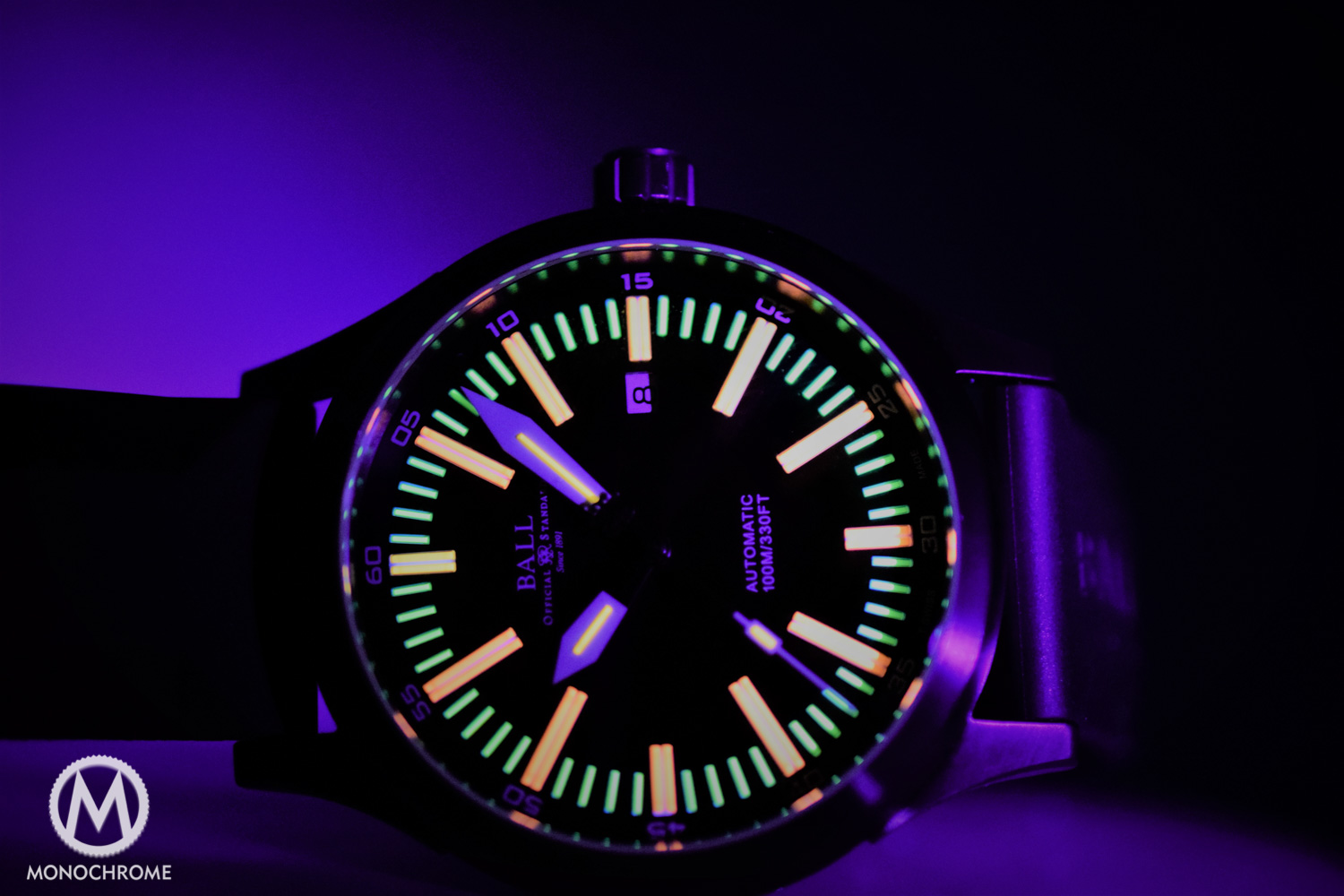 One of the main attractions of the watch is its black lacquered dial and large sword-shaped hands that feature 75 micro gas tubes that light up in three different colours. These GTLS markers have become a Ball hallmark and are indeed unique. They create three-dimensional depth and the way they light up the dial in the dark is impressive.