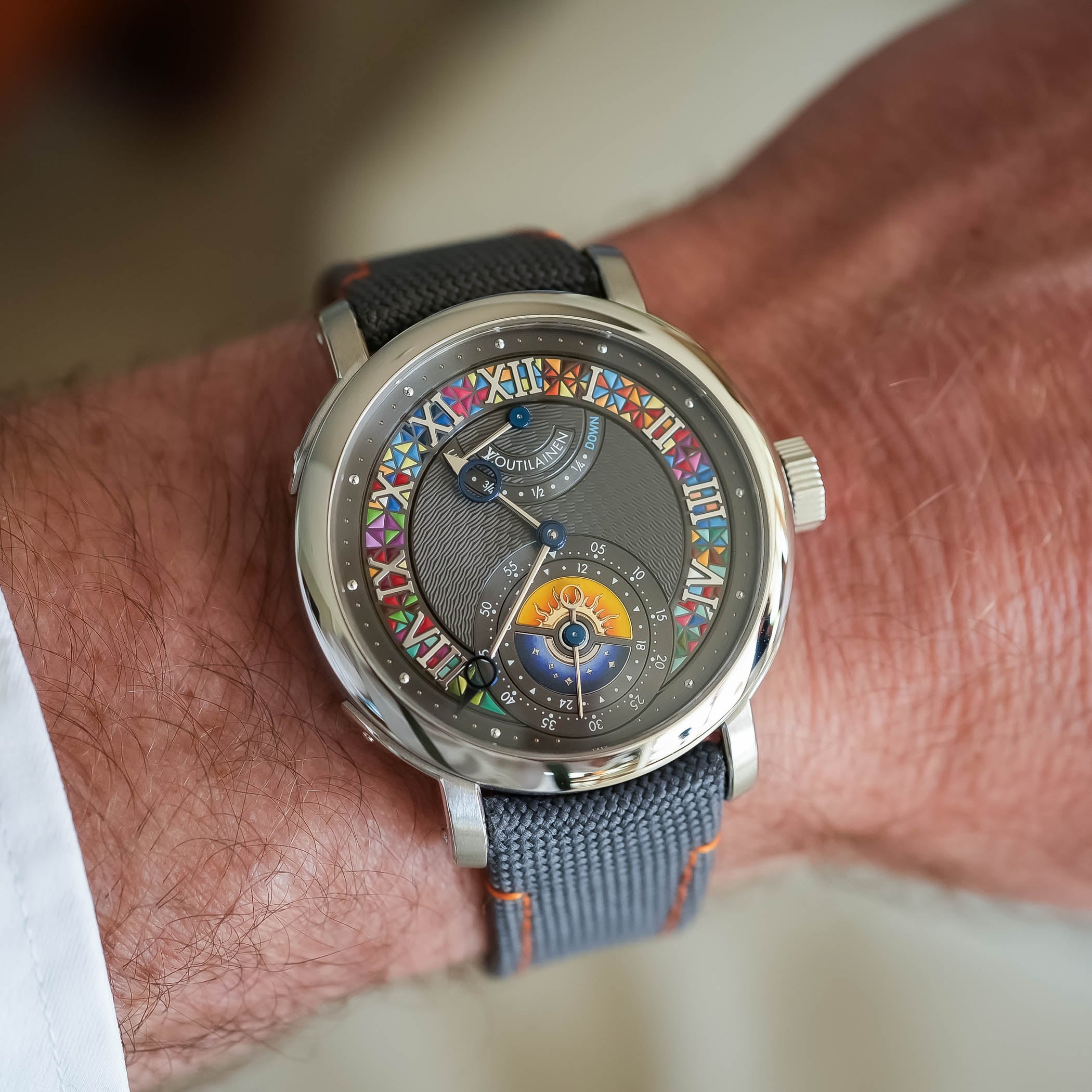 You can’t talk about gorgeous movements and not mention the Finnish master, Kari Voutilainen. Teaming up with Louis Vuitton, he pulled out all stops with the LVKV-02 GMR 6. This meeting of two powerhouse names uses LV’s Escale as a base, but in Tantalum, and features Voutilainen’s signature style on the dial and movement. Both are intricately decorated with colourful miniature-painted flags, used to identify owners’ LV trunks back in the day, and much, much more. The movement itself is a lust for the eyes thanks to a black polished balance bridge, hand-bevelled edges, polished jewel sinks and so on. Plus, it’s a GMT movement with power reserve and day/night indication, too! Only 5 will ever be made, at a price of EUR 550,000 each.