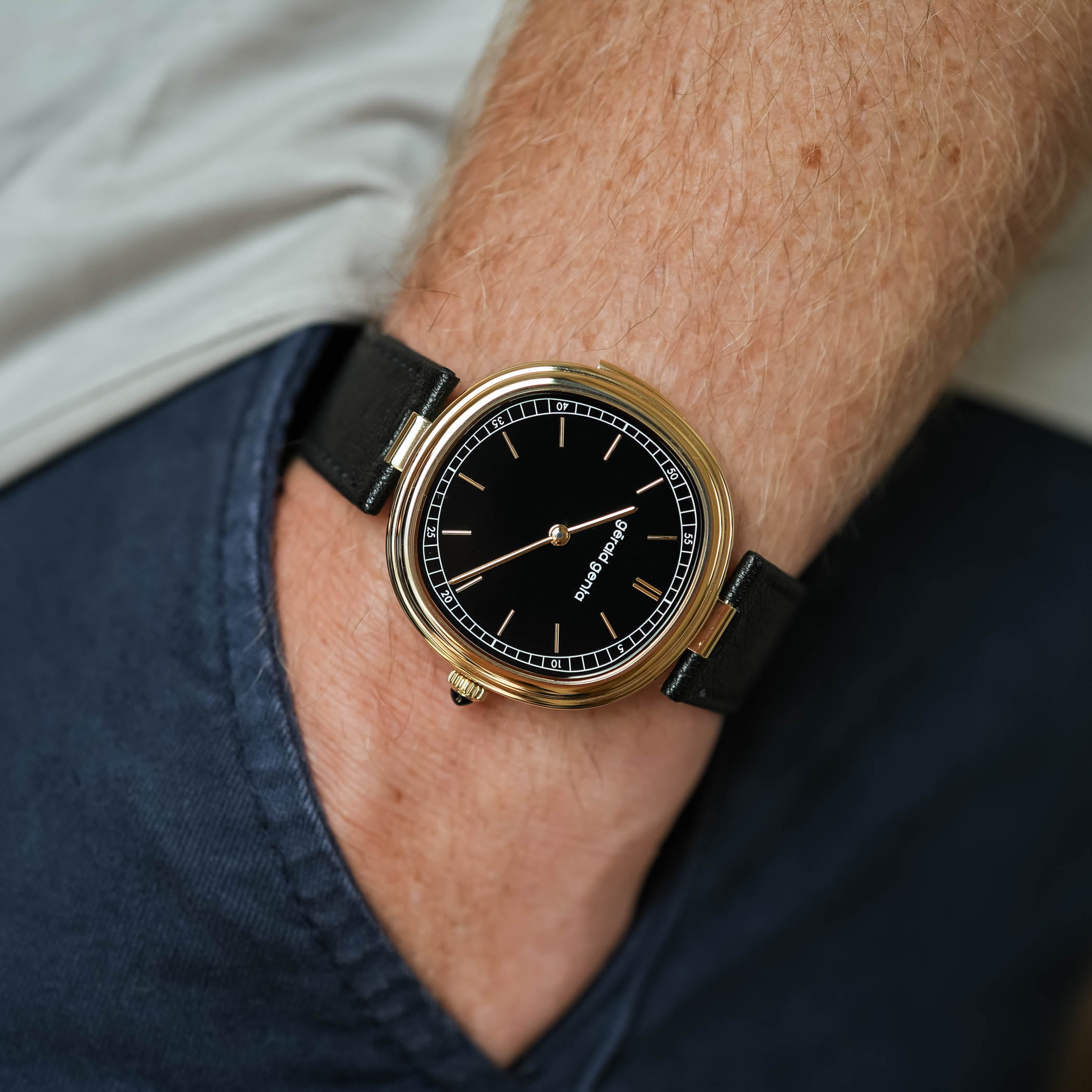 At first glance, the Gerald Genta Minute Repeater might be mistaken for a very elegant time-only wristwatch, and you’d even be forgiven for that. Revealing only hours and minutes on the black Onyx dial, it’s the discreet slider on the left that gives away its rather audible secret. The soft cushion-shaped case is lovely and compact at just 40mm across and 9.6mm in height, despite housing a complex minute repeater movement by La Fabrique du Temps Louis Vuitton. The whole watch effortlessly oozes tons of class, and the details in the movement are simply astonishing. Worn on a black sheep leather strap, only 10 will be made per year, for a price of CHF 320,000 before taxes.