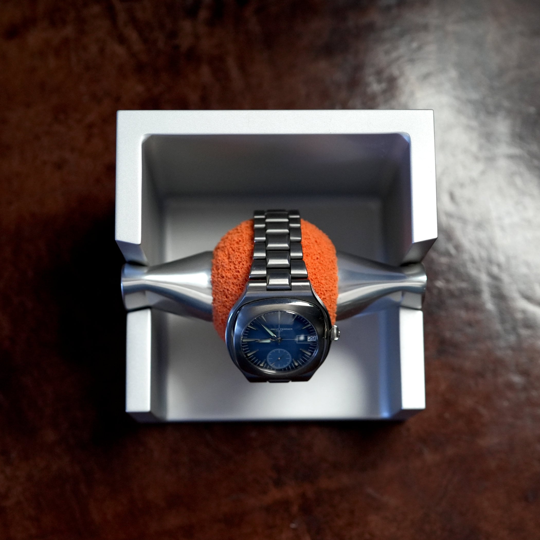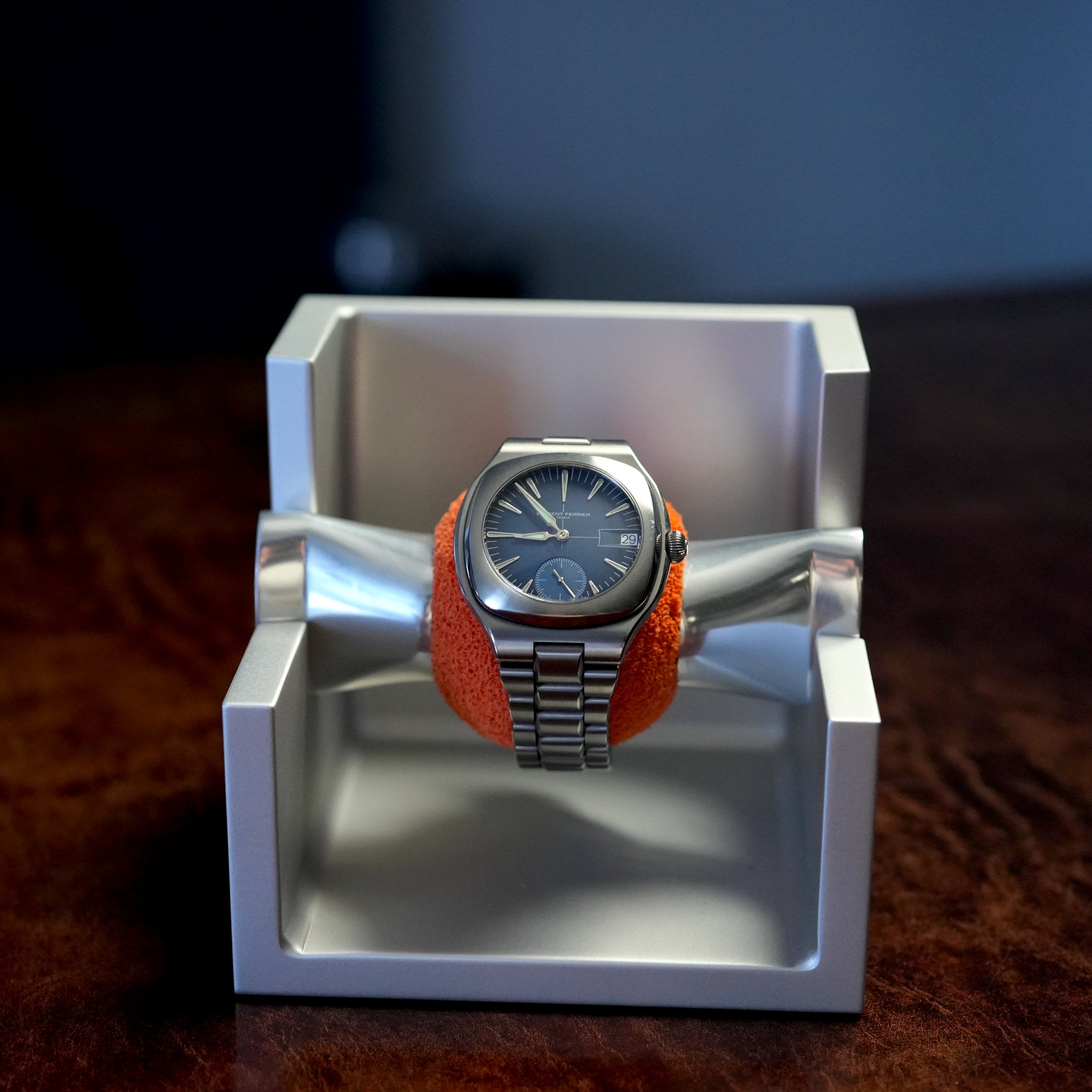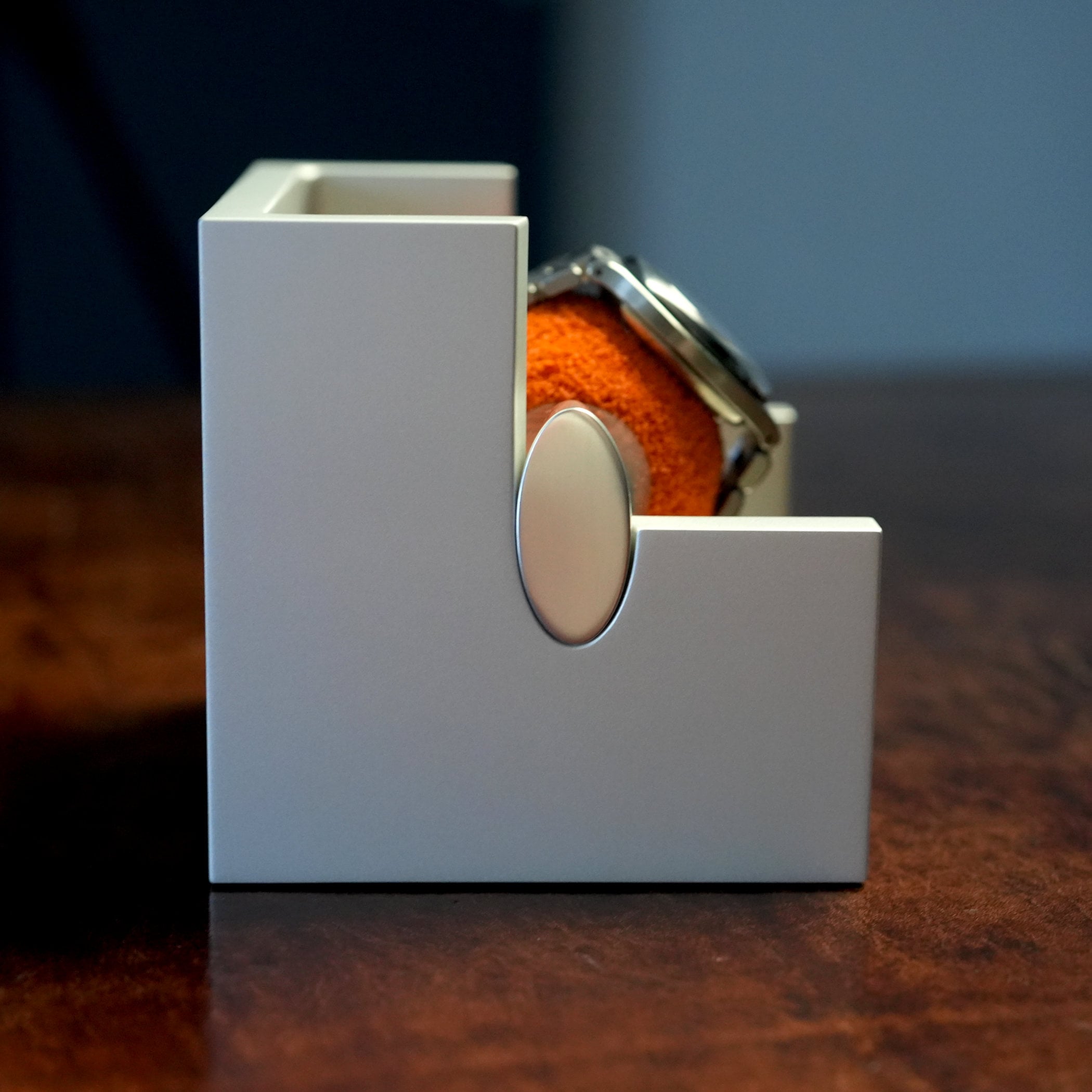 The monolithic structure is designed to keep your watch safe and composed, propping it upright for all to see. The simple lines keep your watch in focus, and the added benefit is that you can still read the time at a glance if needed. You don’t have to awkwardly tilt your head to see you’re running late for your next meeting! The branding is kept to a minimum, so as not to distract from the object itself or the watch that’s taking a breather.