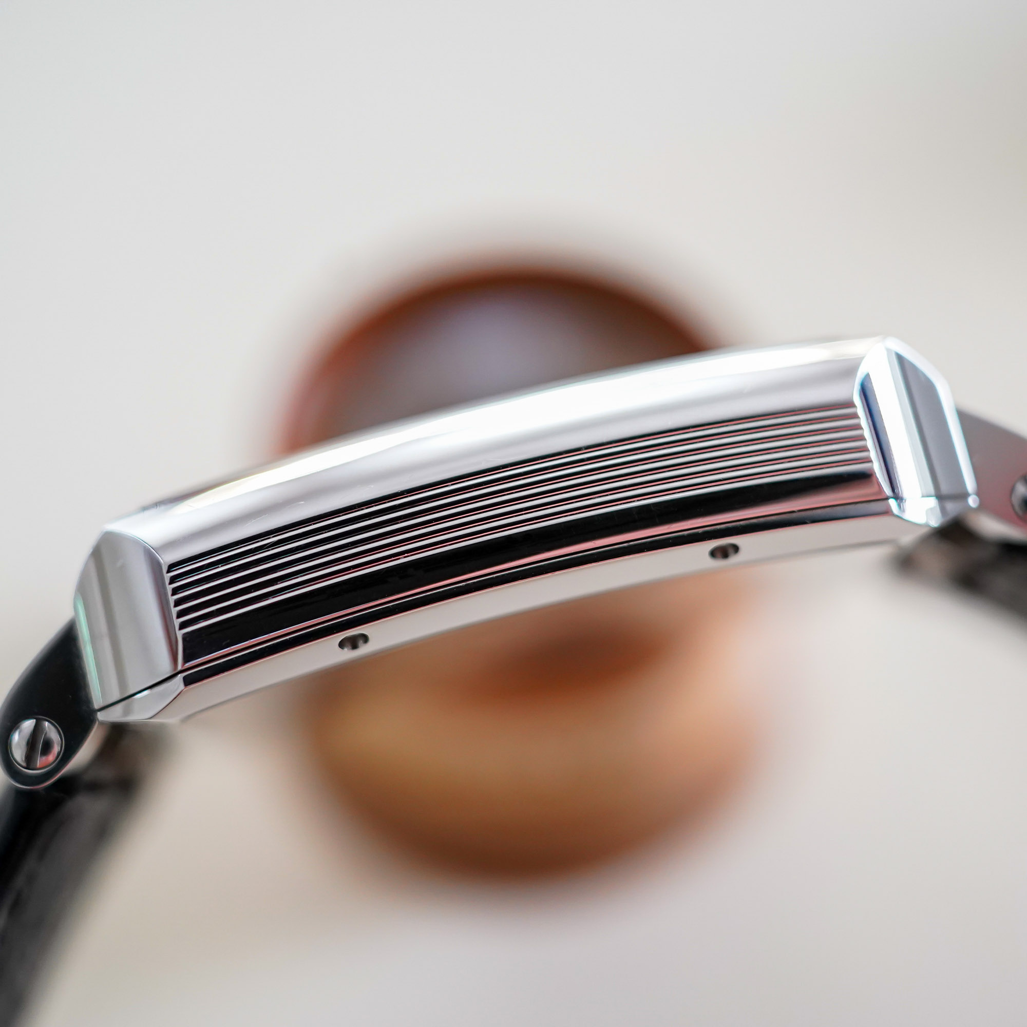 The Art Deco-inspired case comes in stainless steel (Georg only) or precious metals (both models) and measures 40mm in length and 32mm in width. It has a lovely curve to it, and the grooves along the caseband give it tons of character. This is further enhanced by the scalloped corners, onion-style crown flanked by two subtle guards, and signature triple-lug design. Naturally, the top and bottom crystals are sapphire.