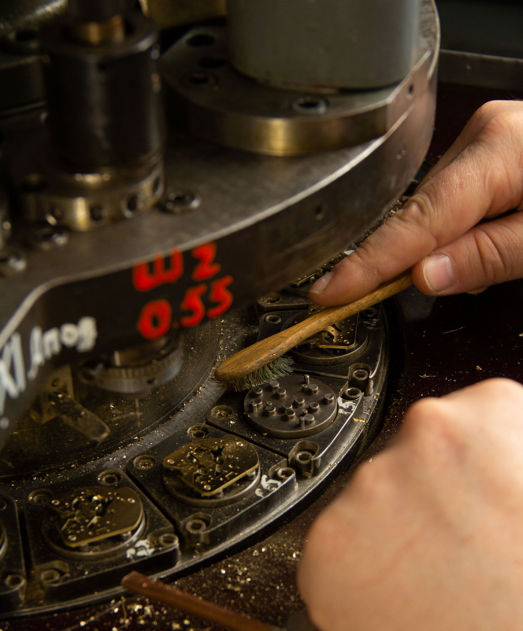What is the purpose of these toothbrushes? The largest components of a mechanical movement are the plates, bridges and rotors. Producing these components is all about transforming a flat piece of brass into an extremely precise and complex component. This is done by cutting metal away with high-speed rotating cutters. Shavings are produced during the milling process, and the role of the toothbrush is to scrub the workpiece (and the holder on which the workpiece is fixed) and remove the shavings. This is an exceptionally important step: any dirt that remains on these surfaces can affect the precision of the subsequent milling operations and at a later stage, the precision of the watch itself.