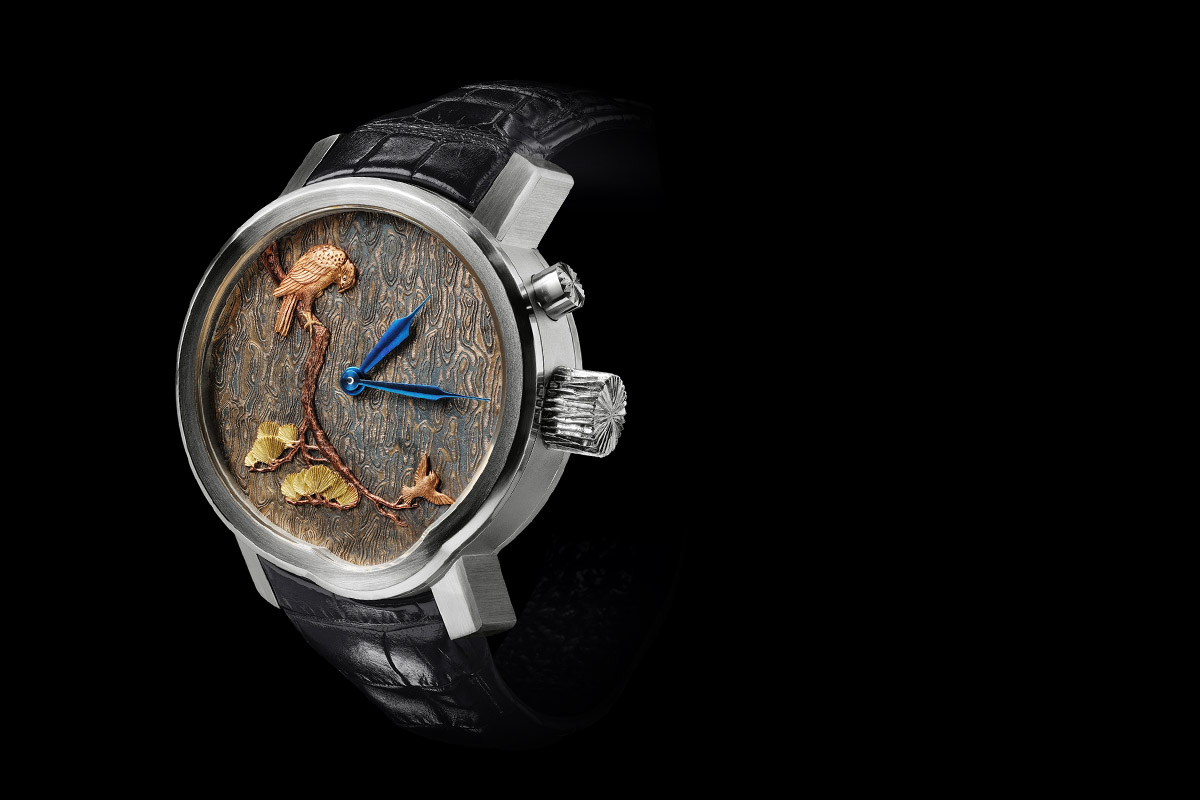 Kees Engelbarts started his career as an engraver, however because of his personal interest in Japan and Japanese art, he learnt how to apply the art of Mokume Gane in the small dimensions of a wrist watch. Mokume Gane literally means “wood grain metal” and Kees Engelbarts applies it on dials, hands, and even movement’s plates and bridges! Now-a-days he works both for a select number of high-end Swiss brands and private collectors. His work is highly regarded for the impressive and highly skilled work, and for depicting important art pieces. On one of his previous watches he engraved a dragon on the dial, but not just a dragon; it was a dragon that is on the ceiling of a temple in Kyoto. Today we’re looking at a piece with a hawk and a sparrow, and again, there’s a story to it…