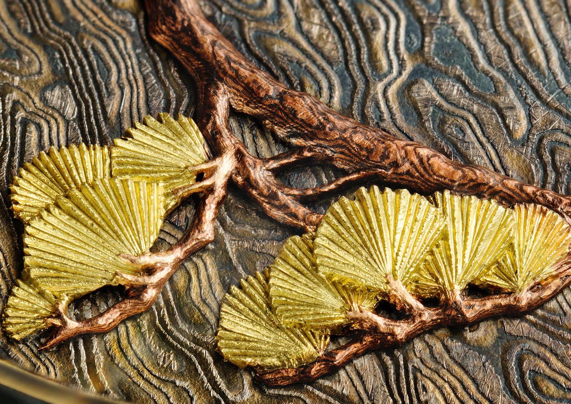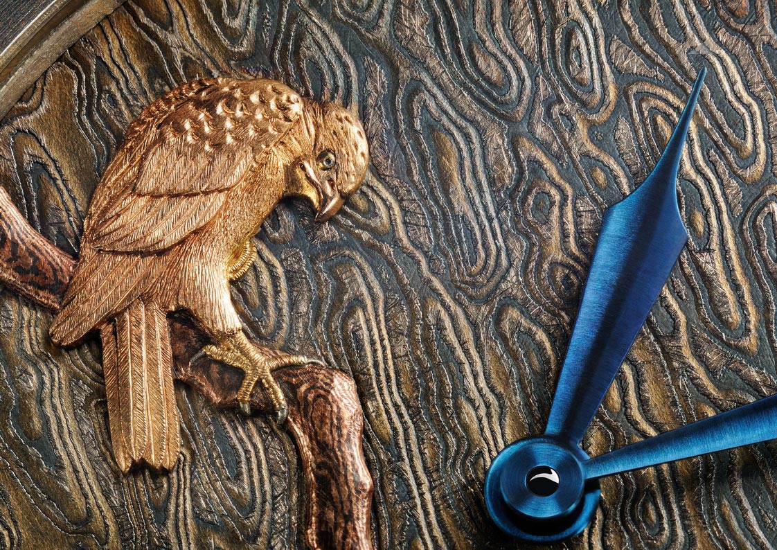 Kees Engelbarts used a variety of different materials for the dial. For instance, the hawk is made of red gold, the leafs are in green gold and the little sparrow is made of bronze. For the branch Kees Engelbarts used the art of Mokume Gane on pink gold/shakudo. The smallest details are also in various materials, like the eye of the hawk that is in yellow gold with a silver center. The eye of the sparrow is also in yellow gold. The hawk’s feet are in yellow-gold and the claws made of silver. The base plate, on which the scene is mounted, is white-gold/silver mokume gane and has been treated with nitric acid. This acid will attack the silver and leave the white- gold unharmed and this accentuates the vertical shape structure and creates a relief. Finally, the hands are in heat-blued steel.