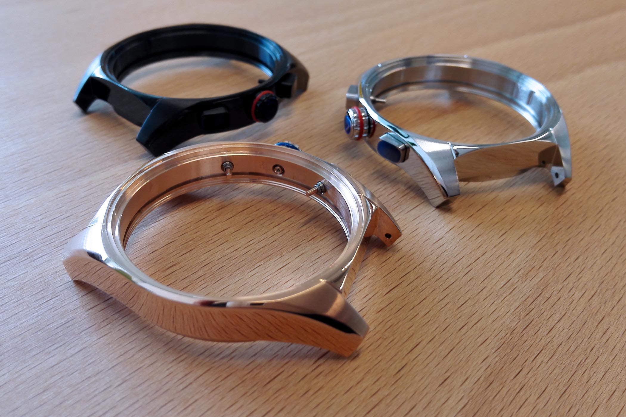Just like they did with the 3-hand watches, you’ll have the chance to change almost every component of the watch to make sure it resembles what you really want. As of now, one case shape is available: 42mm in steel, with a sporty, masculine, slightly racing-style that befits the chronograph function. You’ll have the option between nude steel, PVD rose gold or PVD black. Then come no fewer than 9 options for the bezel (polished, brushed, with tachymeter insert), 3 dial options (white, blue, black), 3 options for the chronograph pushers (steel, black, gold), dozens of different hands (with choices for the main hand, the chronograph hands and the second hand), 22 different crowns and pretty much all you need for the strap, the bracelet or the buckle… In short, there are very few chances that you’ll see two identical Revolo Chronograph watches!