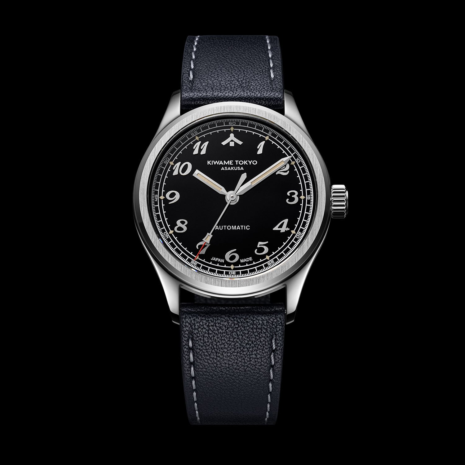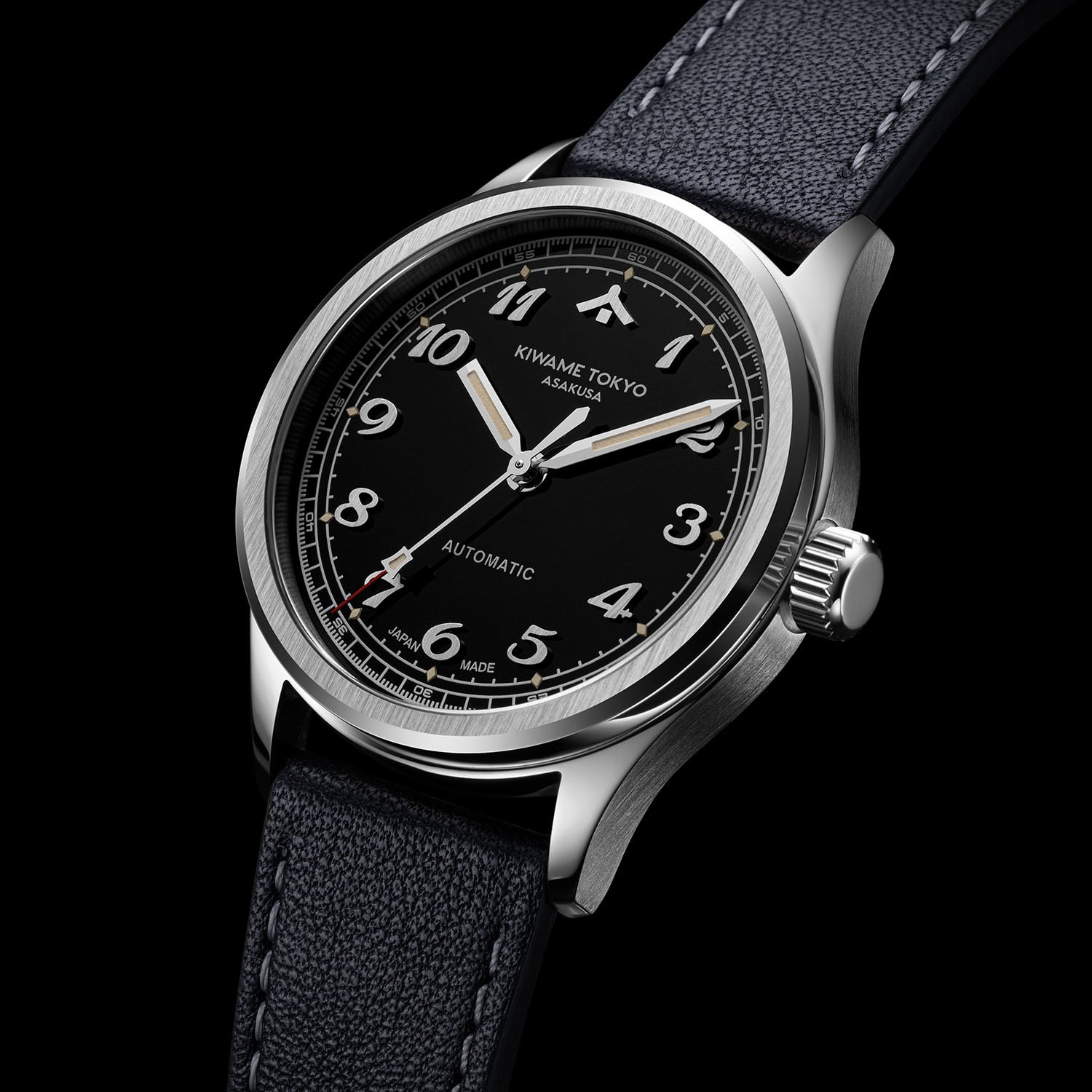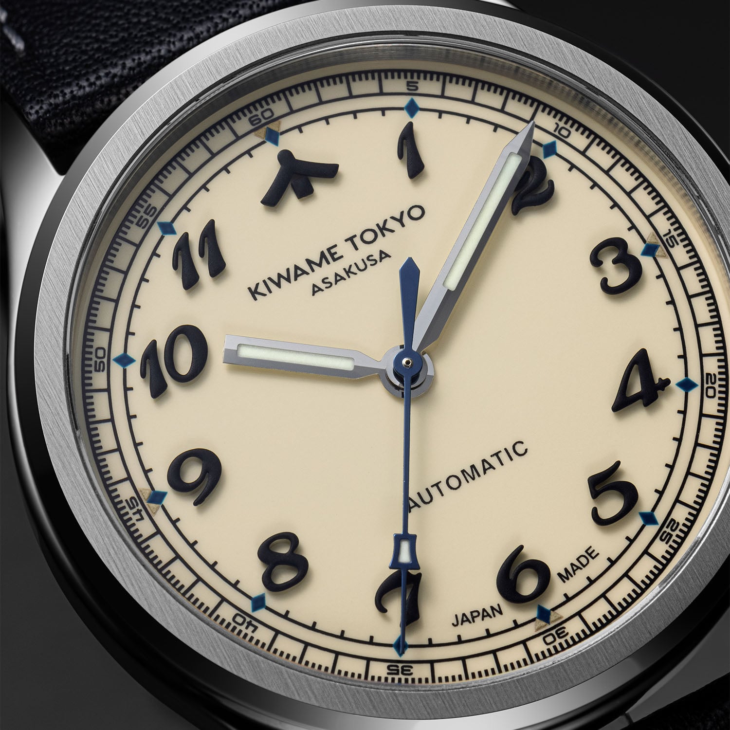 The applied numerals rise prominently from the dial and are either finished in matte black for the Usuki version or vertically brushed for the Kurotsuki model. A finely printed minute track circles the outer edge of the dial, with luminous paint applied to some or all hour markers, depending on the version. The hands are baton-style with a subtle raised ridge running through their centre, and a lumed insert. The second hand, carried over from the two previous models, is either steel or blued, with a luminous element shaped like the great roof of Kaminarimon Gate in Asakusa. Finally, this Kiwame Tokyo Mune Series features a more detailed railroad minute track, giving it a 1940s chronometer vibe.