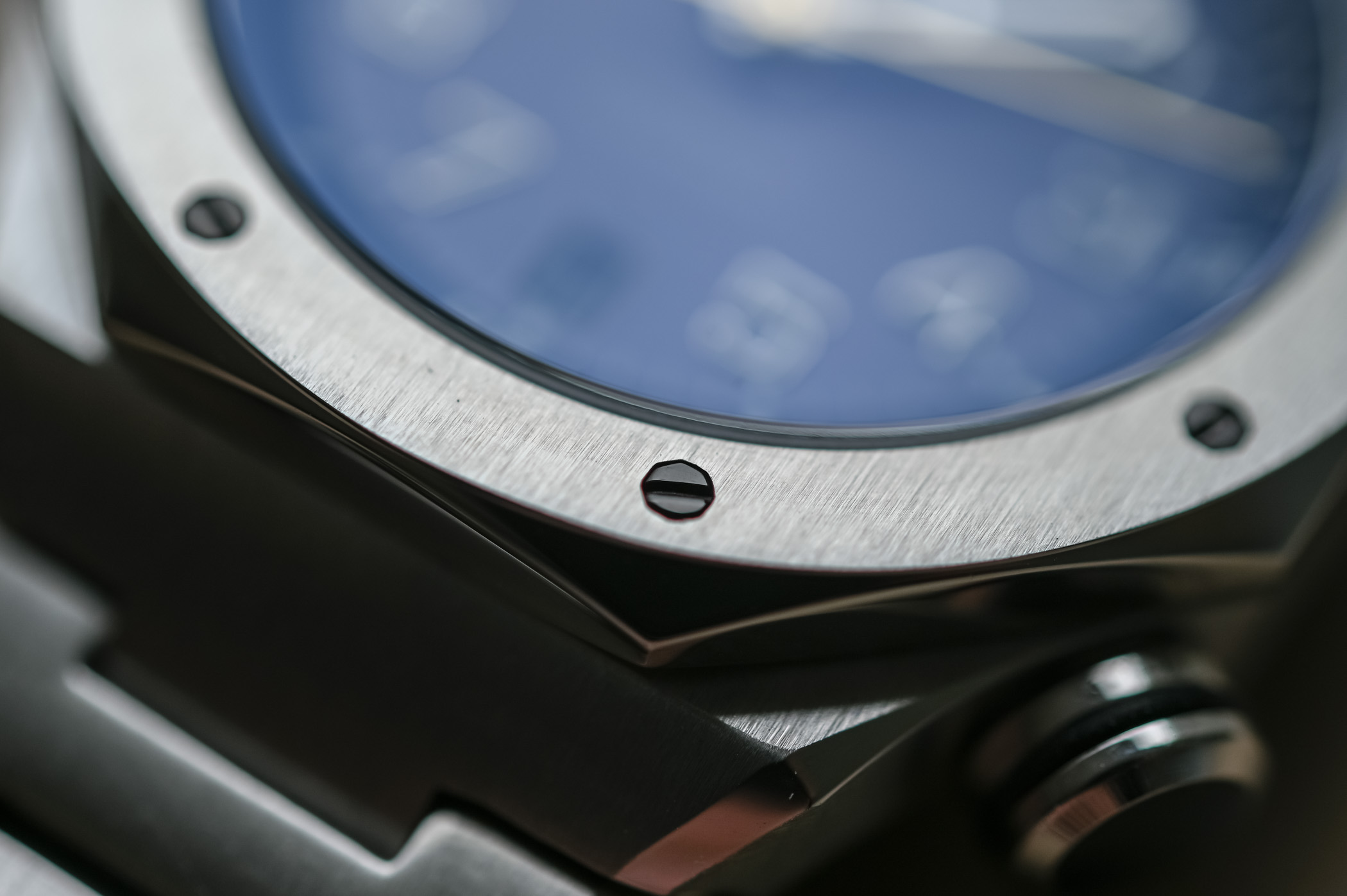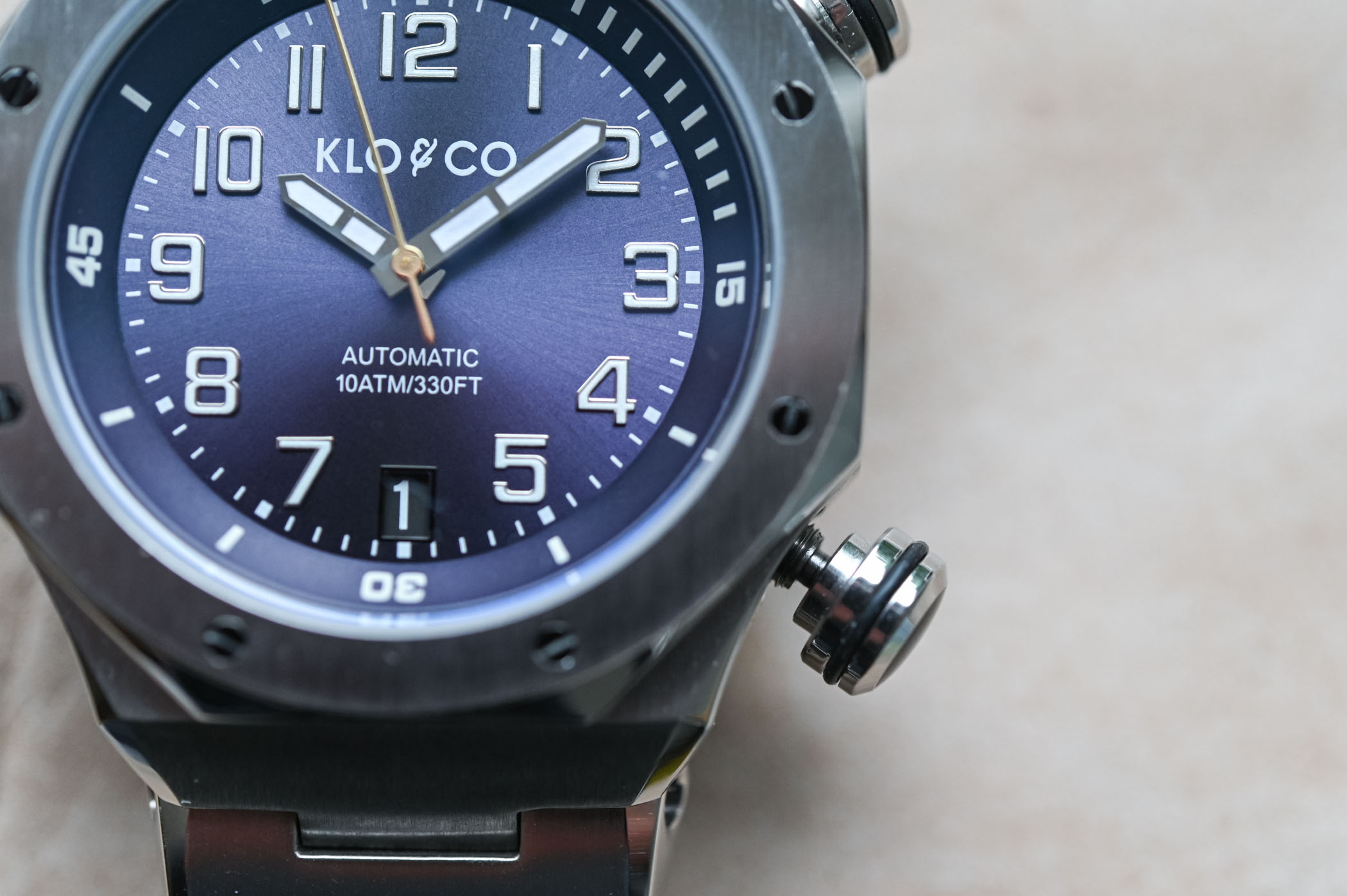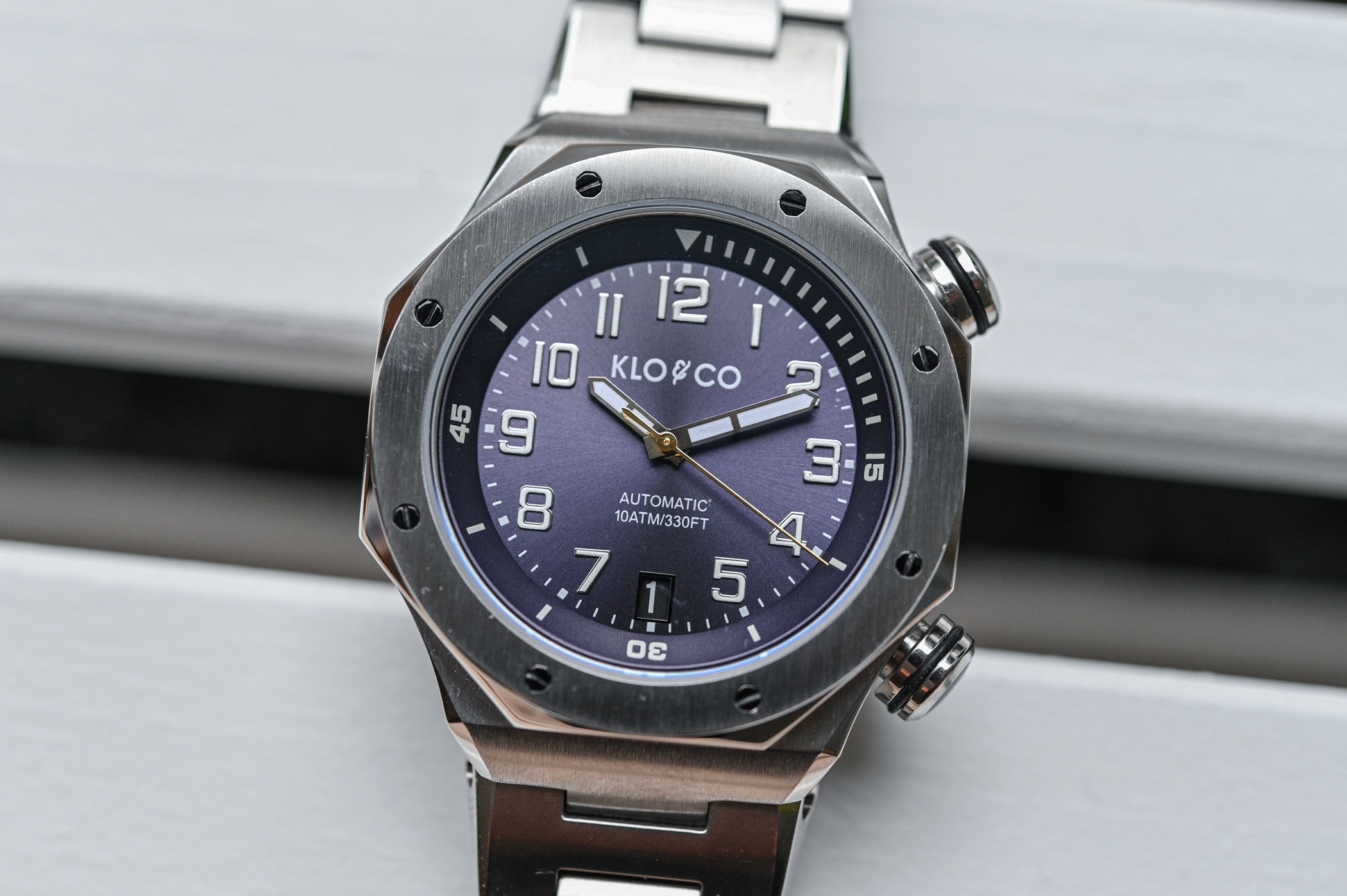 Designed from the ground up, the stainless steel case of the KLO & CO Alpesailer has an integrated bracelet and external bezel sporting exposed screws, giving off a bit (or a lot…) of a Royal Oak vibe, while somehow remaining unique. With a 41mm diameter and 12mm height, it’s also well-sized for a contemporary audience. The case features a “Triple Finish” with bevelled, polished and brushed surfaces, creating a pleasing, upscale aesthetic. The brushed and polished steel bezel has shallow curved sides forming an octagon, and eight exposed screw heads contrast well against its brushed face.