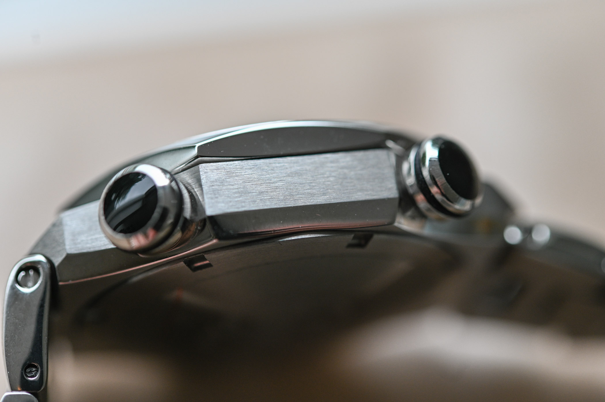 The integrated, tapered stainless steel bracelet has the same triple finish as the case with polished, brushed and bevelled elements. Its shape contributes a great deal to the Alpesailer’s design. It’s secured to the main case with exposed screws and a polished chamfer from the case continues onto the first link, creating a well-executed uniformity. It all comes together in a sophisticated aesthetic that belies its affordable price.