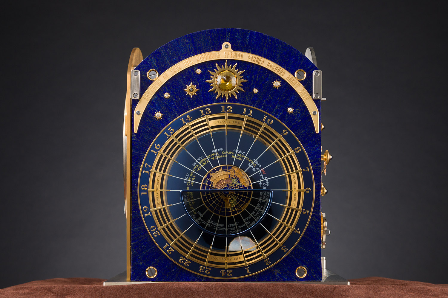 On one side there is an indicator of the lunar movement relative to the sun which consists of models of the Earth, the Moon and the Sun, which reflect their relative positions at all times, as well as the light and dark sides of both the Earth and the Moon. This indicator also shows the world time on the model of the Earth by placing cities around the world in their correct time zones.
