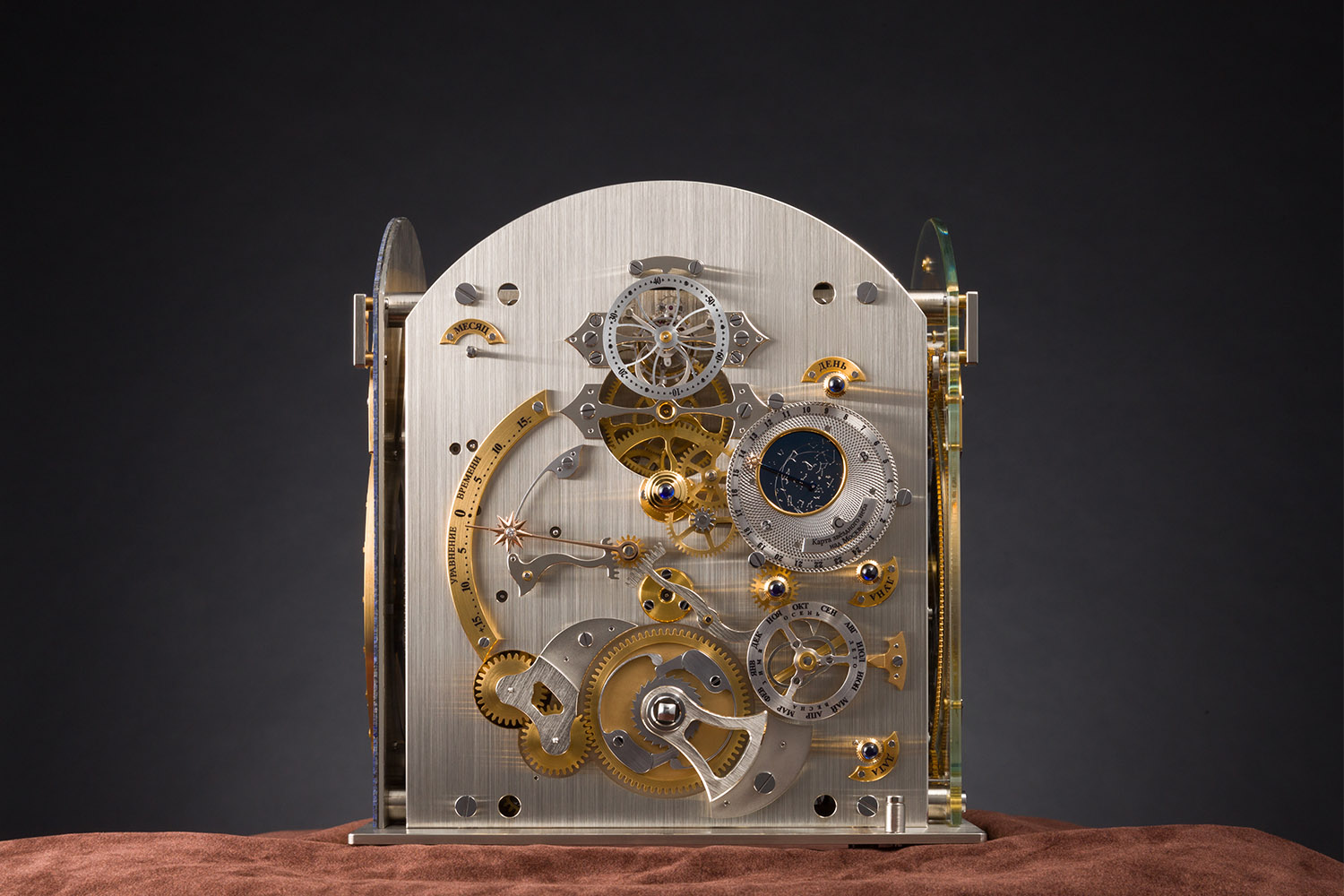 There are four different faces on the Moscow Comptus Easter Clock, combining to display more than 25 different functions, the majority of which I am sure you will never use. On the main face we find the indicator of the dates of Eastern Orthodox Easter both in the Julian and the Gregorian calendars, a lunar phase indicator and a power reserve indicator. On the opposite side there is a one-minute tourbillon, an equation of time indicator and a Star Map of the Moscow sky. It’s on the sides though where things get really interesting.