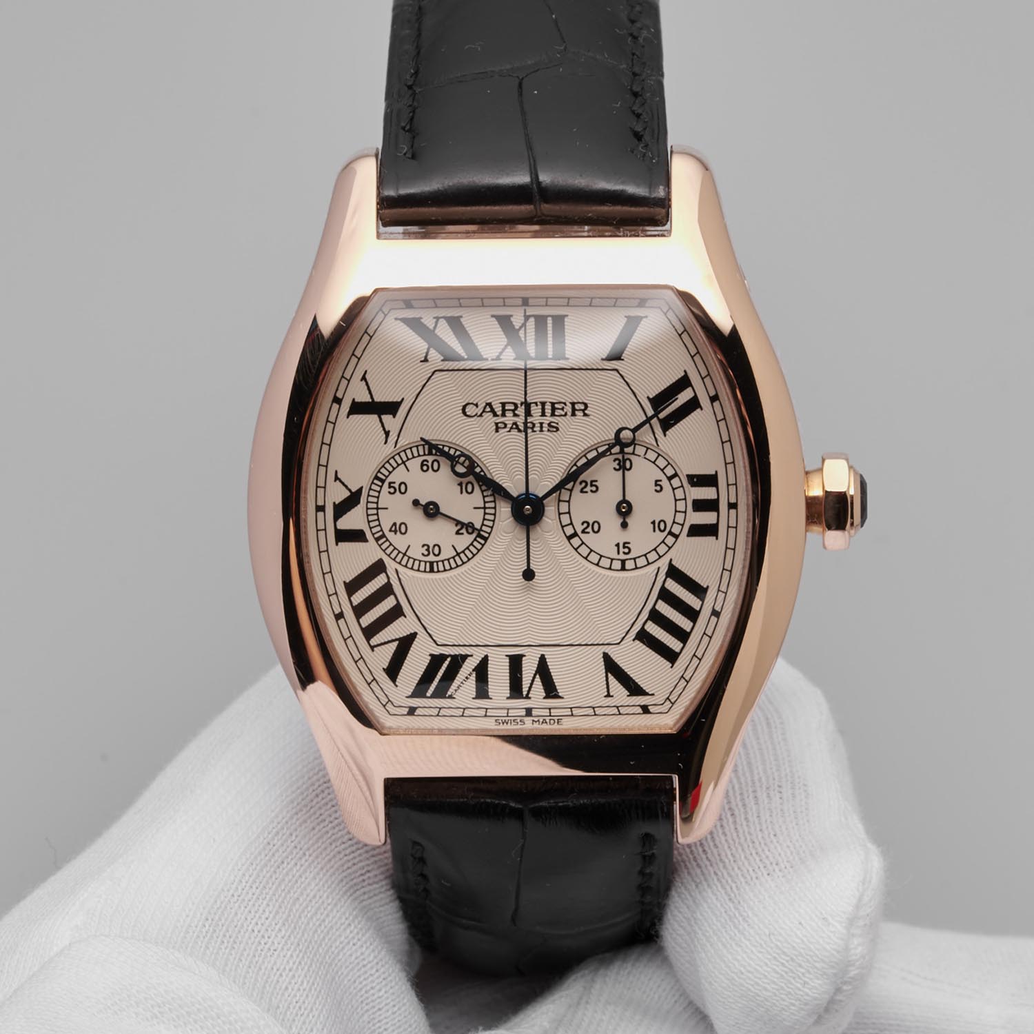 This Cartier Tortue Chrono-Monopoussoir is a declination of one of the most revered watches of the Collection Privée Cartier Paris (CPCP). From 1998 to about 2008, CPCP was Cartier’s Haute Horlogerie collection, featuring some of the brand’s iconic designs with high-end mechanical movements, in particular by makers such as Piaget, Frédéric Piguet or Girard-Perregaux. If several brands have designed Tonneau shaped watches, very few can rival the Cartier Tortue. Born in 1912, it went through a subtle, seductive makeover in the 1990s. As its name suggests, the monopoussoir is a single push-piece chronograph. Indeed, until the 1930s, chronographs featured a single pusher to trigger the start-stop-reset functions, always in the same sequence. The absence of the traditional chronograph pushers leaves the purity of its harmonious curves intact. This specific model is the XL version (reference W1547451). It features the CPCP signature guilloche dial with Roman numerals, black railtrack and blued hands.