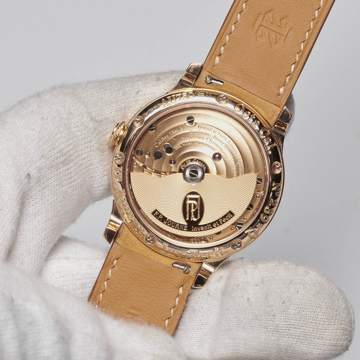The watch is driven by the magnificent calibre 1300.2 with automatic winding and five days of power reserve. Made from solid rose gold, it is decorated with chamfering and polishing, Côtes Circulaires on the bridges and perlage on the mainplate. The 22k gold rotor has a Grain d’Orge guilloché motif.