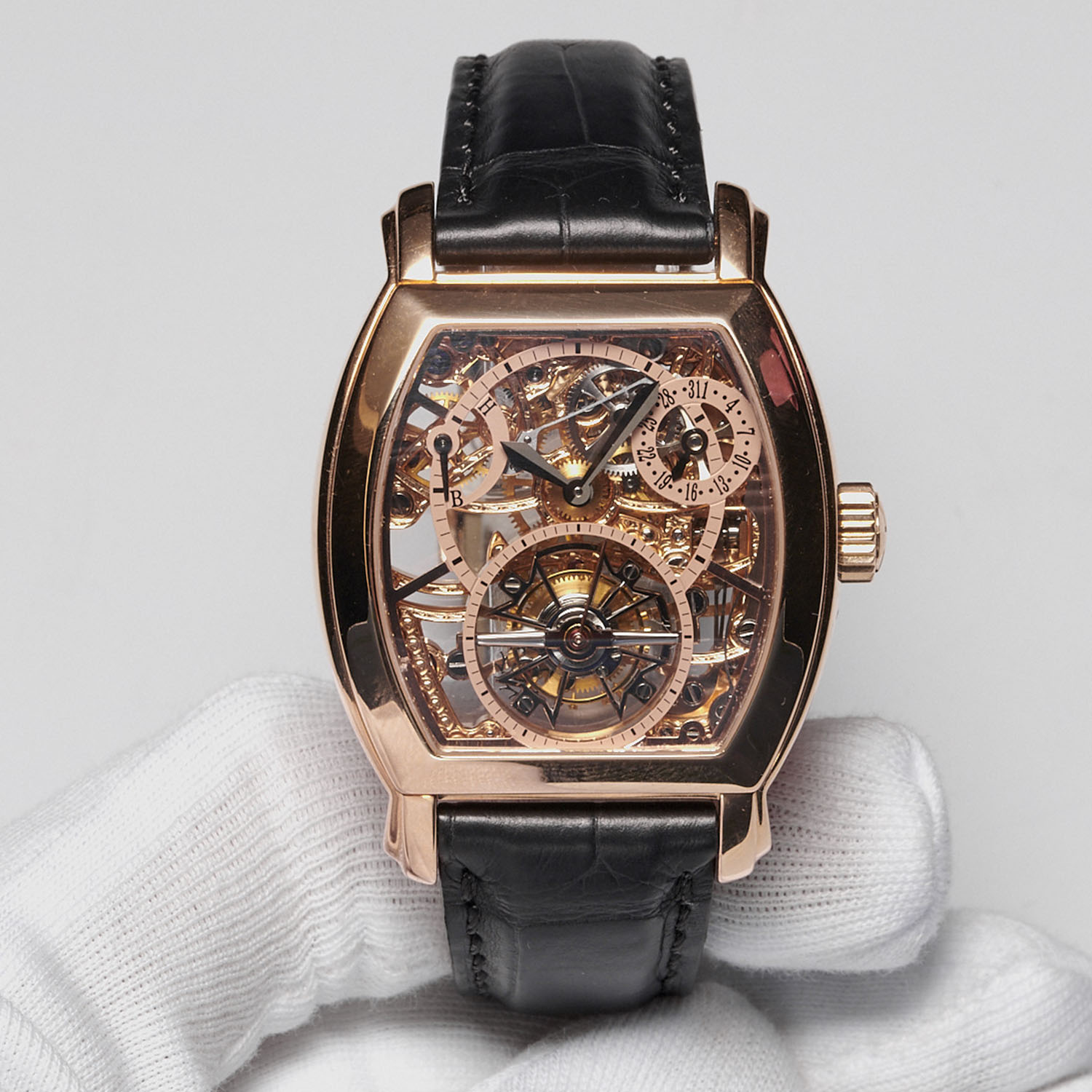 In this instance, it is presented in all its glory in a richly-decorated skeletonized version graced by a large tourbillon regulator at 6 o’clock. The hours and minutes are slightly off-centred and paired with power reserve and date indicators respectively at 10 and 2 o’clock. It’s also the first in-house modern tourbillon movement created by the brand. The Tonneau rose gold case measures 36mm x 36mm x 11.80mm.