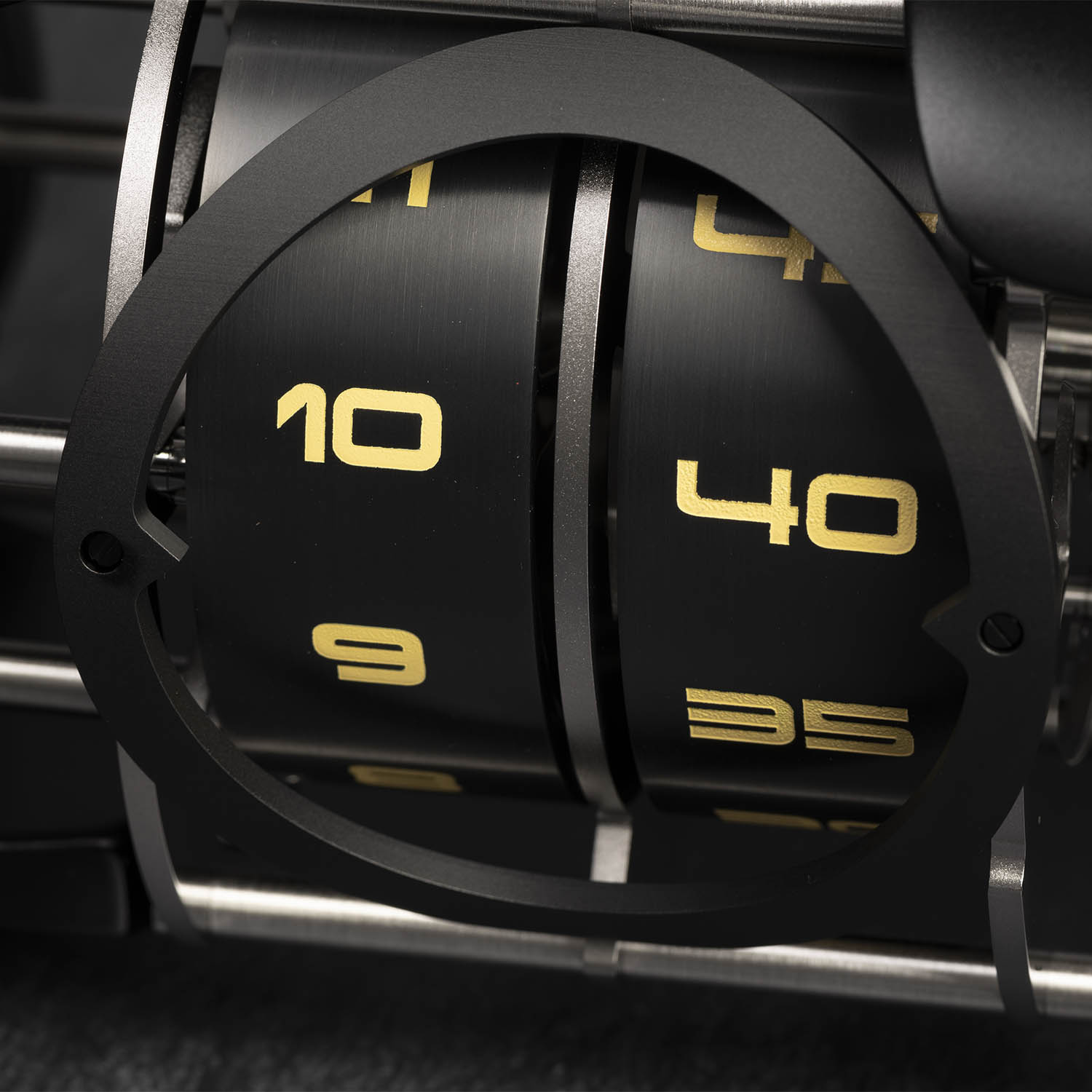 True to its name, many pieces customised by Label Noir are interpreted in all-black cases and dials. We’ve recently seen the Maurice Lacroix Aikon Label Noir in all black gear, and frankly, it looks great. In Label Noir’s hands, the Time Fast D8 gets the black treatment, and its aluminium bodywork flaunts a matte black paint used in the automotive industry. The plates, alloys and escapement are treated with a matte black ADLC (Amorphous Diamond-Like Carbon) coating making it more resistant to wear and rust. Similar to the black and gold John Player Special F1 cars, the sleek black bodywork is enhanced with touches of yellow, including the hour and minute numerals on the satin-brushed black discs and the trims on the tyres. On the other side of the car, opposite the timekeeping rollers, is a round disc that is usually reserved for advertisers on F1 cars. Instead of the engraved L’Epée 1839 logo on the original models, it now displays Label Noir’s logo in yellow and the limited edition number of the table clock.