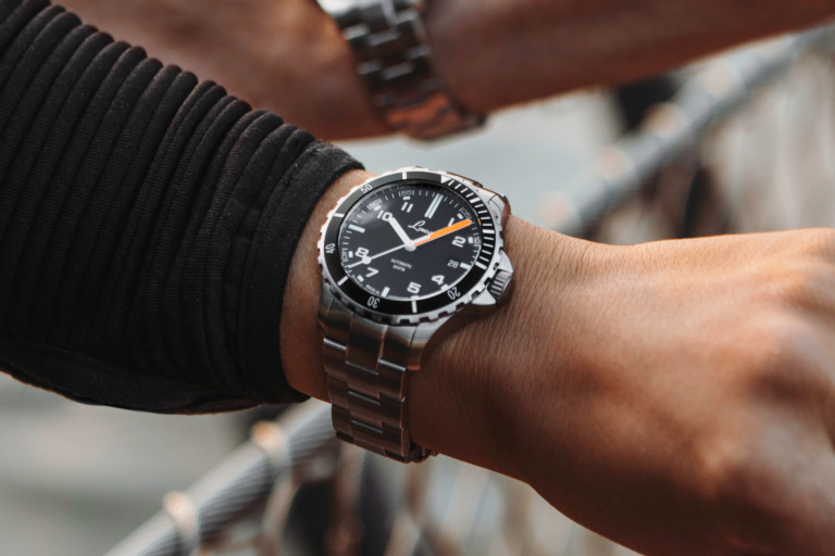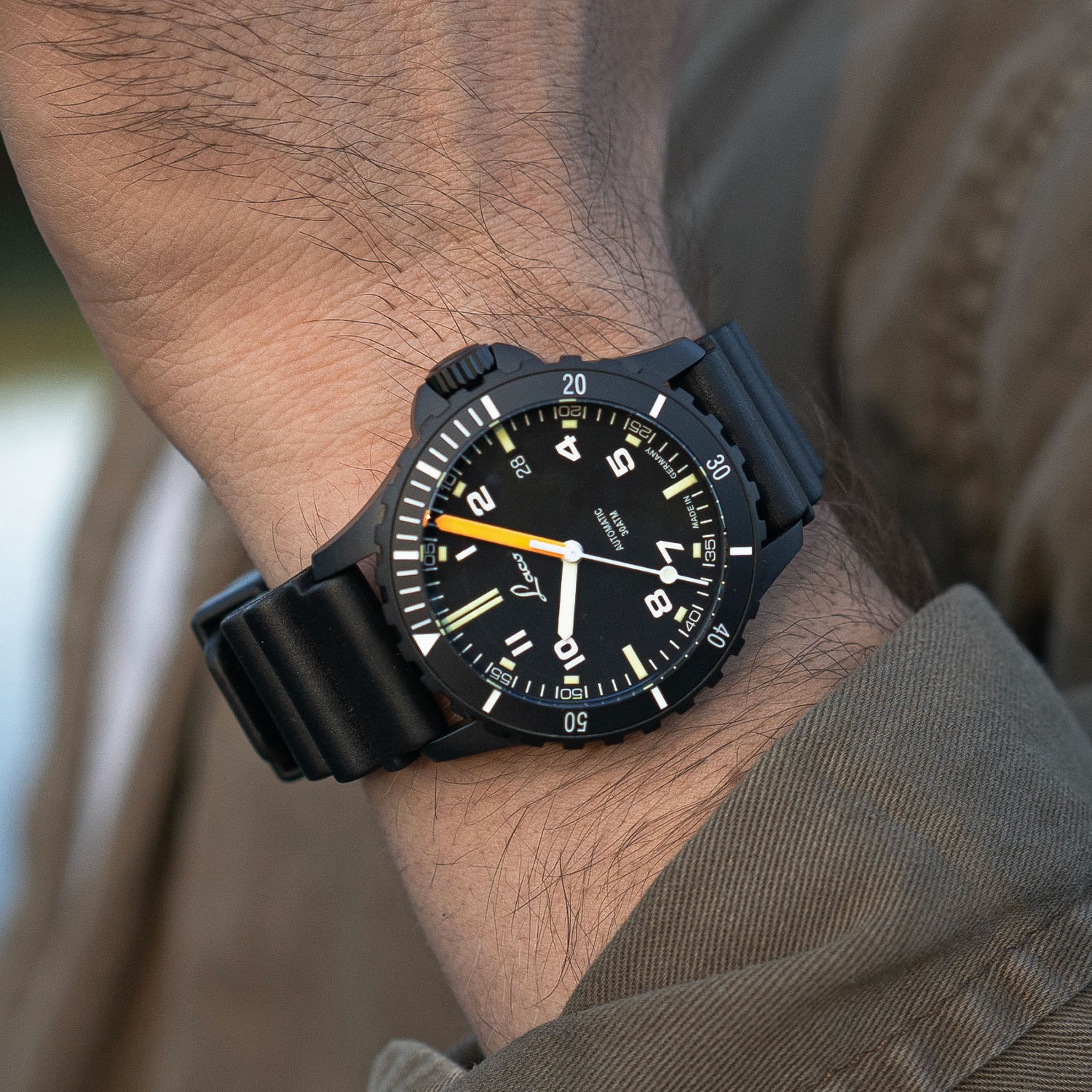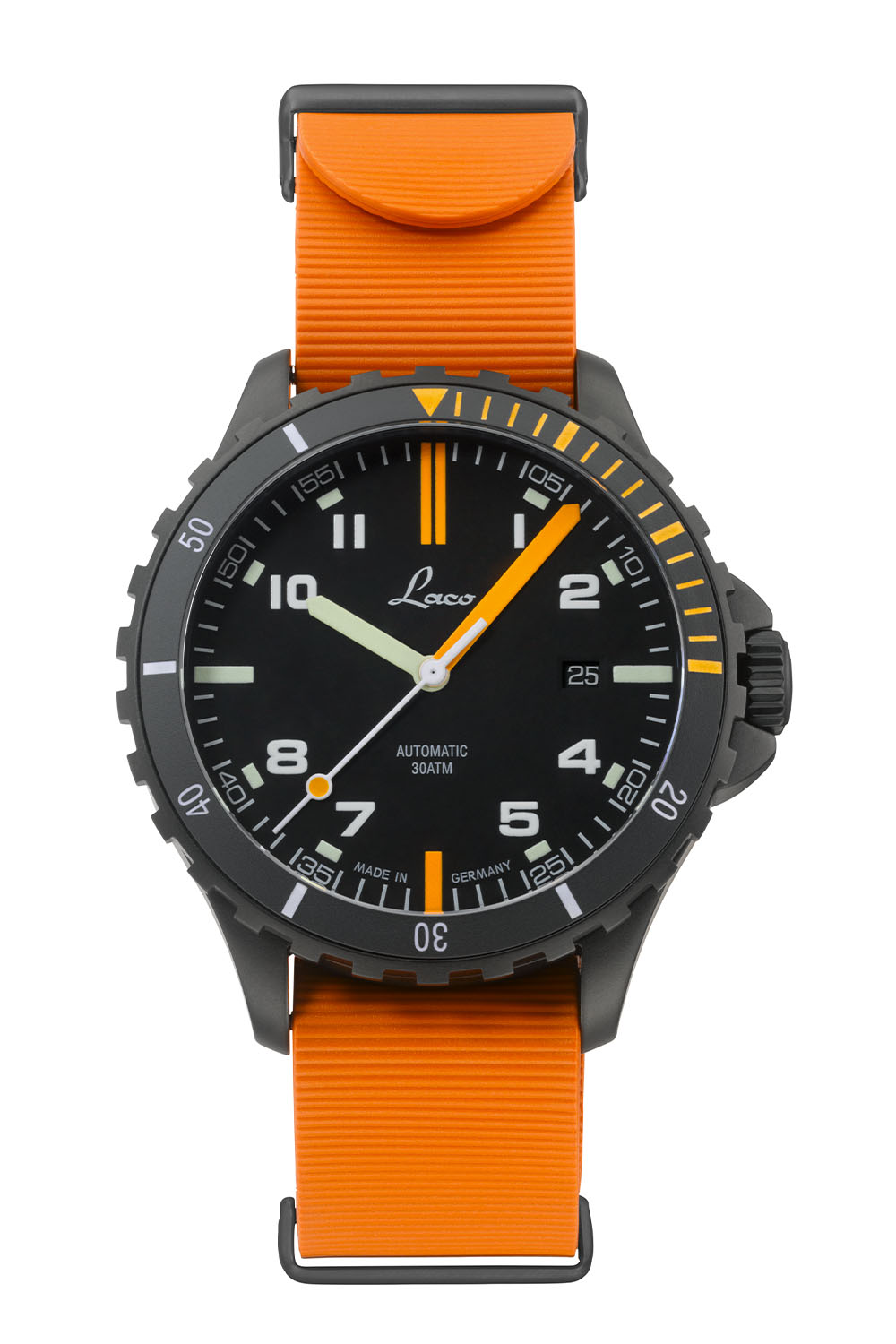 Laco’s Scorpion watches stand out with their distinctive use of Super-LumiNova. Sharing matte black dials, all Scorpion references highlight legibility with bold colour accents. The white Arabic hour numerals get a boost of light thanks to the luminous rectangular blocks situated on the dial’s periphery. Depending on the model, the SLN on the 15-minute scale of the bezel matches the all-important minutes hand, the lollipop seconds hand and the indices at 12 and 6 o’clock. A date window with a black background at 3 o’clock and a double-domed sapphire crystal with anti-reflective treatment complete the dial.