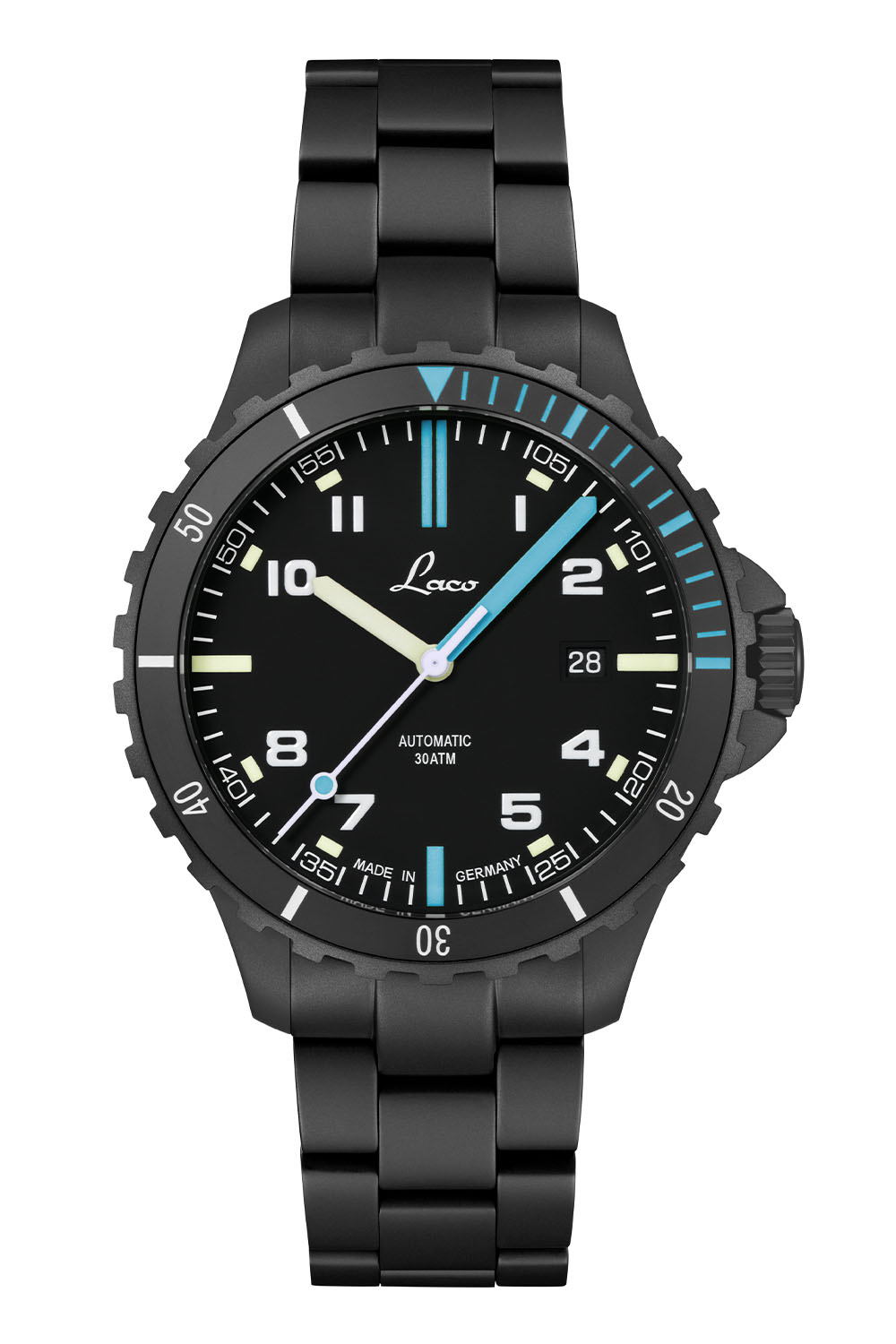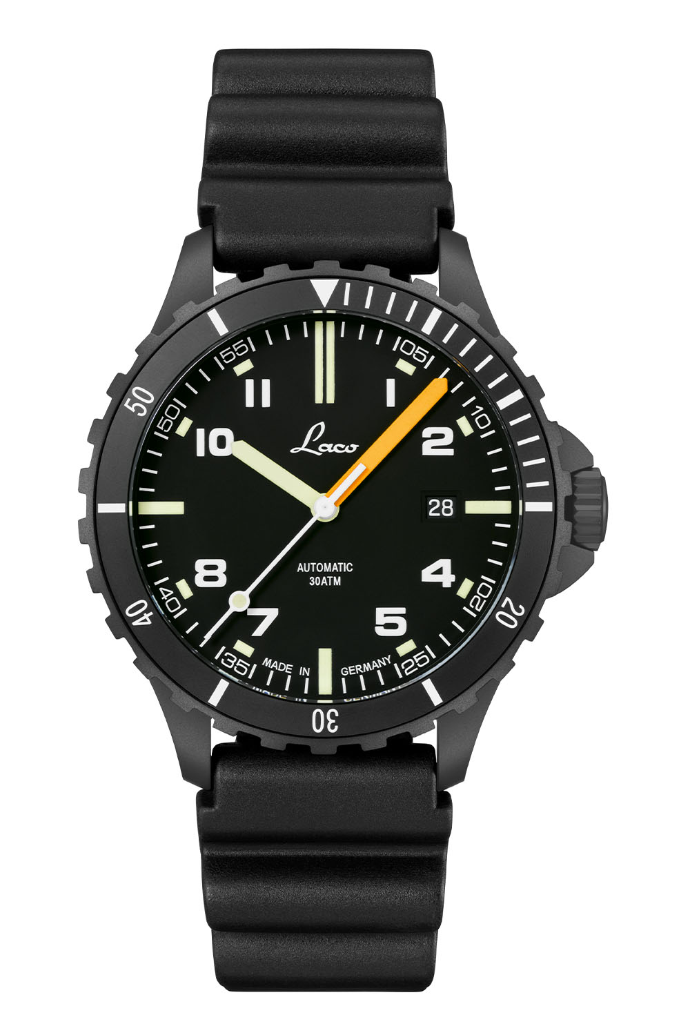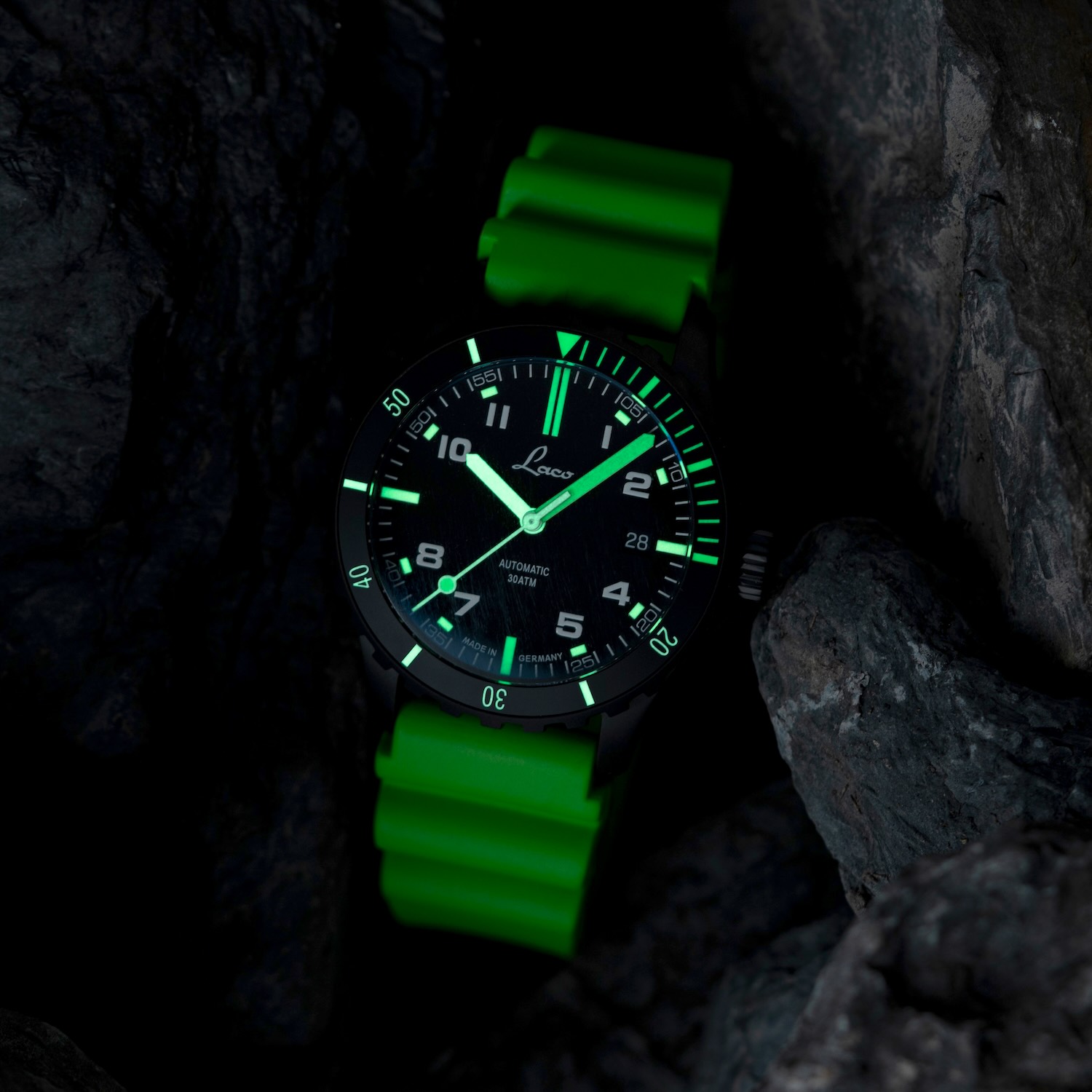 Laco offers three strap options: a NATO-style rubber strap matching the lume, an all-black rubber strap or a black DLC-coated stainless steel bracelet. The rubber straps retail for EUR 990, and the black DLC stainless steel bracelet, which will be available in November, will cost EUR 1,090.