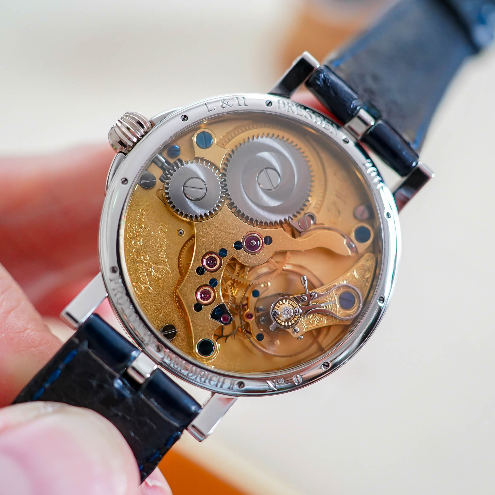 The Lang & Heyne Friedrich II is typically paired with an alligator leather strap and a pin buckle. This ideal closure choice allows for easy, unobstructed viewing of the movement in all its classical golden splendour. This duality – the two distinct faces of the Friedrich II – makes owning (and wearing) this watch such a captivating experience. On the movement side, it evokes a sense of respect for the classics; it plays a traditional tune. When looking at the dial, it makes you hum a lively, almost jazzy tune in contrast. Though the collection is named after the King of Prussia Friedrich II (The Serious), the dial, while undoubtedly a serious example of fine craftsmanship, exudes a playful charm. Impressions are certainly subjective, yet it’s hard to deny the watch’s undeniable allure. The price is set at USD 42,700 for the present platinum edition (about 34k dollars in gold).