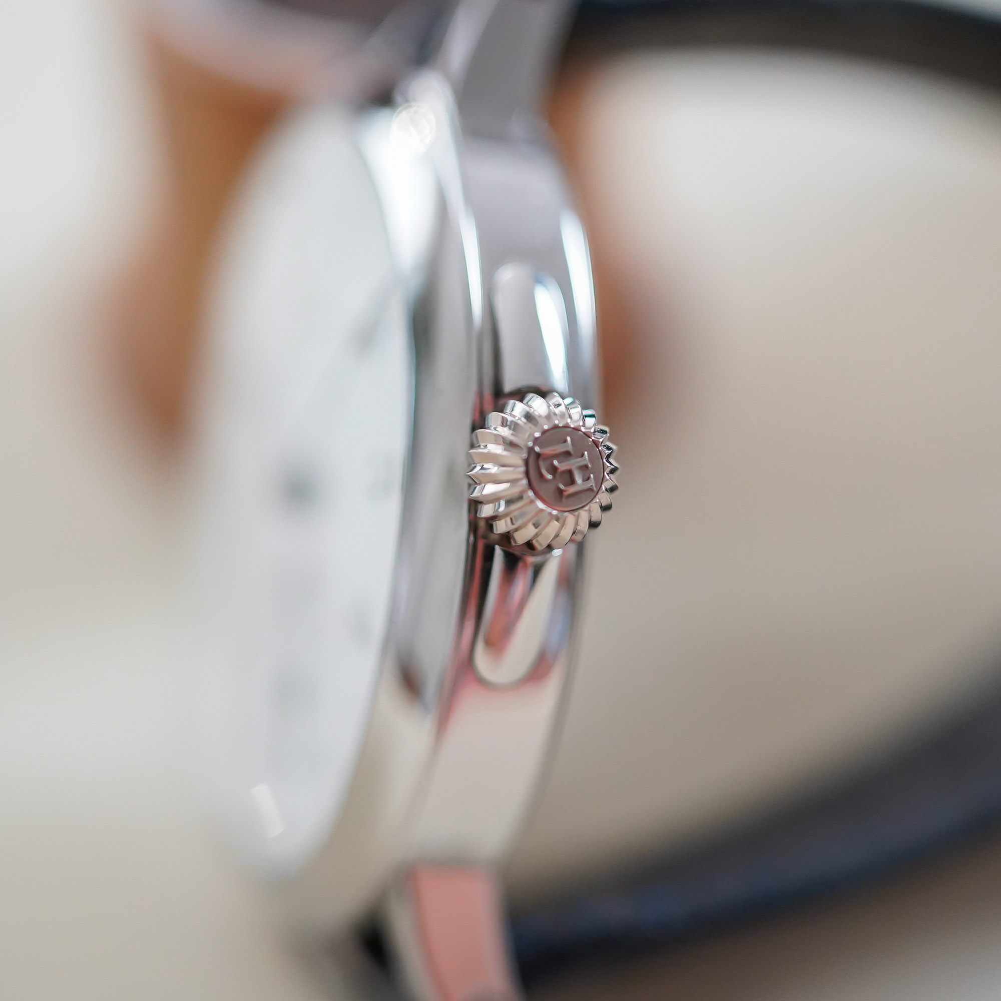 The sporty minute track, marked with dash-like accents and red triangles pointing inward, adds an interesting contrast, while the large Art Deco numerals for the hours bring a classy flair. The spade-tipped hour and minutes hands tie everything together into a cohesive and harmonious design. As always with Lang & Heyne, customization is available, but this particular combination is already perfect. And with the middle lug removed, the Friedrich II in white metal becomes the perfect complement to the gold-cased Friedrich III with its Roman numerals and cathedral hands – the latter being your ultimate dress watch, while the former is an ideal companion for those smart-casual occasions where a jacket is required.