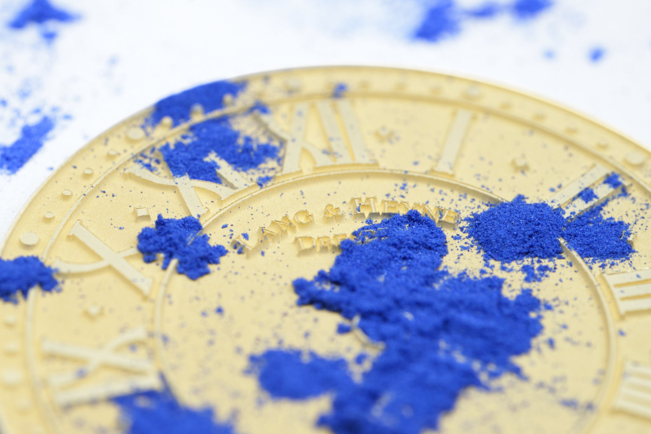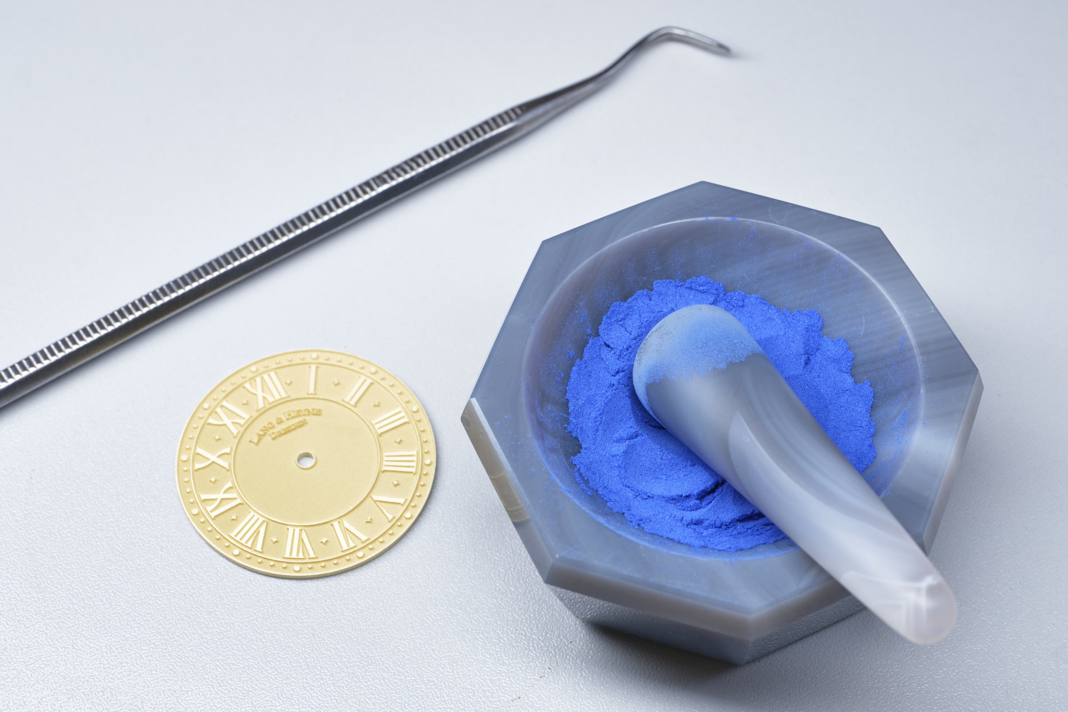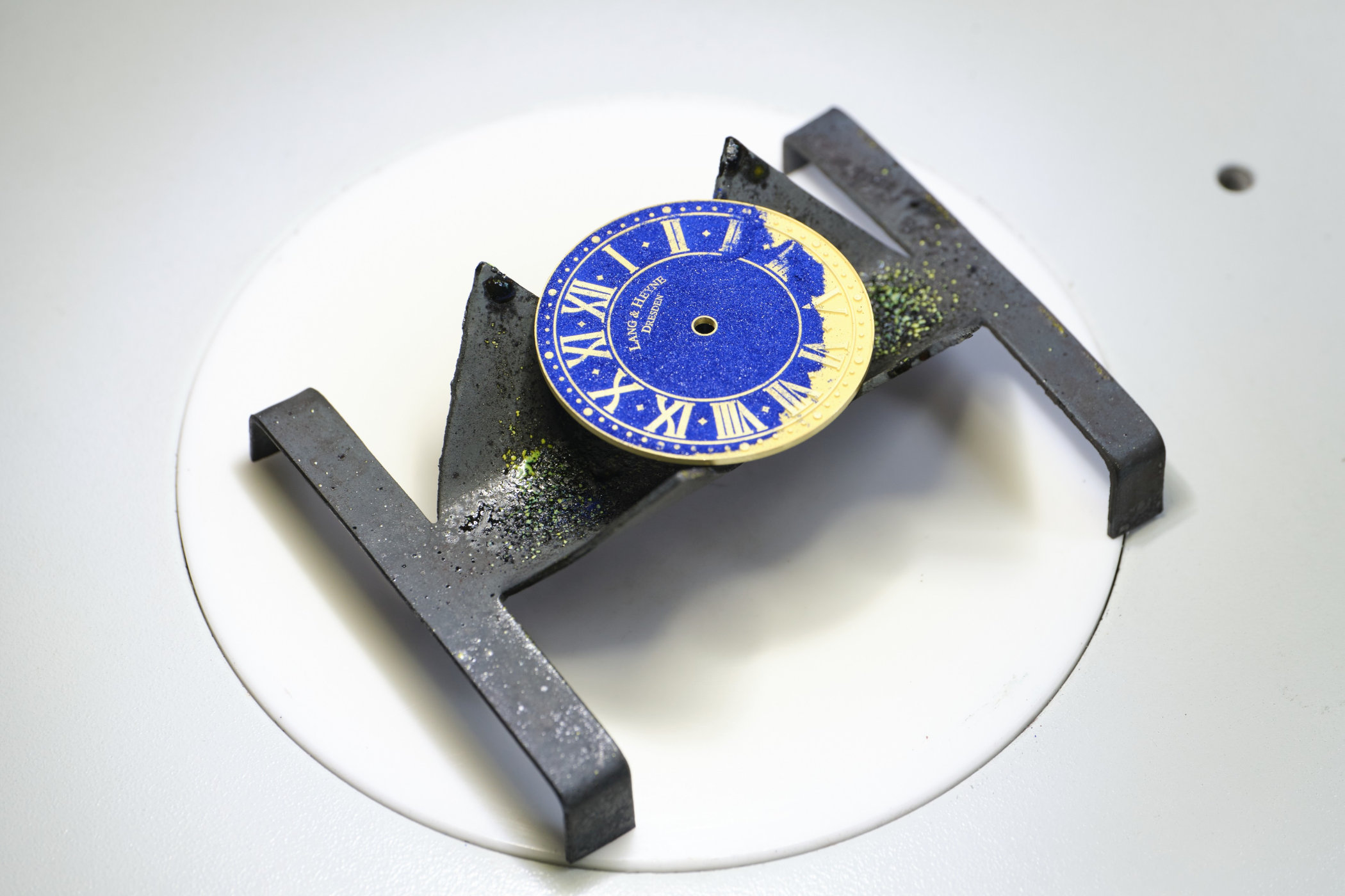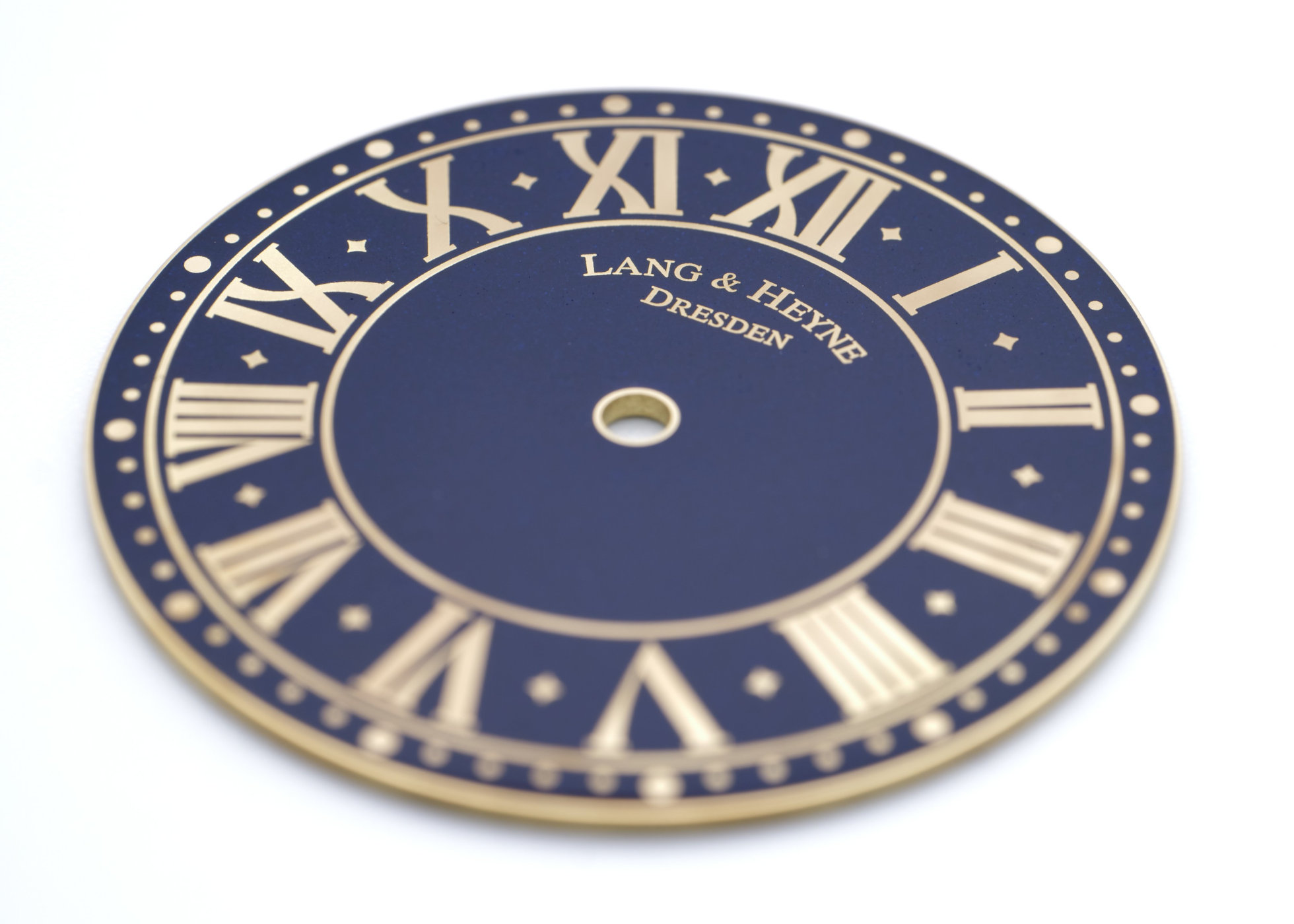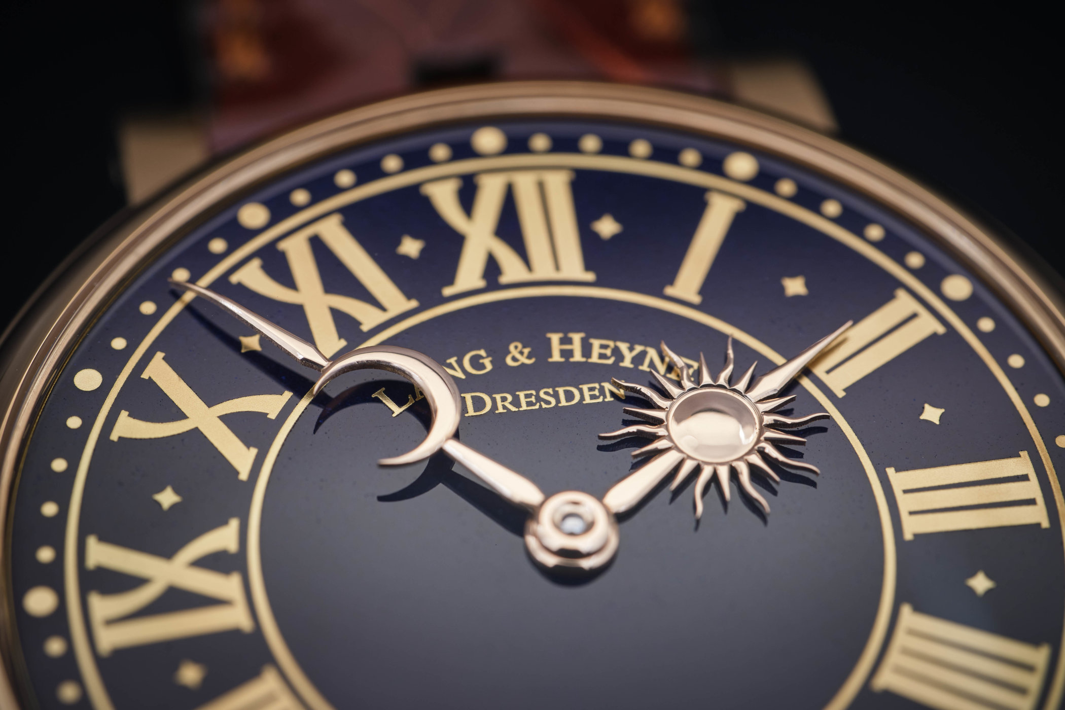 The design of the dial is a direct copy of the face of the clock tower in Glashütte. The deep, almost velvety-blue tone is made in champlevé enamel set over an 18k rose gold base dial. With this technique, a craftsman carves out a design into a base, then fils it with enamel powder and bakes it in a kiln while leaving the original metal exposed. Circling the dial are twelve Roman numerals, encircled by a dotted minute track. The numerals from 9 to 12 have a swirling “X”, which is also present on the original wooden dial. The sun-and-moon hour and minute hands are carved by hand and add a touch of romantic drama to the watch. The last element on the dial is the Lang & Heyne logo.