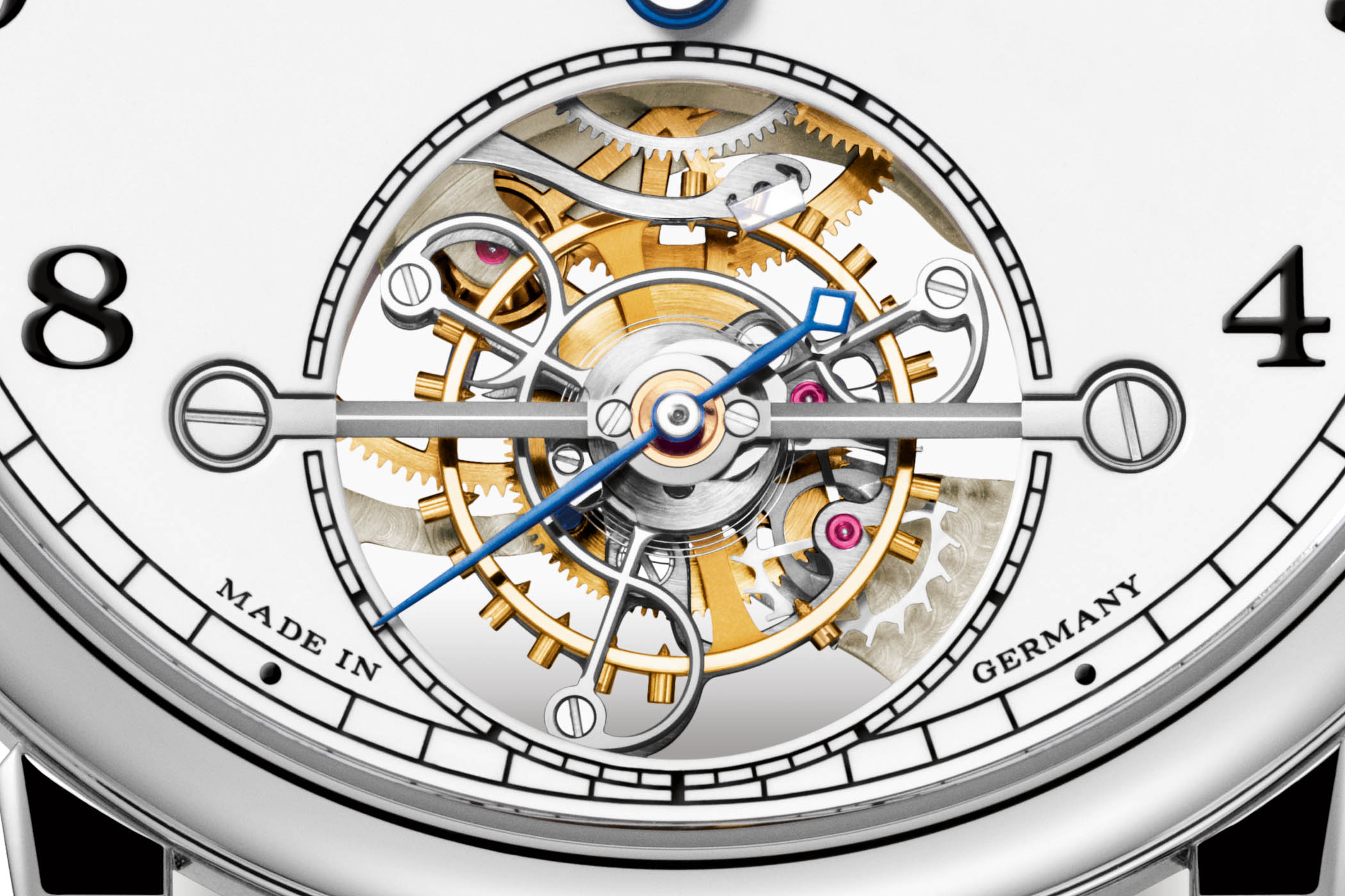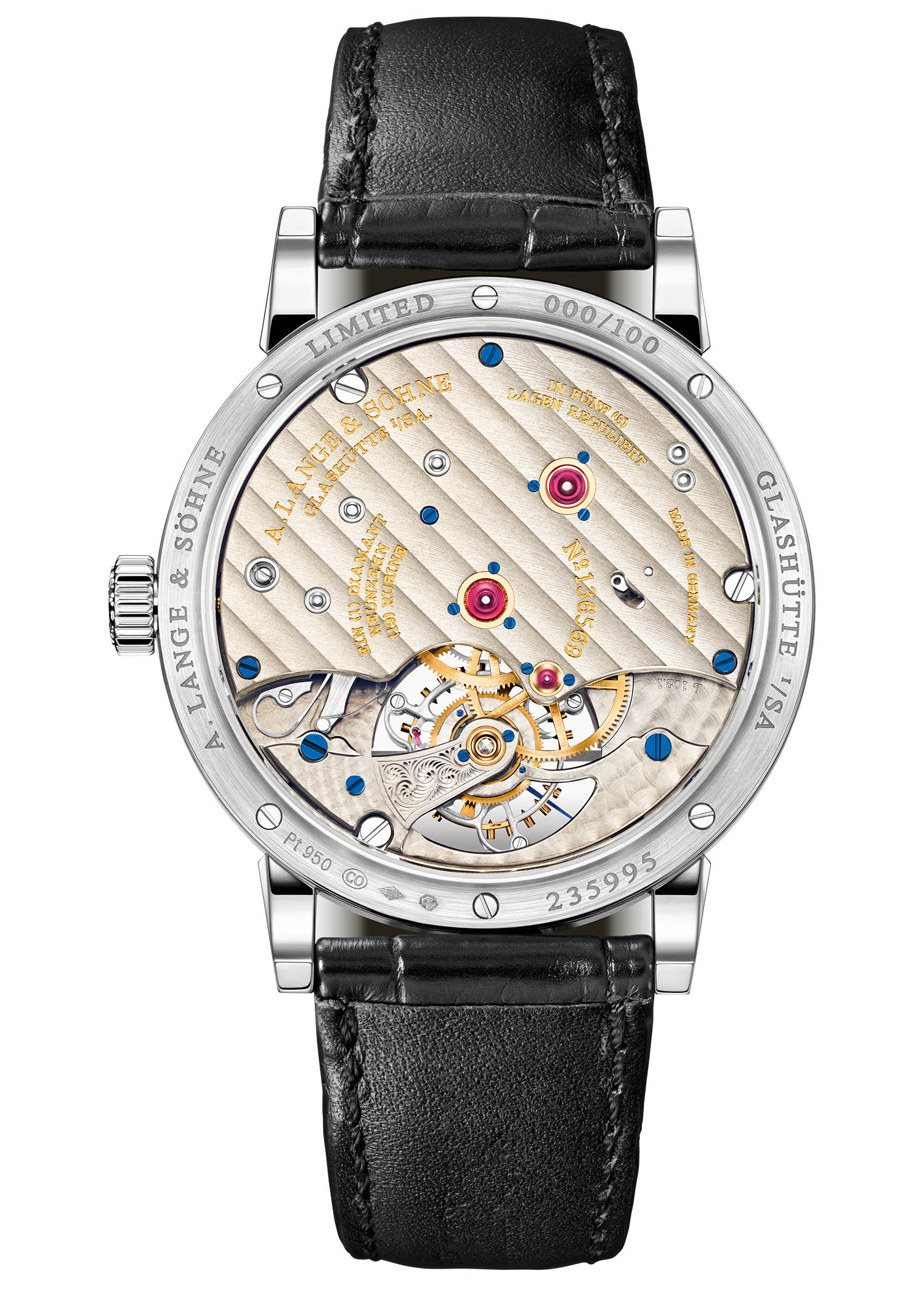 The movement is visible through the sapphire caseback. Apart from the technical points explained at the beginning of this article, this Calibre L102.1 is also superbly decorated with all the usual Lange features: jewels in screwed gold chatons, thin stripes on the bridges, polished bevelled angles, hand-engraved cock bridge and even a diamond endstone for the tourbillon’s axis. This hand-wound movement ticks at 21,600vph and can store up to 72 hours of energy.