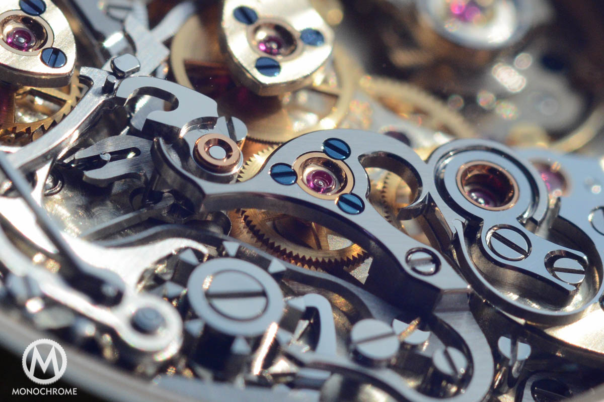 Besides the abundant decoration and finishing of the movement, there’s another factor that determines how much time it costs before such a movement is ready to be deliver to the client. Every movement coming from the manufacture has been assembled, extensively tested, disassembled and assembled again. In this complex movement there are quite a few rockers, levers and cams, and of course a 8 pillar column-wheel. Every of these moving parts has to perfectly touch the other part and everything has to be perfect. The power with which the moving parts touch each other, the height in which they make contact and the length of each part is also extremely important. When all parts are in one plane level, it would not be that complex. Hhowever many parts have one pivoting point, and there’s always a tiny, tiny, bit of play that has to be out-ruled by the watchmaker. The watchmaker working on such a movement has to be a very experienced and skilled watchmaker and getting everything perfect simply takes time. This is artisan watchmaking and has nothing to do with mass-produced mechanical movement that are widely used in the watch industry.