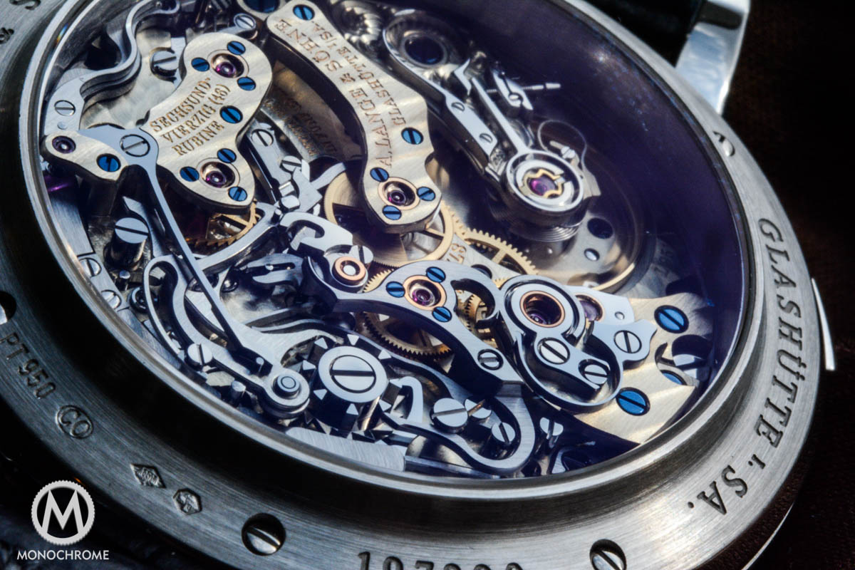 The Datograph’s movement is calibre L951.6 that comprises 451 parts in total. All bridges and the main plate are crafted from untreated German silver, which over time, gets a bit of patina that adds a warm yellowish. The entire movement is lavishly finished by hand. Bridges are angled and the angles are polished, the flat surfaces are adorned with Glashütte striping (the German equivalent of côte de Genève striping) and jewels are set in gold chatons that are fixed by three heat blued screws. The steel parts – rockers, levers, cams and the column-wheel – are also finished by hand, and feature a straight-graining on the flat surfaces and angled and polished edges.