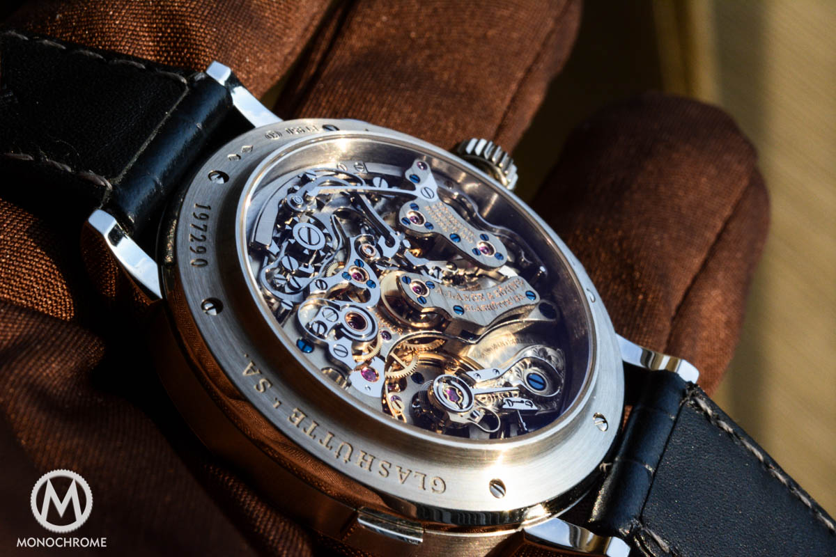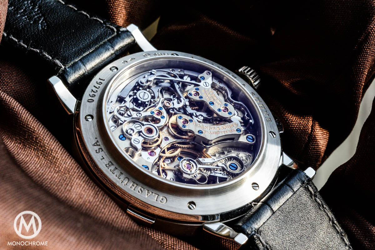 The case-back, with sapphire crystal, protrudes so there’s enough space for the tremendously beautiful “landscape” of bridges, levers and cams. It looks like this sapphire crystal has also been treated with anti-reflective coating, and when looking at the movement you often get the feeling there’s no crystal at all.