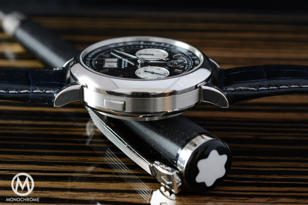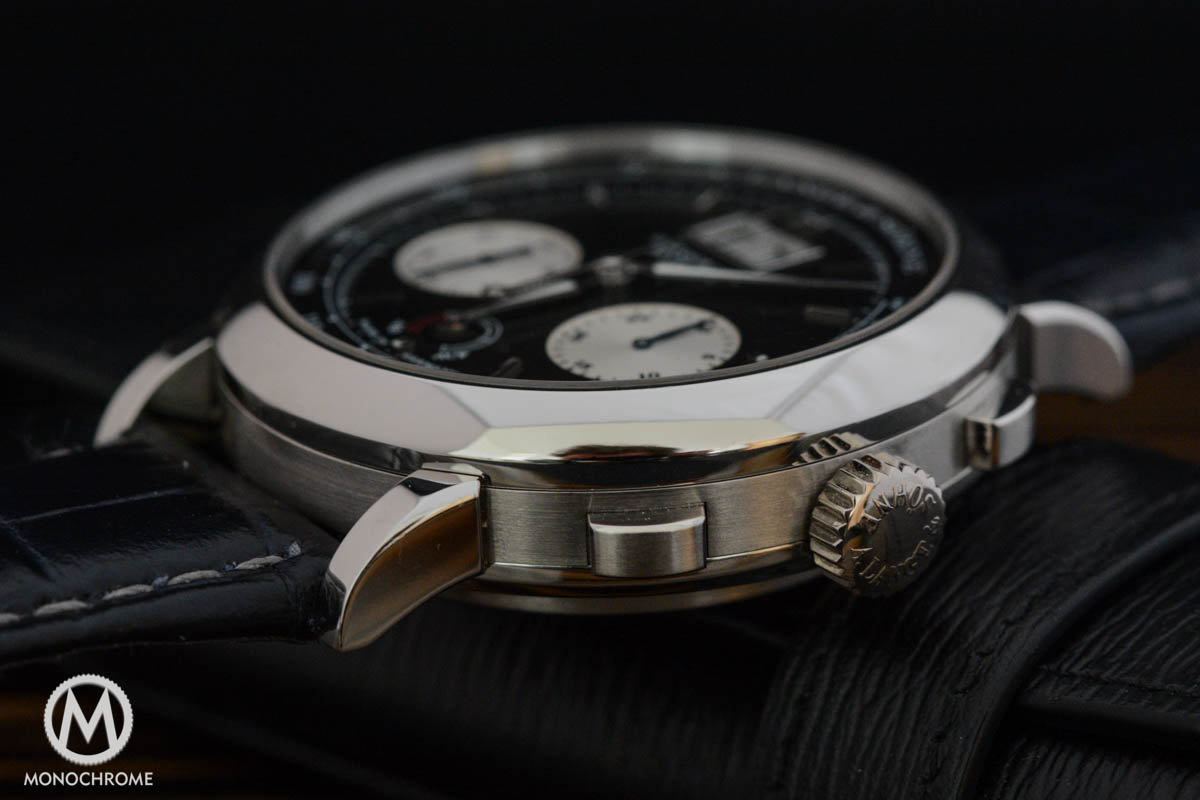 What remains the same is the magnificent three-dimensional „landscape” of bridges, levers, cams, jewels and a column-wheel. Also the characteristic dial layout, with rather unusual positioning of the sub dials, and the chronograph’s instantaneous jumping minutes and flyback function remain the same. The Dato can still be referred to as a super-chrono, that in terms of movement architecture comes extremely close to its big brother, the Double Split. With the added „outsize” date and the smaller diameter it’s more comfortable on the wrist and better suited for daily wearing, compared to its big brother.