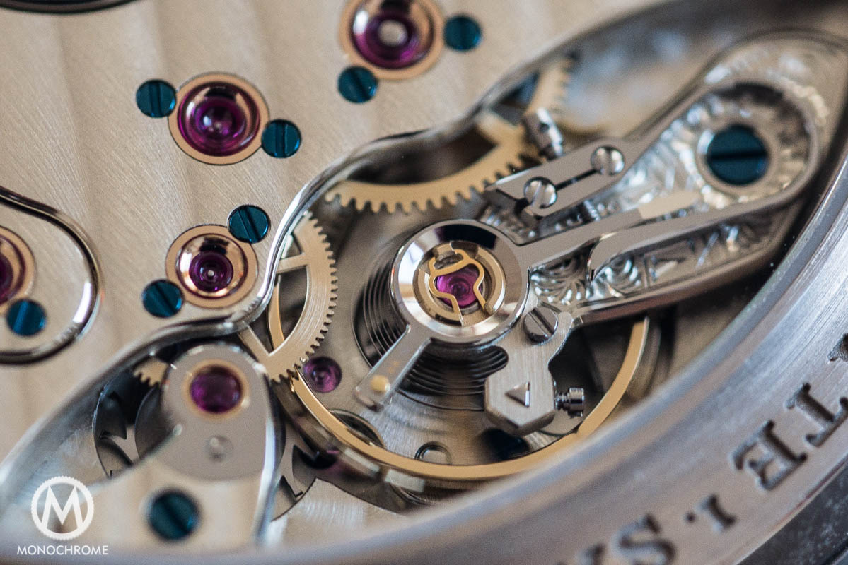 Now on to the always impressive Lange calibre L901.0. This in-house movement is developed, designed, manufactured, finished, assembled, and regulated by A. Lange & Söhne in their manufacture in Glashütte. The movement has been finished to the very highest standards, and features a three-quarter plate with Glashütte ribbing (the German equivalent of côte de Genève), jewels are set into gold châtons and secured with heat-blued screws, edges have been angled and polished by hand, and the balance cock is engraved by hand.