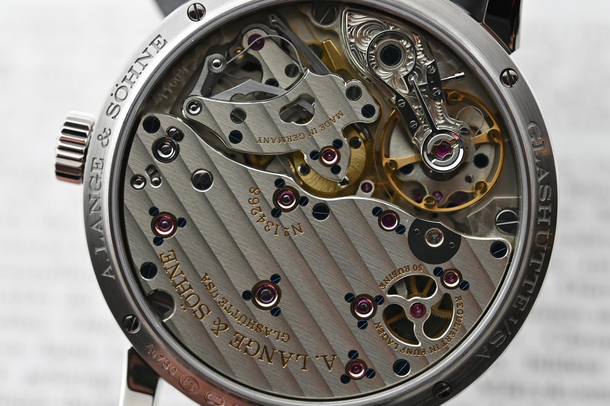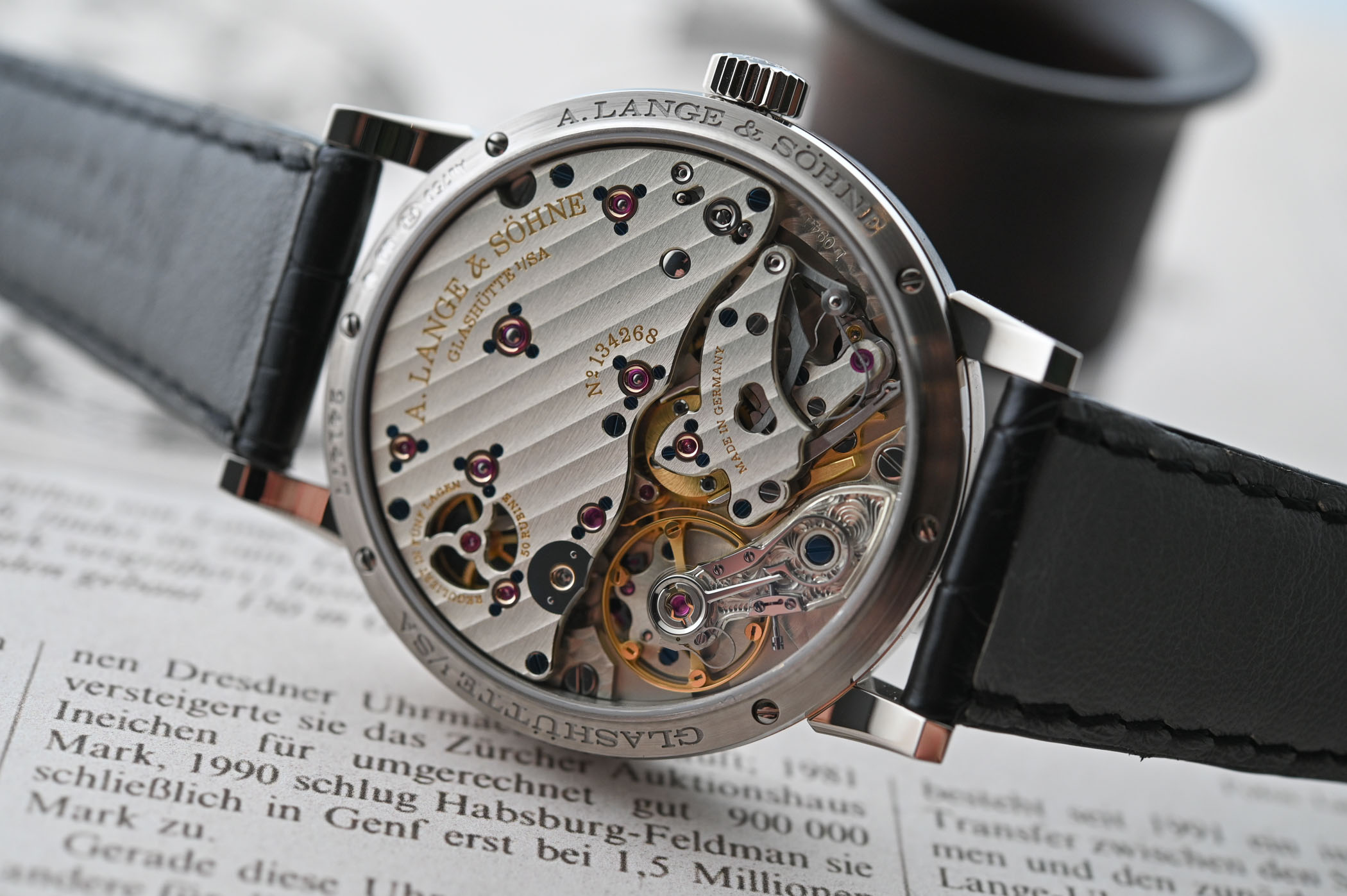 The sapphire caseback reveals the large manual-winding movement (33.6mm x 6mm), calibre L094.1, with the classic three-quarter plate. Decorated and assembled by hand, the finishes are in line with Lange’s exacting standards with bridges made from German silver and decorated with Glashütte ribbing, a hand-engraved balance cock with a floral design and eight screwed gold chatons. Comprised of 390 parts, the in-house balance spring oscillates at 21,600vph and the functions – hours, minutes, jumping seconds with stop seconds and zero-reset function, end-of-power indication – will keep optimum time for stretches of up to 42 hours.