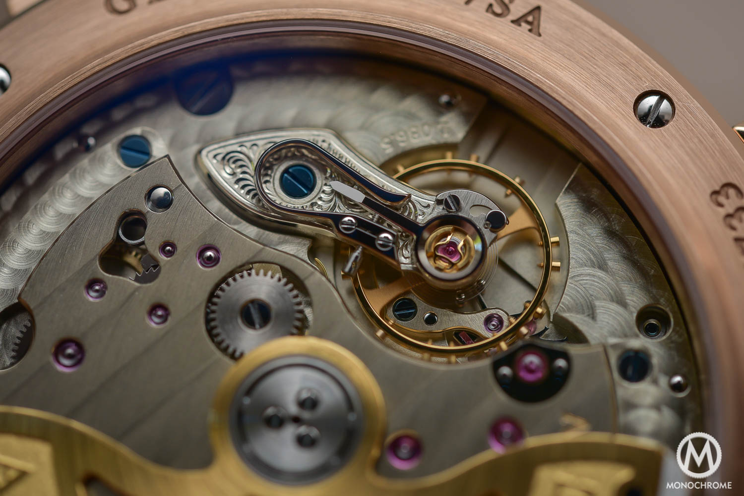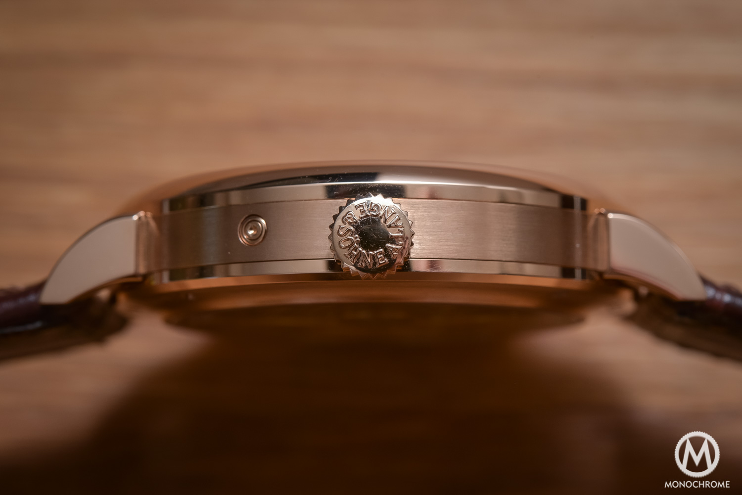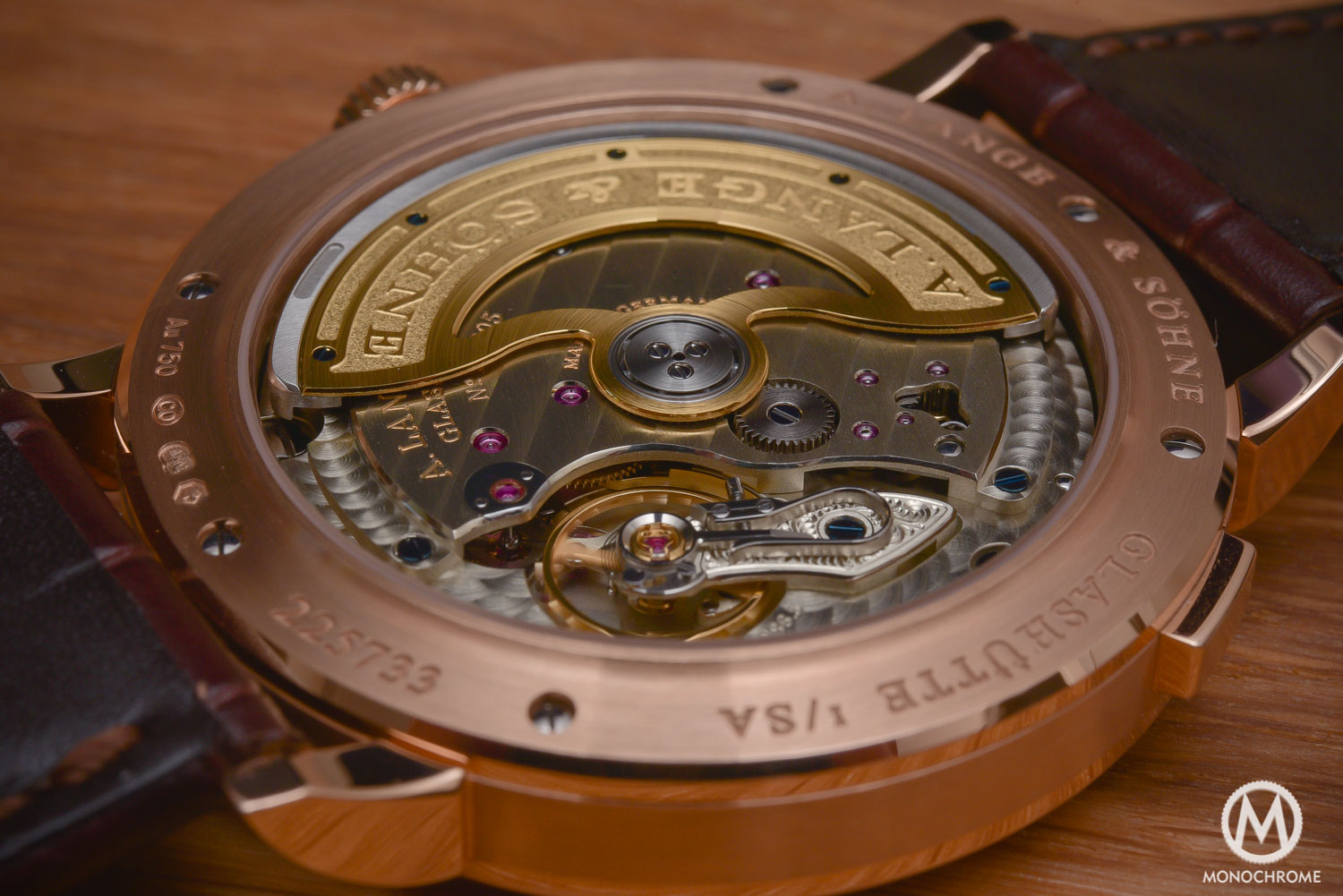 What about the case itself? Well, as usual with A. Lange & Söhne, the execution is above expectations. It is neat, precise, perfectly adjusted, polishings are delicate… Some nice craftsmanship for sure. The case has the traditional bombé bezel, polished, the usual satined flanks and a caseback that is polished on its edges – creating a contrast with the satined flanks – and that is brushed on the lower surface. I always loved this brushed caseback. I know it is a detail, but I think it is a wiser choice than the previous polished surfaces, because it gives the back an even more technical look (and God knows how technical Lange watches look on the back side) and it prevents from all possible traces that the watch has when worn (yes, casebacks, even on a Lange, are dirty).